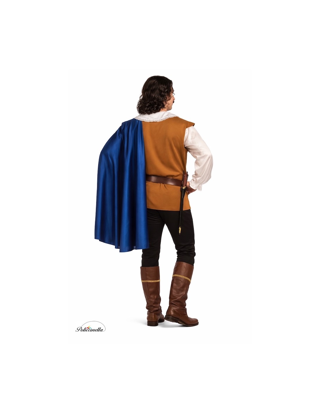 Este disfraz de mosquetero incluye un chaleco integral que combina la apariencia de una camisa blanca debajo, confeccionado en raso con un cuello típico de la época, adornado con puntillas y mangas elásticas en el bajo para mayor volumen, creando el efecto de dos prendas en una sola pieza. El chaleco, en punto de máquina foanizado, presenta un dibujo impreso frontal y hombreras exteriores. Incorpora una capa de raso, unida al chaleco con velcro. Los pantalones negros, en punto de máquina, tienen goma elástica en la cintura para mejor ajuste. Se añade un cinturón marrón oscuro en poliéster tejido sobre fieltro, con aspecto de cuero y hebilla rectangular dorada funcional, más la caña de las botas, de mismo tejido con pasamanería dorada para un toque distintivo.