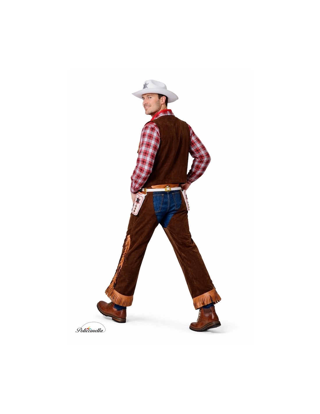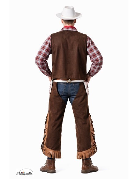 Clásico disfraz western con camisa de poliéster de tacto similar a mantelería y chaleco incorporado que simula dos piezas. El chaleco combina poliéster amelocotonado y suave punto que imita cuero rojo, con flecos reforzados para mayor peso y forma. Incluye cinturón con goma y velcro, del que parten dos cartucheras con flecos, también en poliéster amelocotonado y decoradas con piezas plásticas que parecen metal. Completa el conjunto una pañoleta en punto suave para anudar al cuello. Confección cuidada y tejidos cómodos con acabado de calidad.