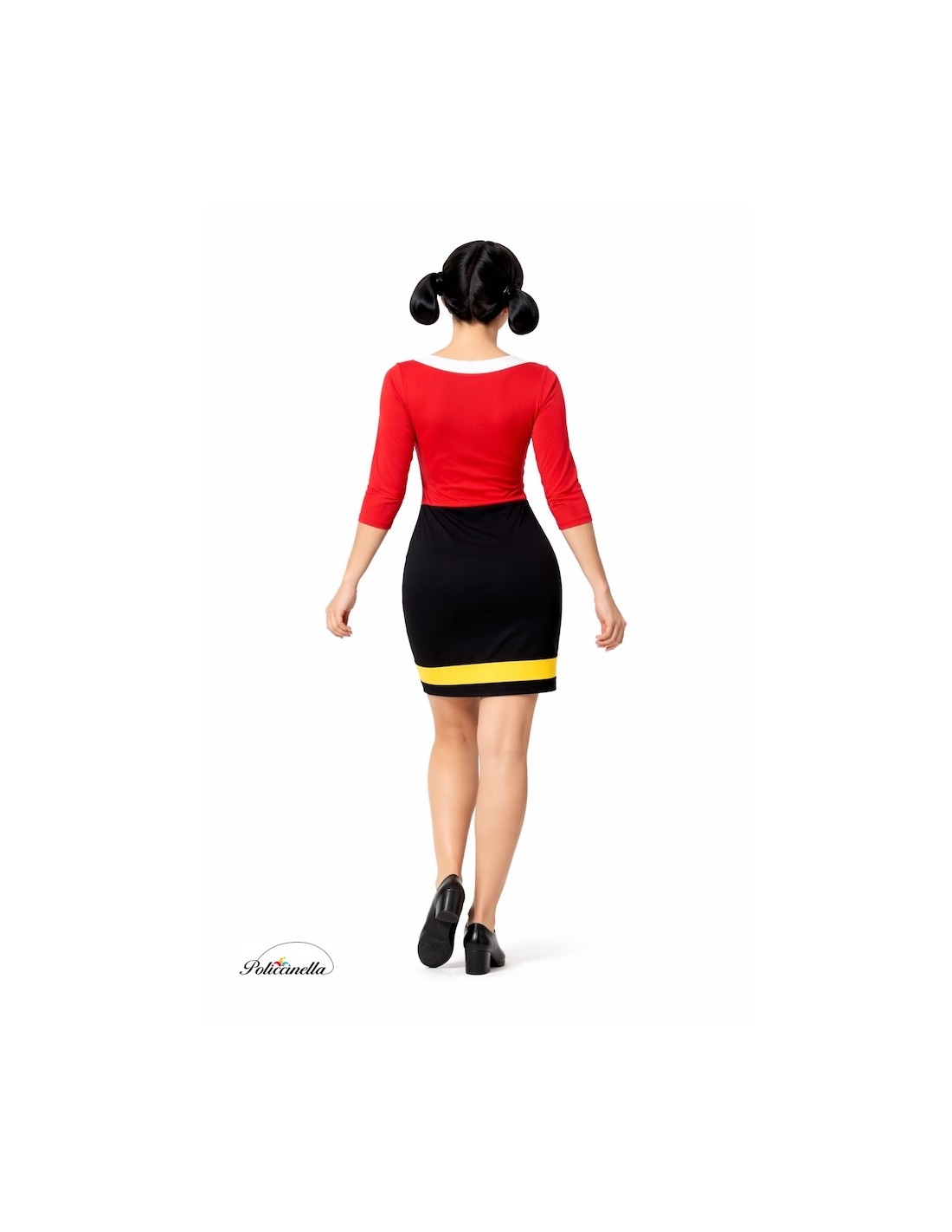 El disfraz, que incluye gorro/peluca, está compuesto por un vestido confeccionado en suave punto de máquina semielástico. El vestido presenta un corte recto y un cierre al cuello en la parte trasera con velcro. El cuello, elaborado en suave poliéster, está foanizado para proporcionar mayor estructura y forma. El bajo de la falda está decorado en la parte delantera con una banda de color amarilla. El disfraz incluye también el gorro/peluca, confeccionado en poliéster espumado para preservar su característica forma .