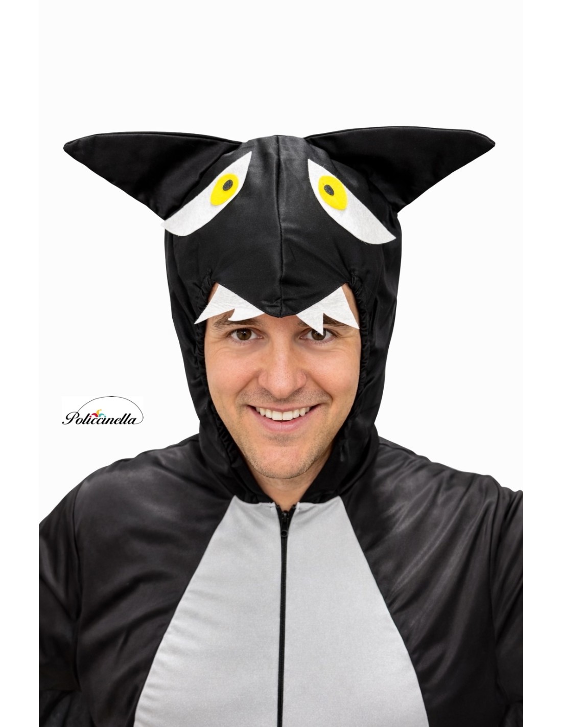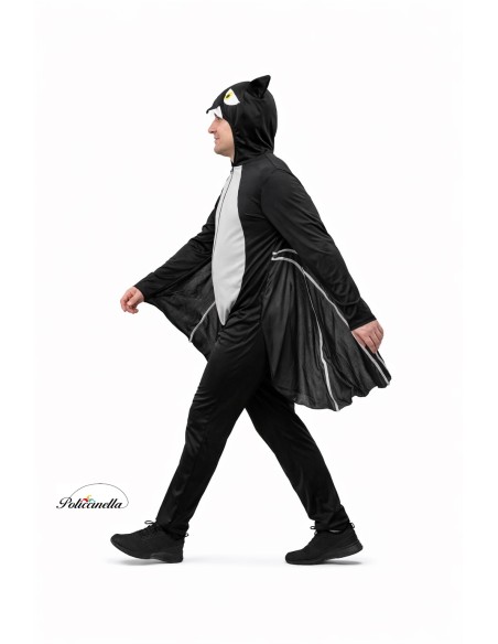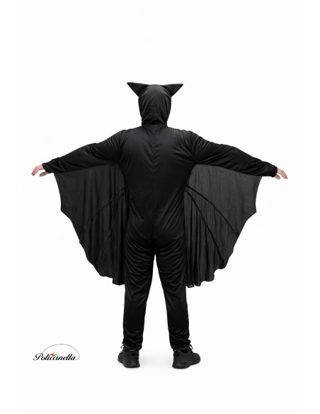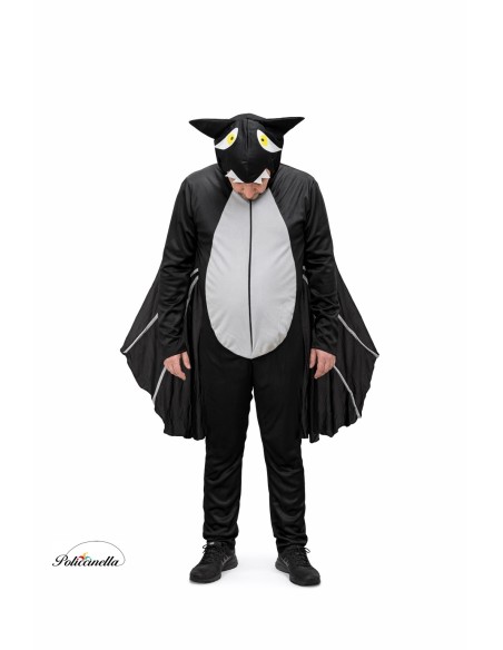 Este original disfraz consiste en un mono de cuerpo entero confeccionado en suave punto de máquina semielástico con capucha incorporada. La capucha está revestida con una tela de filtro para mayor consistencia y estructura. Incorpora elástico alrededor de la cabeza para ajustarse y tanto los ojos como los colmillos están adheridos a la tela, siendo de tupido filtro. El mono se cierra por delante con cremallera invisible y el frontal está confeccionado en poliéster amelocotonado. De las mangas parte una tela de punto de máquina que recorre los laterales del traje, formando las alas del murciélago.