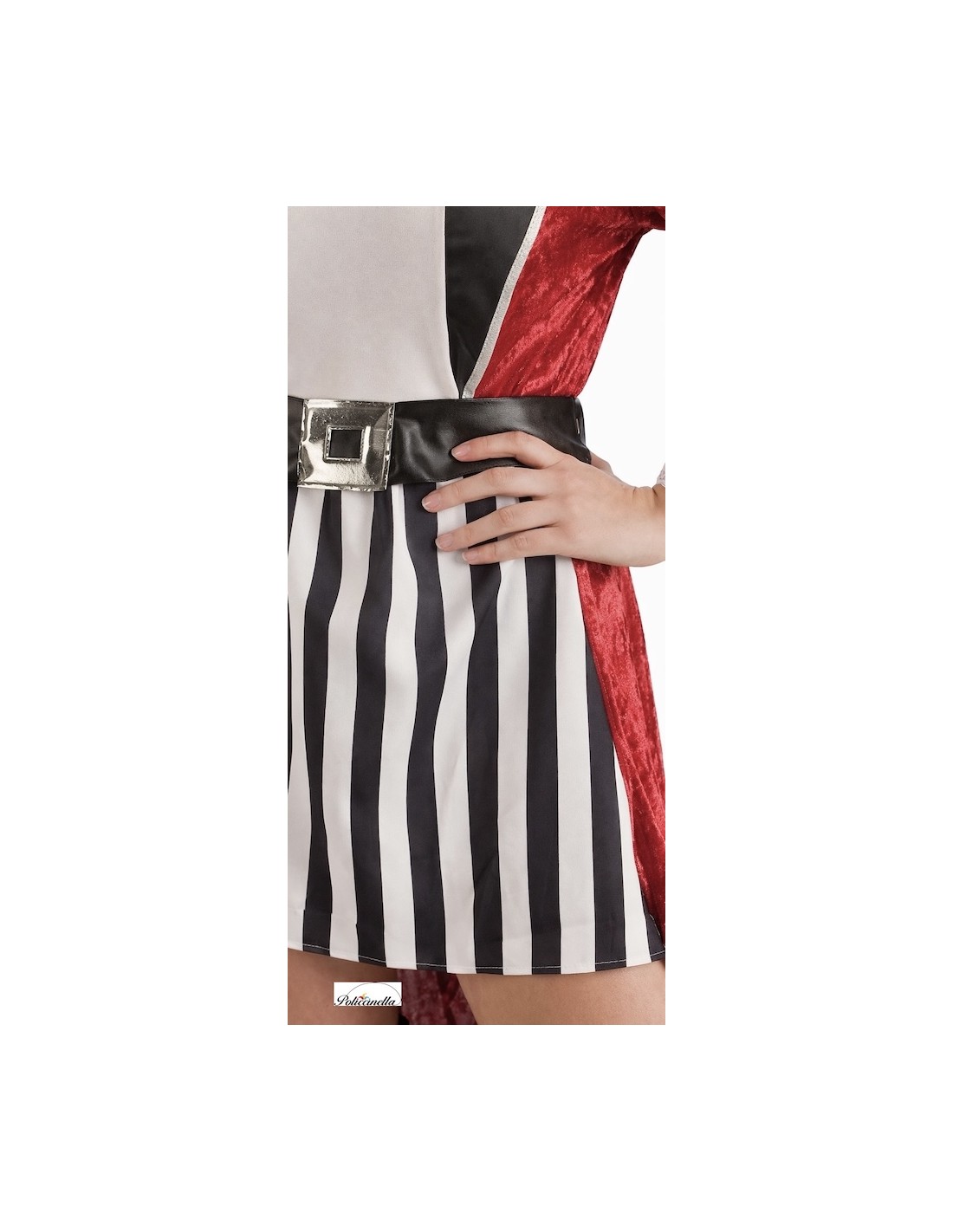 ¡Navega los mares con estilo y actitud! Vestido en terciopelo color vino con solapas de poliéster sobre filtro que imita cuero negro, decoradas con cintas plateadas al estilo levita. Las mangas llevan cinta brillante y acaban en puntilla delicada con efecto acampanado. La parte frontal simula una camiseta integrada, con encaje en el pecho y falda de rayas en poliéster tupido y suave. Incluye cinturón con hebilla decorativa y Pañuelo para el cabello con carabela pintada.