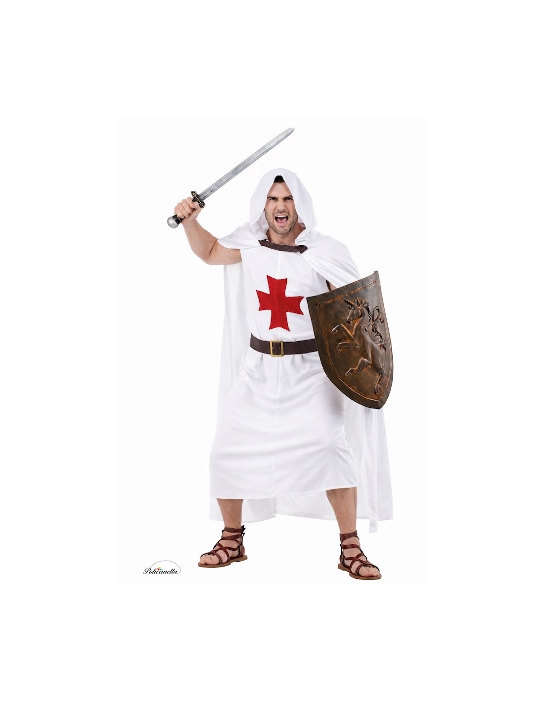 Disfraz de templario compuesto por túnica larga tipo tabardo con capa integrada, confeccionada en poliéster de alta densidad para mayor cuerpo y durabilidad. La capa, unida a la estructura, incluye aberturas laterales que permiten el paso de los brazos, simulando una prenda doble. Incorpora capucha fija en el mismo tejido. Decorado al frente y al dorso con cruces templarias aplicadas en poliéster de tacto melocotón. El cuello se cierra con sistema frontal de fácil colocación. Incluye cinturón en fieltro recubierto símil cuero con hebilla plástica decorativa efecto metálico.