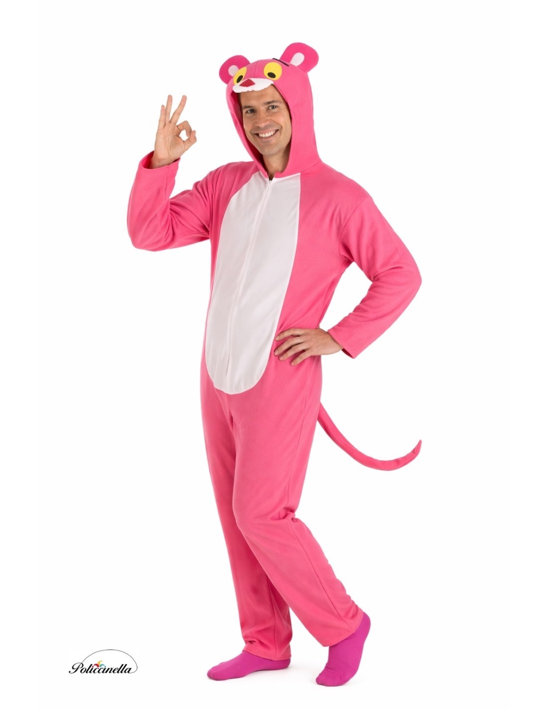 Este disfraz combina comodidad, suavidad y un diseño de gran calidad. Se compone de un mono largo en poliéster de tacto amelocotonado, con cremallera frontal invisible y capucha integrada. La joya del disfraz es su capucha, confeccionada sobre una estructura esponjada que mantiene su forma perfecta: hocico y orejas espumadas aportan volumen tridimensional, mientras que los ojos, en tupido fieltro, completan la expresión característica del personaje. El rabo, sujeto con velcro ( en tallas infantiles) cumple con la normativa de seguridad y garantiza practicidad y resistencia. Suave, cálido y muy gustoso al tacto, este traje es ideal para desfiles, comparsas y fiestas, listo para robar sonrisas y ser el centro de atención en cualquier evento.