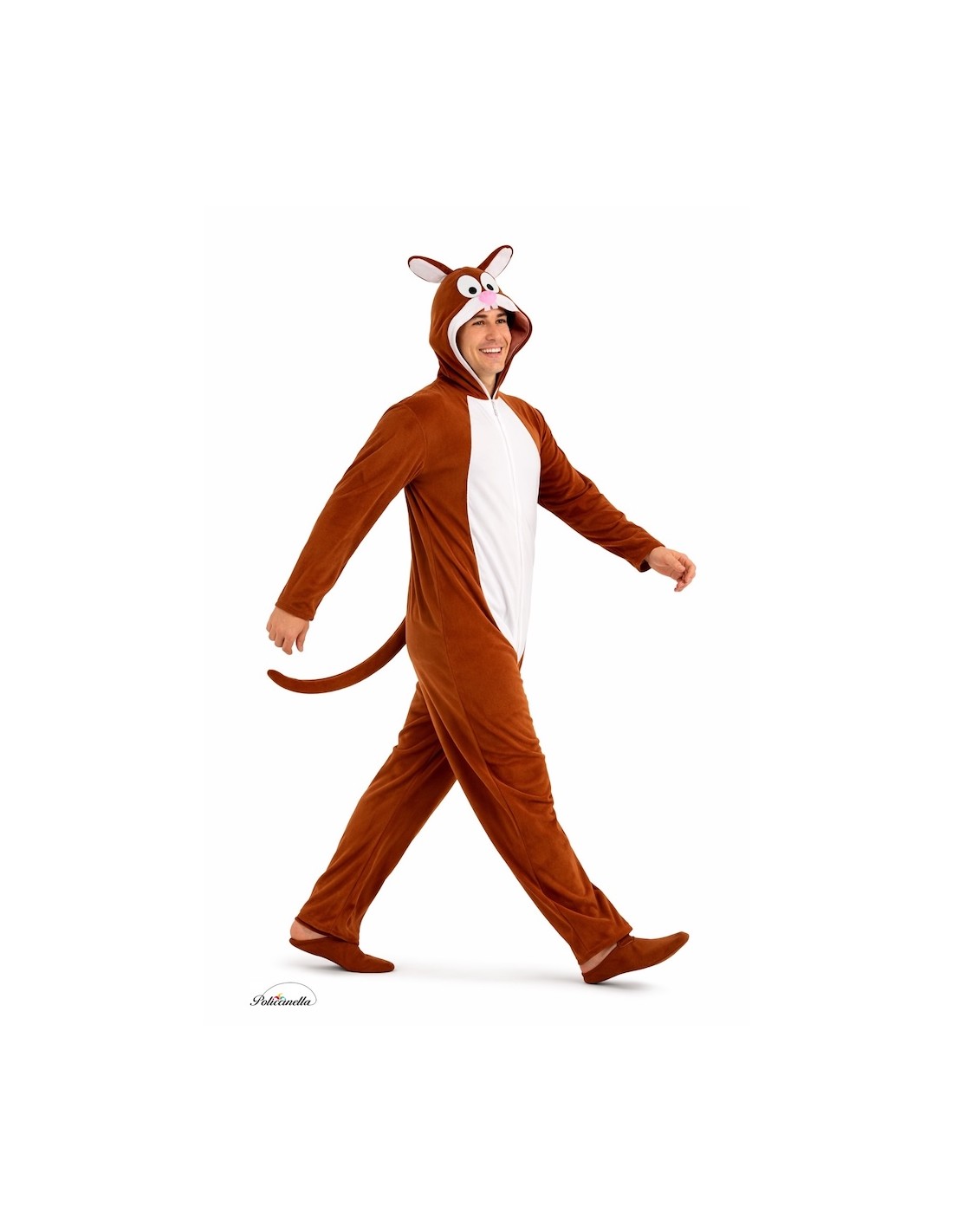 Tierno y divertido disfraz de conejo, con mono de cuerpo entero confeccionado en poliéster de tacto amelocotonado y cremallera invisible al frente. La capucha integrada, foanizada para mantener su forma, luce ojos y dientes en tupido fieltro, orejas con relleno rígido para que se mantengan erguidas y nariz suave y esponjosa adherida al tejido. En la parte trasera, un coqueto pompón de borreguillo simula el característico rabito. Ligero, cómodo y lleno de encanto.