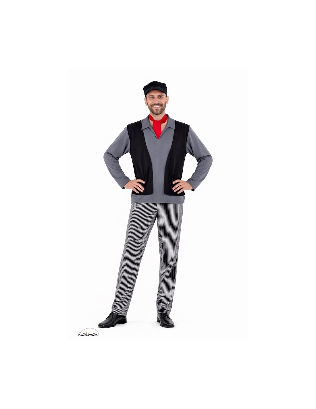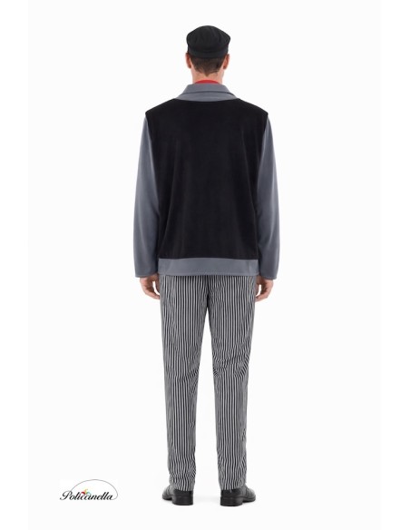 Completo disfraz de deshollinador con camiseta de suave punto de máquina semielástico y chaleco integrado en tela amelocotonada, dando el efecto de dos prendas en una. Pantalón a juego con elástico en la cintura para mayor comodidad y pequeño bolsillo interior. Incluye pañuelo al cuello y gorra, ambos de tacto amelocotonado; la gorra está fruncida con visera esponjosa para mantener su forma. Un conjunto cómodo y lleno de detalles para un look auténtico.