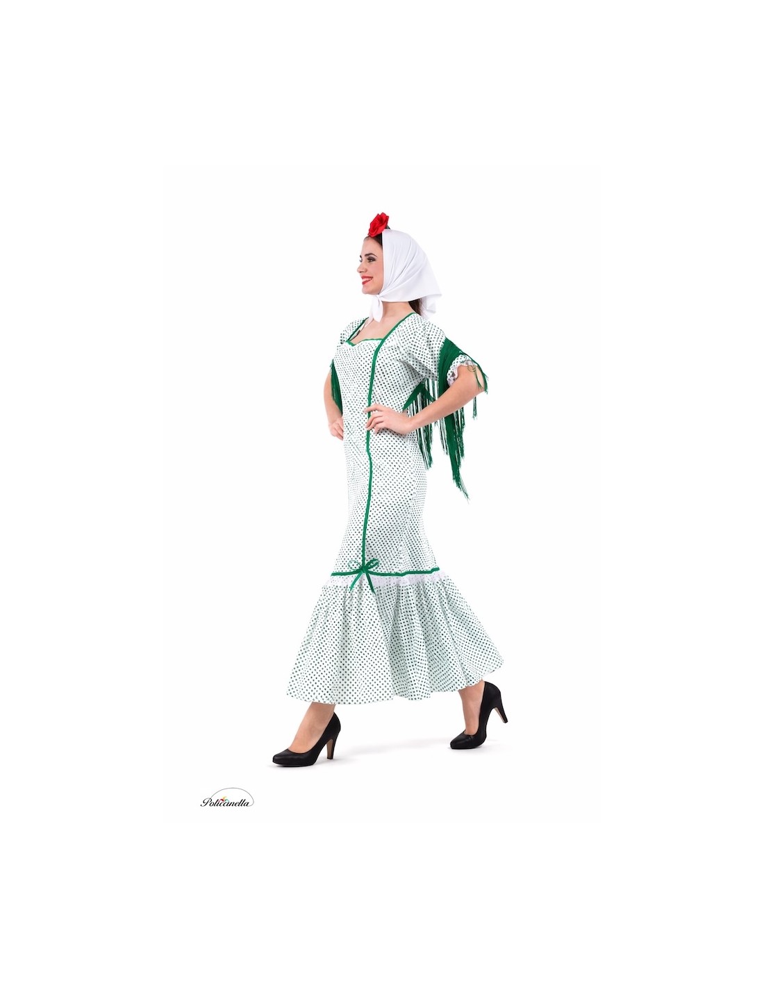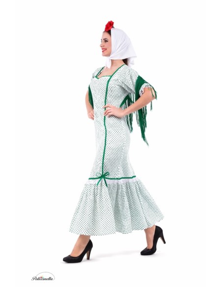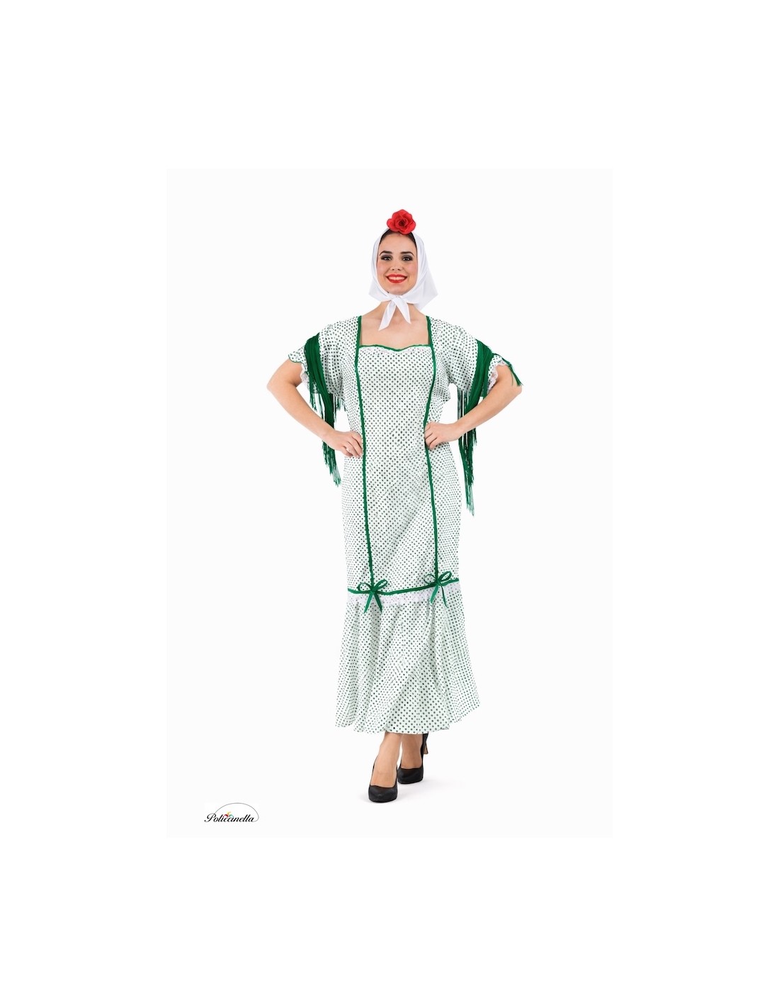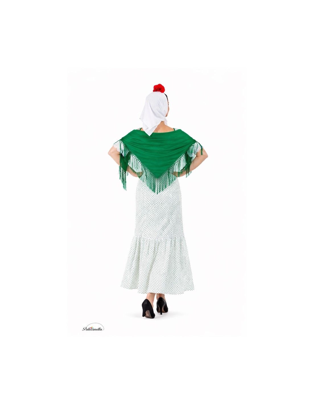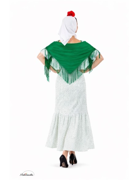 Tradicional y castizo vestido de chulapa, confeccionado en suave raso con cuello cuadrado y cierre de velcro en la nuca. Elásticos en espalda y laterales realzan la figura con comodidad. Decorado con cintas y lazos de raso a tono con los lunares y un delicado encaje. Las mangas llevan elástico para un ajuste perfecto. Incluye pañoleta para la cabeza y el clásico mantón en suave punto de máquina con flecos, para completar este encantador conjunto madrileño.