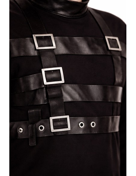 Completo y espectacular disfraz con camiseta de tupido y suave poliéster, cierre trasero de velcro y decorada con las icónicas correas y hebillas del personaje. Las correas, en poliéster efecto cuero con base de fieltro para mayor cuerpo, y las hebillas, en plástico que simula metal, aportan realismo. El pantalón, en el mismo tejido, con goma en la cintura, bolsillo interior y detalles a juego. Incluye las emblemáticas manoplas en raso plateado foanizado, con velcro en las muñecas.