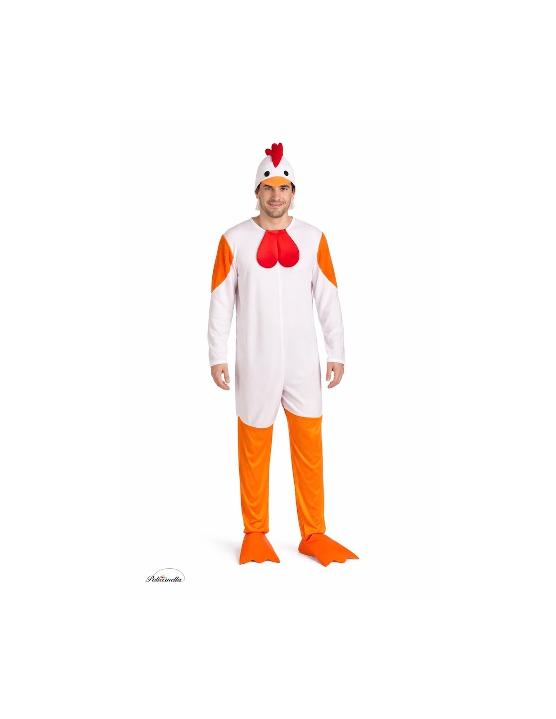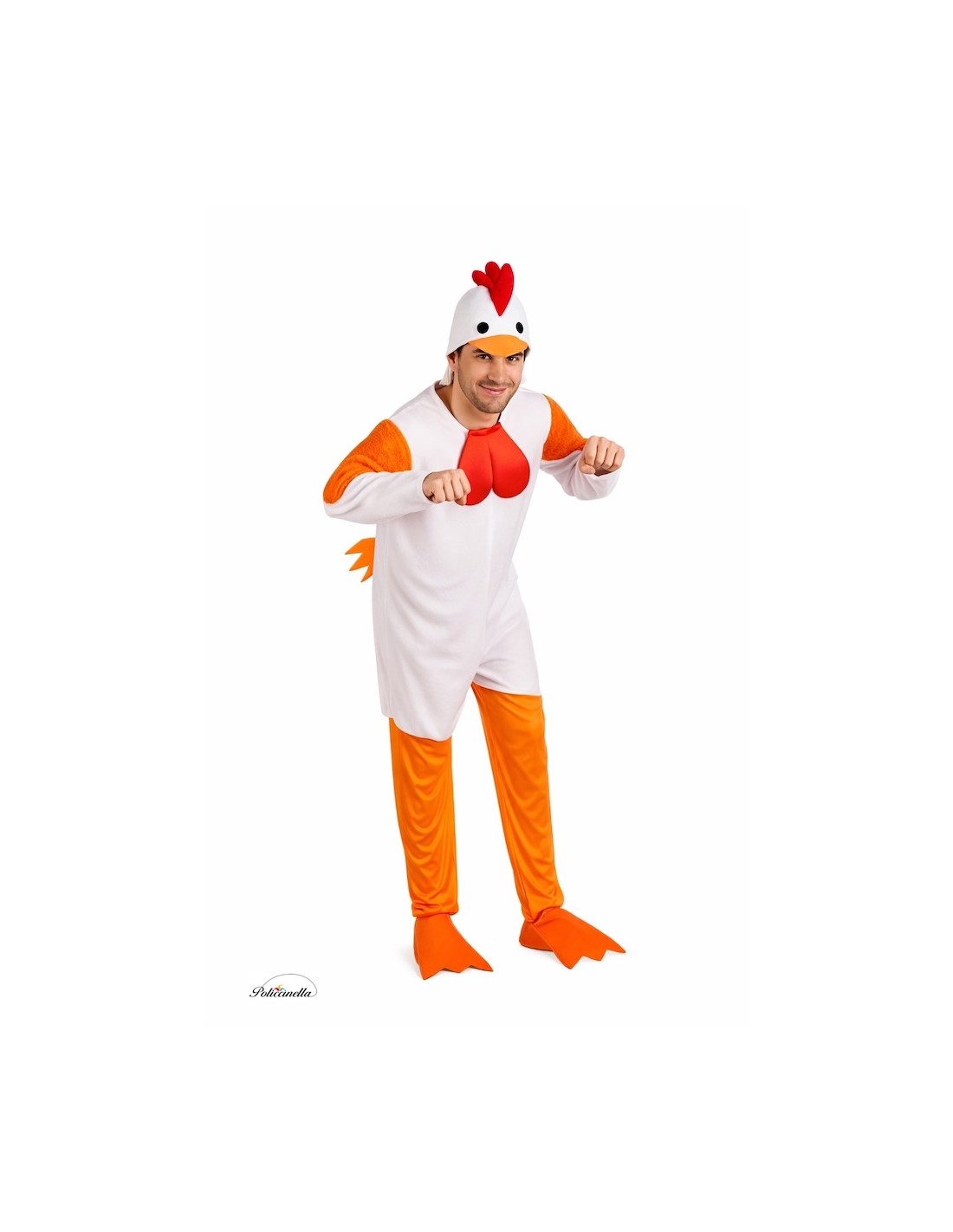 Este disfraz, elaborado con un mono de poliéster suave y agradable al tacto, incluye una capucha integrada confeccionada en poliéster foanizado para mayor estructura y evitar deformaciones. Los ojos están adheridos a la prenda con un filtro tupido. El cierre frontal es de cremallera invisible y a la altura del cuello se encuentra una pieza de velcro para sujetar la característica nuez, confeccionada en raso foanizado al igual que la cola. Los hombros están cubiertos por una pieza de poliéster rizado, muy agradable al tacto, que simula las plumas. Finalmente, se incluyen las patas, confeccionadas en raso foanizado, con ajustes elásticos para sujetar a los pies.