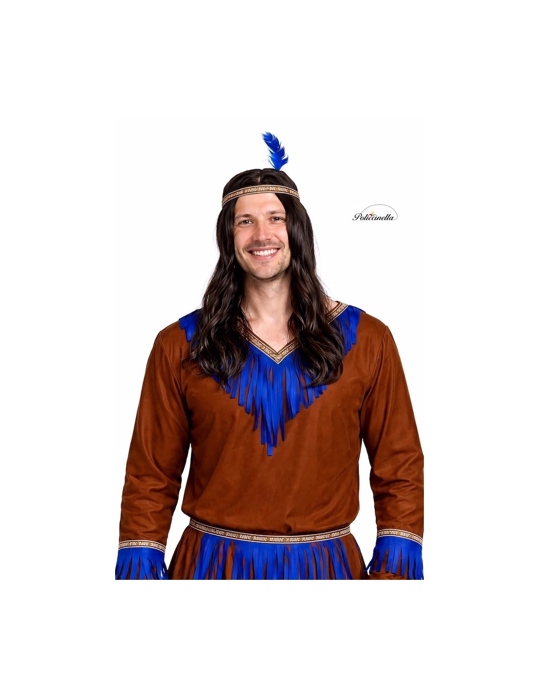 Auténtico y vistoso disfraz de indio, ideal para destacar en cualquier fiesta temática. Incluye camiseta de poliéster de tacto amelocotonado, con cuello pico, decorado con cinta de motivos étnicos y flecos azules que también adornan las mangas. El pantalón, a juego, con goma en la cintura y bolsillo interior, lleva los mismos detalles en el bajo. Se completa con cinturón de cinta con flecos y una cinta para la cabeza con plumas decorativas, ambas ajustables con velcro. Un conjunto cómodo, lleno de color y tradición.