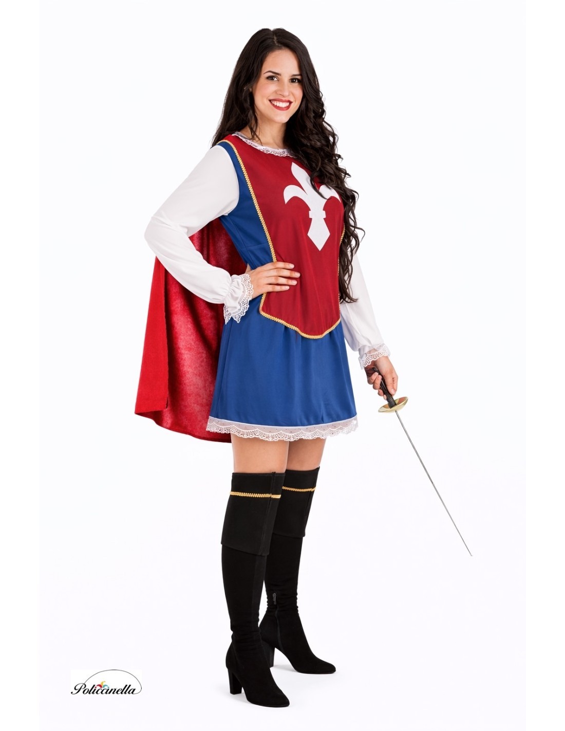 Elegante disfraz de Mosquetera que combina estilo y confort. El vestido, en suave punto semielástico, luce una pieza frontal color vino de tacto amelocotonado que simula una armadura con escudo, unida a los hombros y ajustable mediante lazada trasera. Cuello y mangas están decorados con pasamanería y encaje, rematando en puños con goma para un ajuste perfecto. Desde los hombros cae una capa aterciopelada color vino, fijada con velcro para mayor comodidad. El conjunto se completa con cañas de botas foamizadas y decoradas con fina pasamanería, aportando un toque noble y distinguido digno de toda mosquetera.