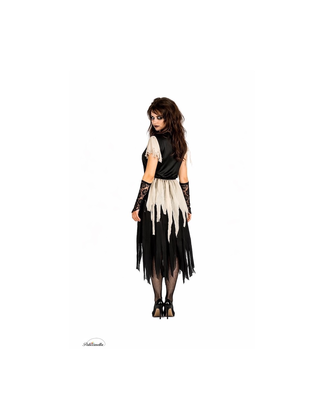 Vestido confeccionado en suave punto de máquina semielástico, con un corpiño efecto cuero integrado sobre base de TNT que aporta estructura sin restar comodidad. Destaca el cierre frontal en zigzag con cinta de raso y el elegante cuello cuadrado con goma en el pecho, decorado con encaje para un toque refinado y misterioso.Las mangas con goma están adornadas con jirones suaves y vaporosos, que se repiten en la falda fruncida para dar un efecto etéreo y oscuro. Toda la prenda está pensada para ser ligera, muy cómoda y fácil de llevar durante horas.Incluye guantes de encaje delicado, con goma en el dedo corazón para asegurar su colocación, y otra goma al codo para mayor sujeción.