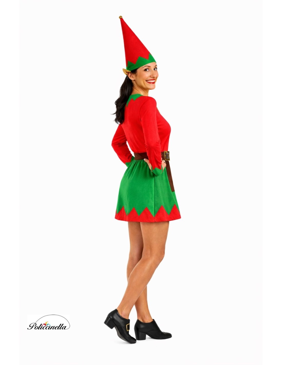 Encantador vestido en punto de máquina semielástico, suave al tacto y con cintura fruncida para un ajuste favorecedor. Cuello y falda en textura amelocotonada, decorados con apliques dorados en forma de botón que aportan un toque brillante y festivo. El delantal marrón, cosido a la falda, añade un guiño tradicional al diseño. Incluye cinturón de fieltro con hebilla dorada foanizada y cierre de velcro, y gorro en forma cónica con ribete amelocotonado y adorno dorado en la punta. Un conjunto de gran calidad para una elfa inolvidable.