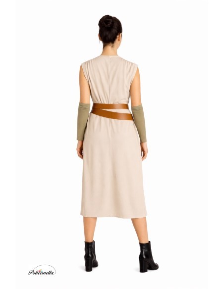 Un diseño inspirado en la aventura espacial, confeccionado en suave punto de máquina semielástico de efecto algodón que aporta comodidad y ligereza. La camiseta de cuello pico incorpora dos piezas cruzadas en la parte frontal para realzar la silueta, sujetas por un cinturón de poliéster con base de TNT que aporta estructura y se ajusta en la espalda con velcro. El conjunto incluye pantalón a juego, con cintura elástica, bolsillo interior y goma en el bajo para un ajuste cómodo a la rodilla. Para completar la caracterización, lleva cubrebrazos con elástico en codo que aseguran una sujeción perfecta. Un disfraz de gran confección, práctico y lleno de detalles que evocan fuerza y estilo galáctico.