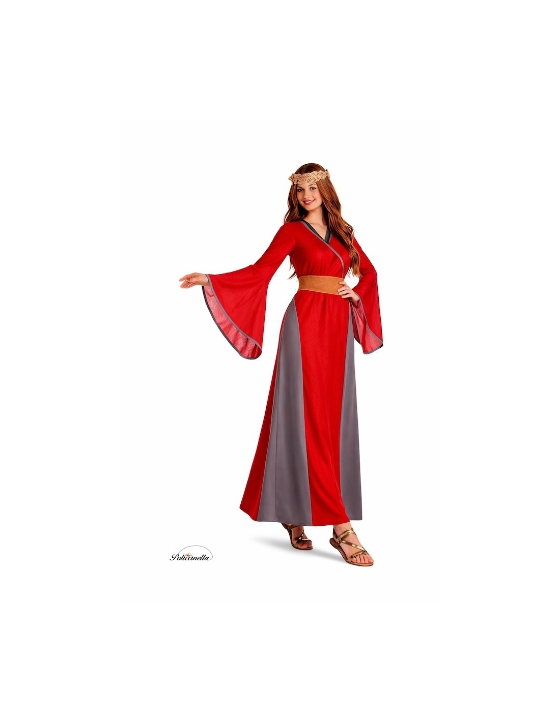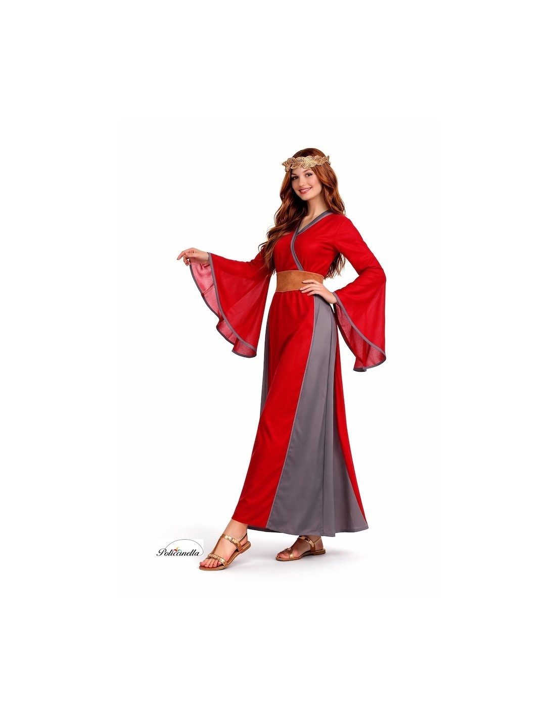 Túnica de tacto amelocotonado con cierre al cuello en la parte posterior mediante sistema de velcro. Adornada con ribetes grises que armonizan con el cuello y parte del vestido. Se completa con un cinturón confeccionado en el mismo tejido que la túnica y revestido por una redecilla dorada. El cinturón se ajusta en la parte posterior mediante lazada.