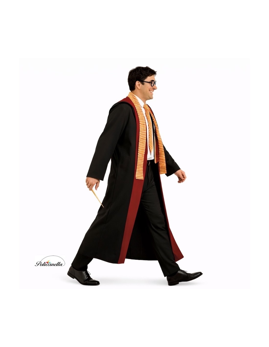 Este mágico disfraz incluye una túnica larga confeccionada en tupido poliéster, con gran capucha acabada en pico e integrada en la prenda. El borde de la túnica y la capucha está ribeteado en tejido granate de tacto melocotón, aportando contraste y distinción. Debajo, se lleva una falsa camisa de suave punto de máquina, que se ajusta con lazada en la espalda y se cierra al cuello por detrás con velcro. El conjunto se completa con una bufanda a juego y una corbata rígida, confeccionada en poliéster sobre base de TNT para aportar estructura, que se ajusta al cuello mediante cinta de raso con cierre de velcro.
