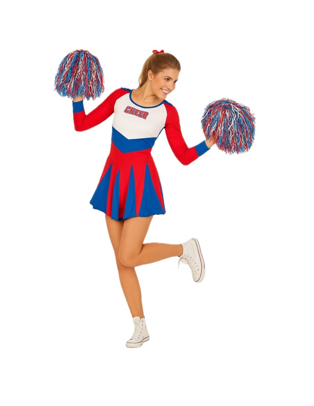 ¡Energía y estilo en cada movimiento! Este llamativo disfraz de animadora incluye un vestido corto de vibrantes colores rojo, azul y blanco, con corte a la cintura y falda de vuelo que aporta dinamismo. Confeccionado en suave punto de máquina semielástico, ofrece comodidad y libertad de movimiento para animar sin límites. El diseño incorpora la palabra CHEER en el pecho, aportando un toque auténtico y deportivo. Ideal para fiestas temáticas, desfiles o eventos escolares, su tejido ligero se adapta a la figura realzando la silueta para un resultado lleno de energía e ilusión