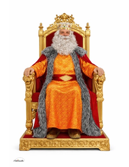 Este majestuoso disfraz de Rey Melchor transmite la grandeza y solemnidad de un monarca de Oriente gracias a la riqueza de sus tejidos y acabados. La casaca larga, confeccionada en raso rojo con delicado estampado dorado, aporta un aire regio y luminoso. Sobre ella descansa una imponente capa de terciopelo, rematada con un tupido pelo gris rizado que realza la elegancia y distinción del conjunto. El fajín de terciopelo, decorado con un detalle frontal y cierre de velcro en la parte trasera, asegura comodidad sin perder nobleza en la presencia. El atuendo se completa con cubrezapatos dorados tipo babucha, elaborados en foam para mantener su estructura impecable y proporcionar un acabado uniforme. Un traje de gran calidad, ideal para cabalgatas y representaciones que requieren un estilo auténtico y distinguido.