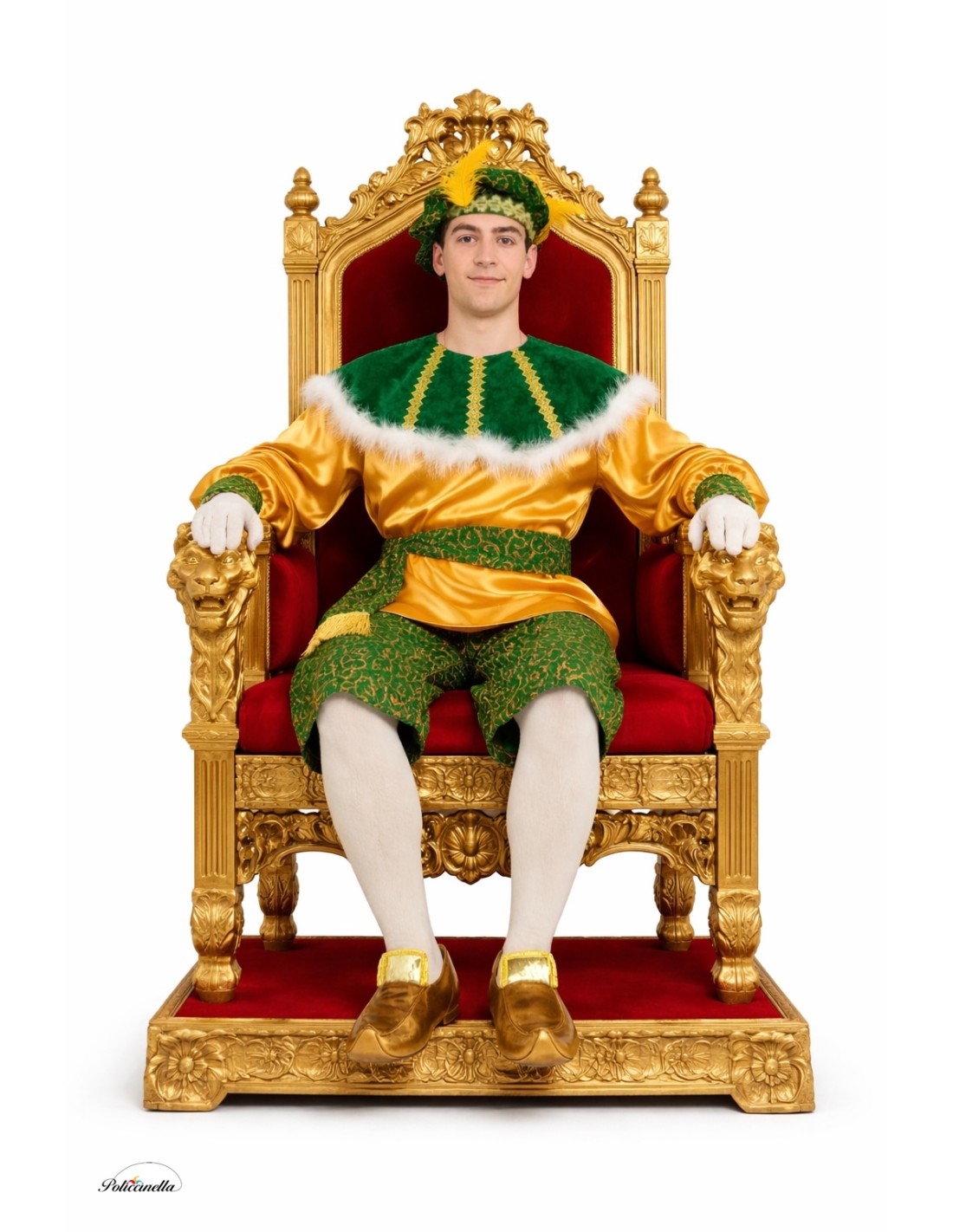 Un disfraz lleno de color y distinción, perfecto para cabalgatas y celebraciones. Incluye una gorra abullonada en tejido festero tipo gasa con dibujos dorados impresos, adornada con pasamanería y pluma amarilla que le dan un aire principesco. La casaca en raso dorado se realza con un babero de suave terciopelo verde, decorado con pasamanería dorada y ribeteado con delicada boa blanca, con cierre de velcro al cuello. El pantalón bombacho, confeccionado en la misma gasa festiva, lleva goma en la cintura y bajo las rodillas para mayor comodidad. El conjunto se completa con un fajín a juego, decorado con elegantes flecos, y cubrezapatos tipo babucha en espuma que mantienen la forma y ofrecen un acabado impecable.