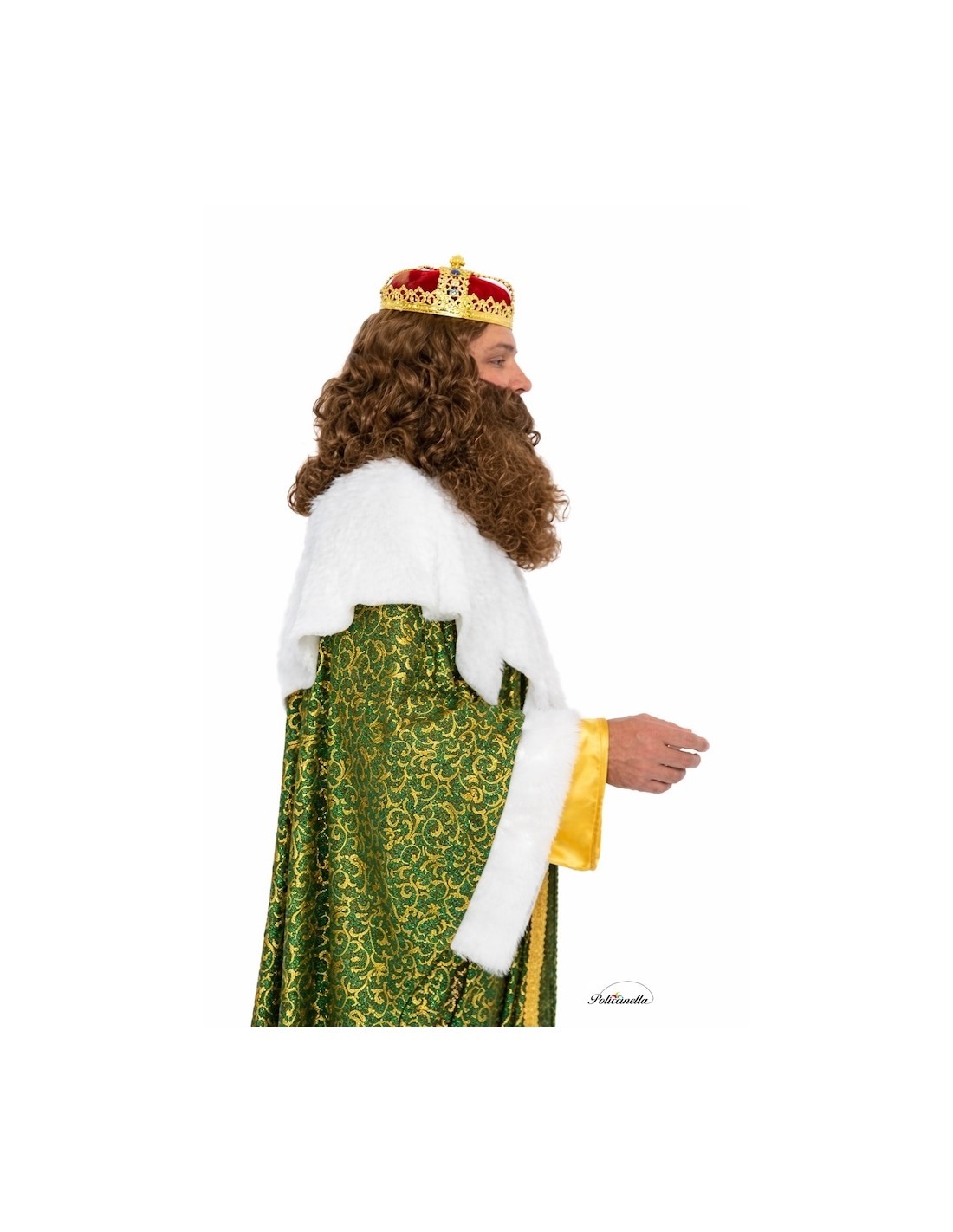 Luce con distinción este espléndido disfraz de Rey Gaspar, ideal para cabalgatas y representaciones reales. La casaca larga en tono dorado, confeccionada en poliéster, se cierra al cuello y se combina con una imponente capa verde con estampado dorado, rematada con cuello y puños de pelo blanco semirizado. El fajín a juego, ajustable con velcro, realza la silueta y aporta un toque regio, mientras que las babuchas doradas completan el conjunto. Un traje que une elegancia, tradición y presencia majestuosa en cada detalle.
