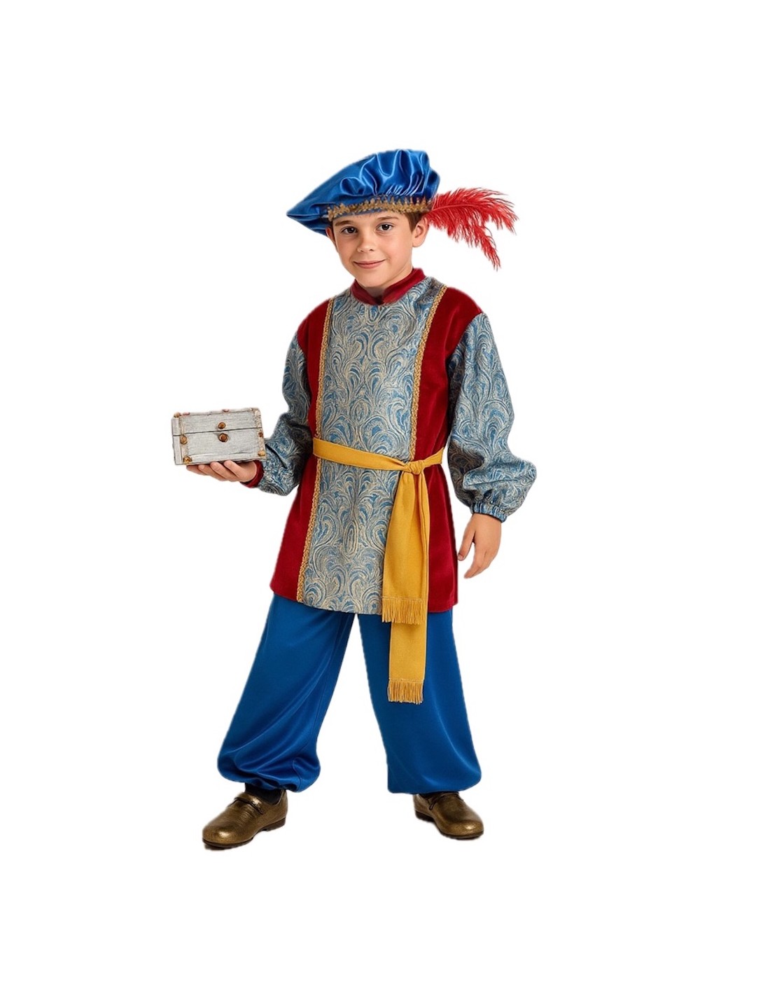 Este distinguido disfraz infantil de paje destaca por la elegancia de su casaca, confeccionada en terciopelo ligero de pelo corto, con cierre de velcro en la parte trasera del cuello y ajuste elástico en las muñecas. El frente y las mangas se realzan con delicadas aplicaciones de tejido brocado de motivos ornamentales, ribeteado con pasamanería dorada que aporta un aire señorial. El pantalón, elaborado en raso satinado azul eléctrico, se ajusta mediante goma en cintura y tobillos, ofreciendo comodidad y ligereza al movimiento. El conjunto se completa con un fajín de raso decorado con flecos suaves y un turbante o gorrita satinada a juego, fruncido con pasamanería y adornado con una pluma lateral. Una recreación cuidada y majestuosa, ideal para cabalgatas, representaciones y celebraciones navideñas.