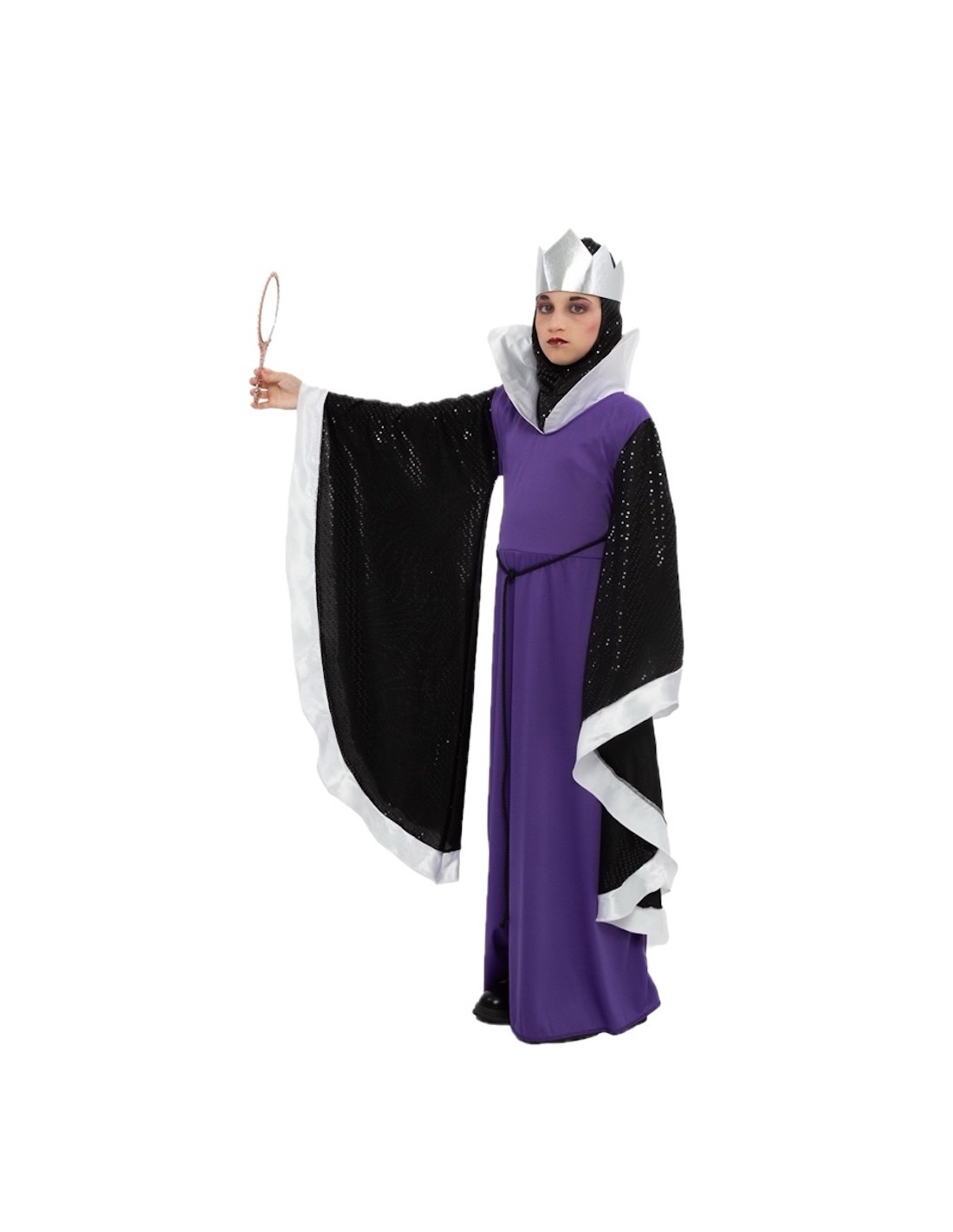 Vestido confeccionado en punto de máquina semielástico con goma a la cintura y escote de pico con solapa semirrígida. Presenta dos grandes mangas en tejido de punto de máquina con lentejuelas incrustadas, que llegan casi hasta el suelo. El vestido se acompaña de un pasamontañas del mismo tejido que las mangas, confeccionado con dos gomas para sujetarlo a los hombros y evitar que se mueva. Incluye también una corona de foam color plata. Asimismo, presenta una lazada a la altura de la cintura para ajustarlo a conveniencia, además de un cordón negro a modo decorativo.