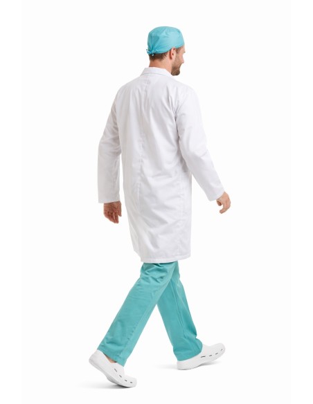 Ce costume est composé d'une blouse blanche confectionnée dans un tissu non tissé dense (TNT), avec deux grandes poches latérales. Le pantalon est confectionné dans un tricot semi-élastique avec une taille élastique et une poche interne. La casquette et le masque assortis, tous deux fabriqués dans le même tissu que le pantalon, complètent la tenue.