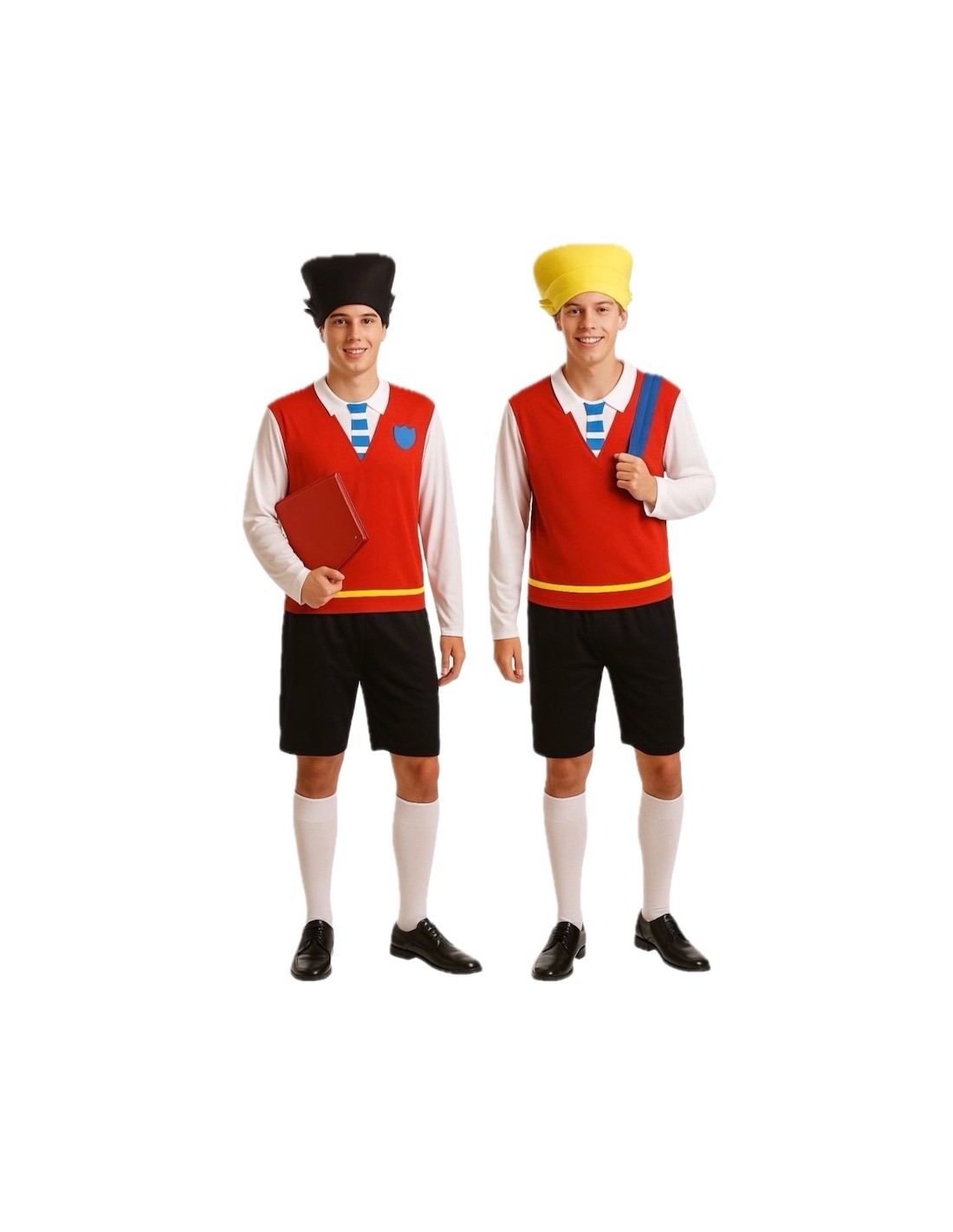 Un design unique qui allie confort et originalité. Le t-shirt, fabriqué en doux jersey semi-élastique, intègre gilet, chemise et cravate en une seule pièce, créant un effet impeccable de plusieurs vêtements en un seul. La fermeture arrière avec du velcro assure un ajustement pratique et confortable, tandis que l'ornement sur la poitrine, réalisé en feutre dense, rehausse la finition de qualité. L'ensemble est complété par un pantalon assorti, avec une taille élastique et une poche interne. Il comprend deux perruques amusantes en mousse satinée - une noire et une blonde - pour incarner votre personnage préféré. Un déguisement détaillé, résistant et offrant un excellent rapport qualité-prix.