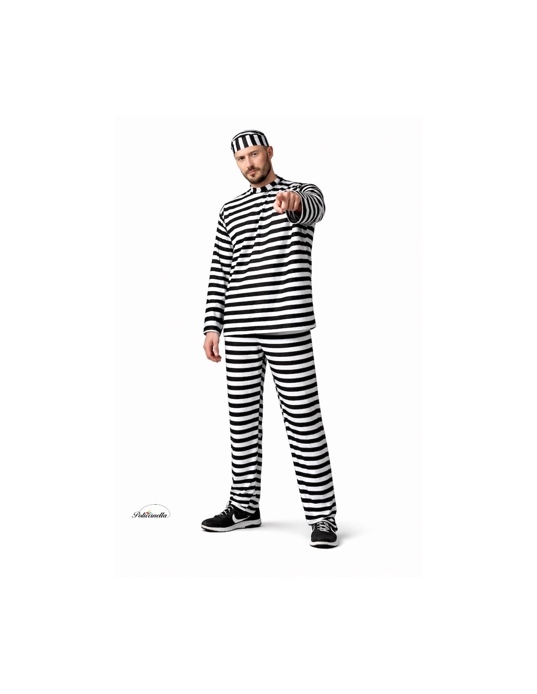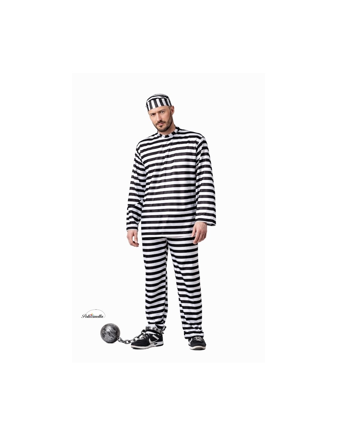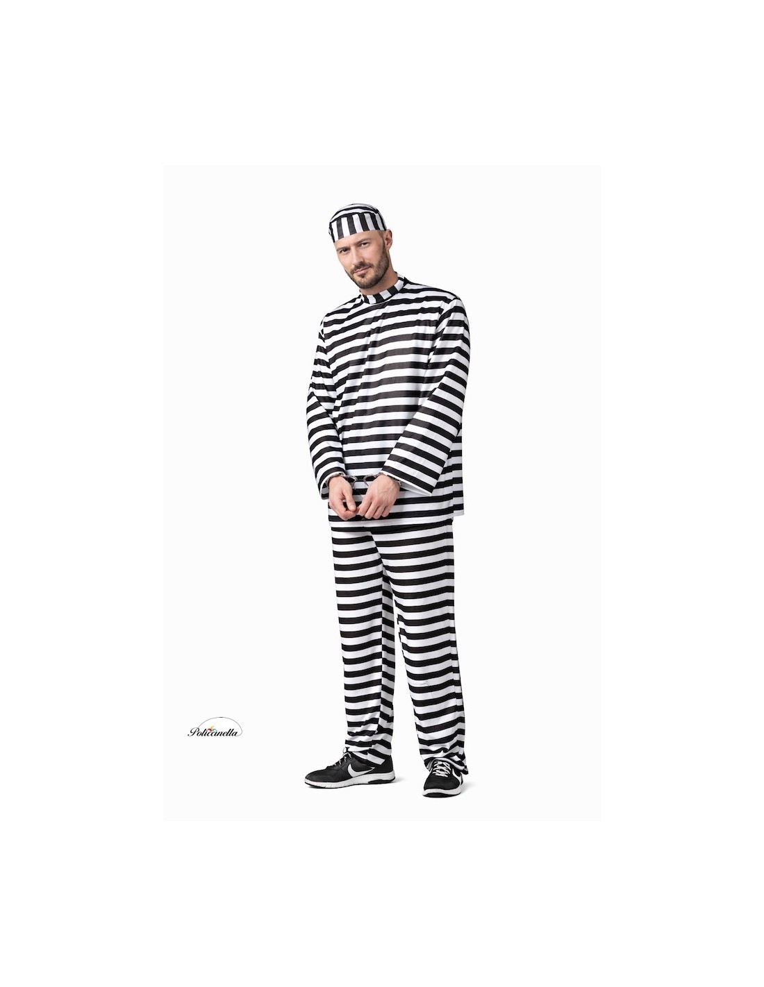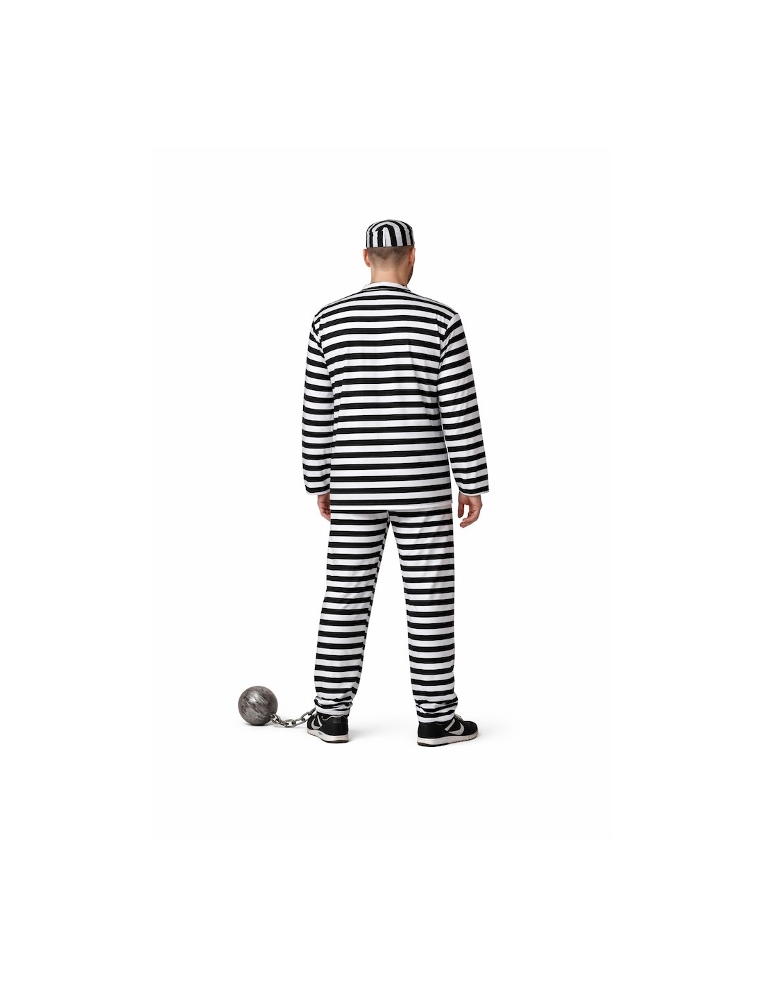 Le déguisement de prisonnier est composé d'un t-shirt à rayures noires et blanches, fabriqué dans un polyester dense au toucher agréable, se fermant au cou grâce à un système de velcro. Il est complété par un pantalon du même matériau et imprimé que le t-shirt, incorporant une poche interne et une taille élastique pour un meilleur ajustement. L'ensemble est complété par une casquette du même matériau et imprimé que les autres composants, ce qui finalise la caractérisation du déguisement.