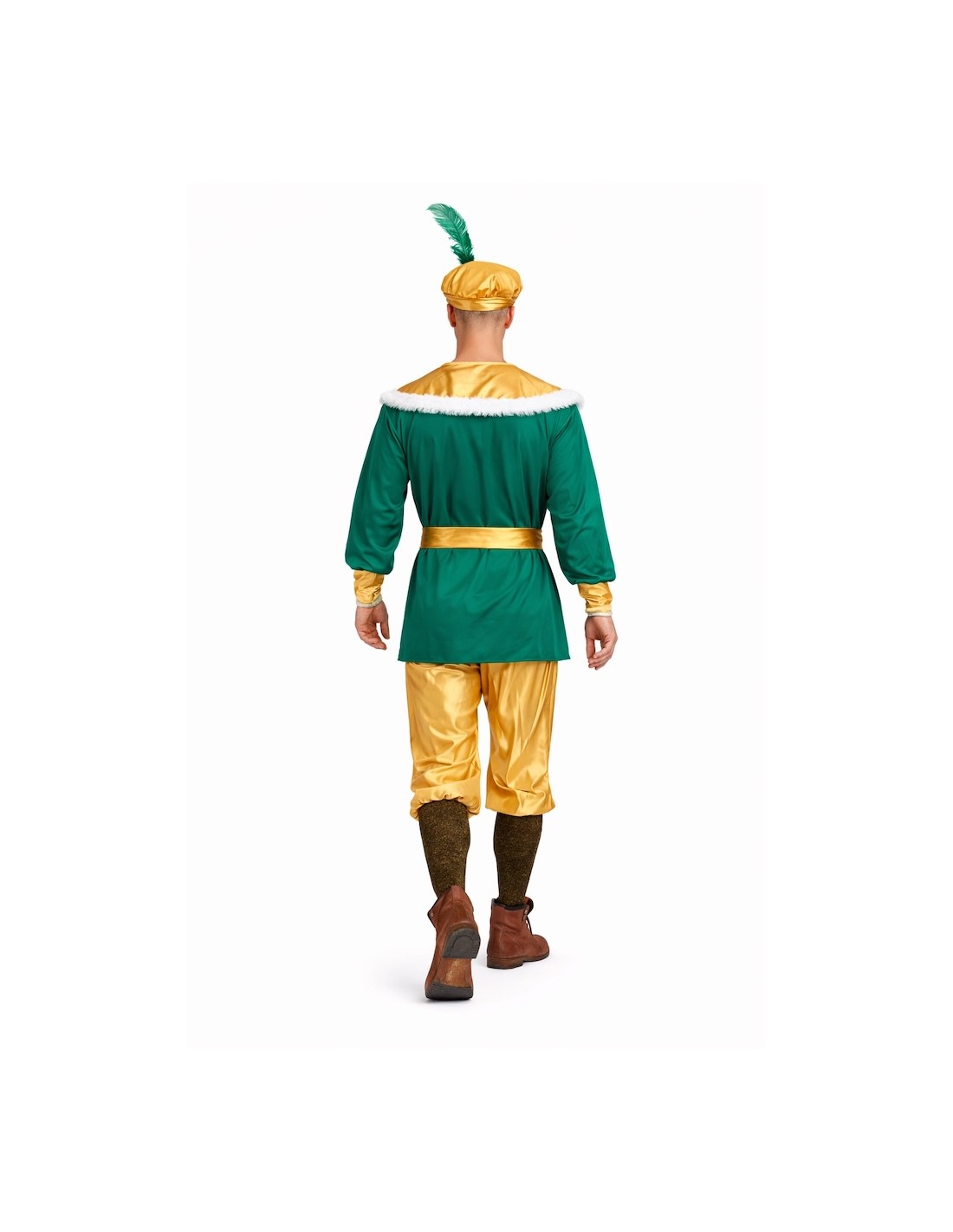 Il comprend une veste en doux satin avec fermeture velcro et col en velours, ornée de plumes et de délicates garnitures en col et poignets. Le pantalon, également en satin, est doté d'une taille élastique et de jambes pour un plus grand confort. Complétant l'ensemble, une jolie ceinture à franges et une casquette décorée de plumes et de garnitures assorties. Les deux sont confectionnés dans le même tissu que le reste du déguisement. Une tenue voyante, confortable et pleine de détails pour briller comme un véritable page royal.