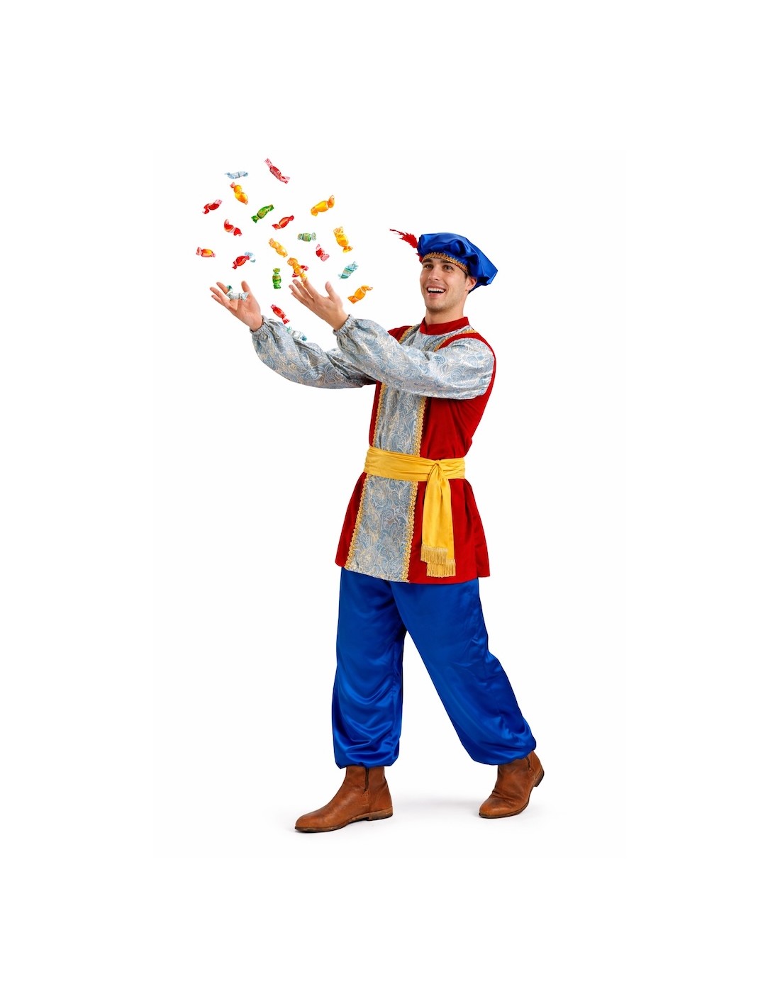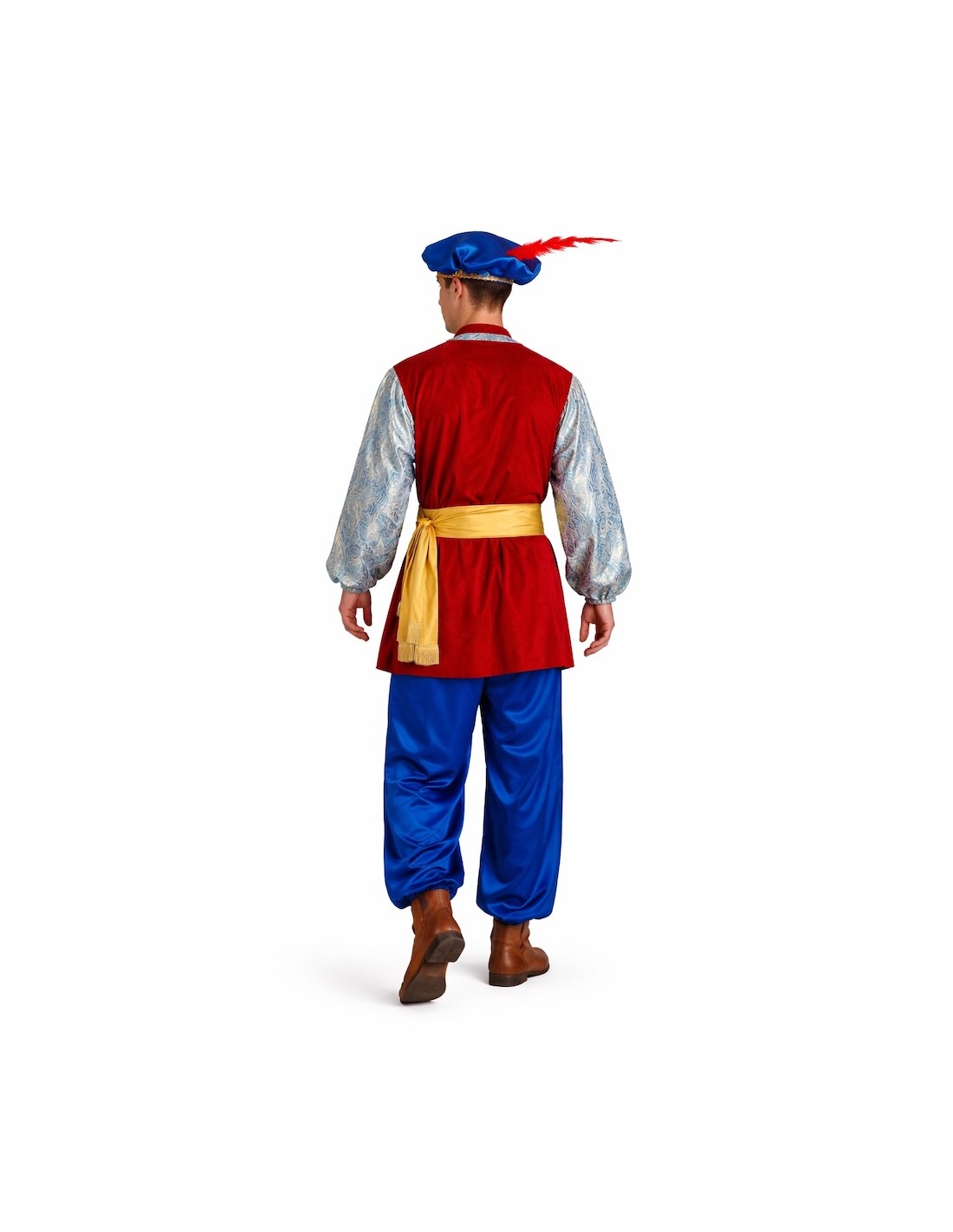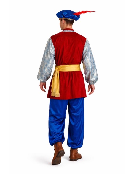 Veste confectionnée en tissu au toucher velouté, avec poitrine et manches en tissu à effet brocart, rehaussé de galons décoratifs. Elle est munie d'élastiques aux poignets et d'une fermeture par velcro à l'arrière du col. Le dos est en tissu lisse et velouté. Le pantalon bouffant a une taille et des chevilles élastiques, ainsi qu'une petite poche intérieure. L'ensemble est complété par une ceinture en satin à franges et un bonnet assorti, également en satin, décoré de galons et d'une élégante plume, avec de l'élastique à l'arrière pour un ajustement parfait. Idéal pour les défilés, les crèches et les événements festifs !