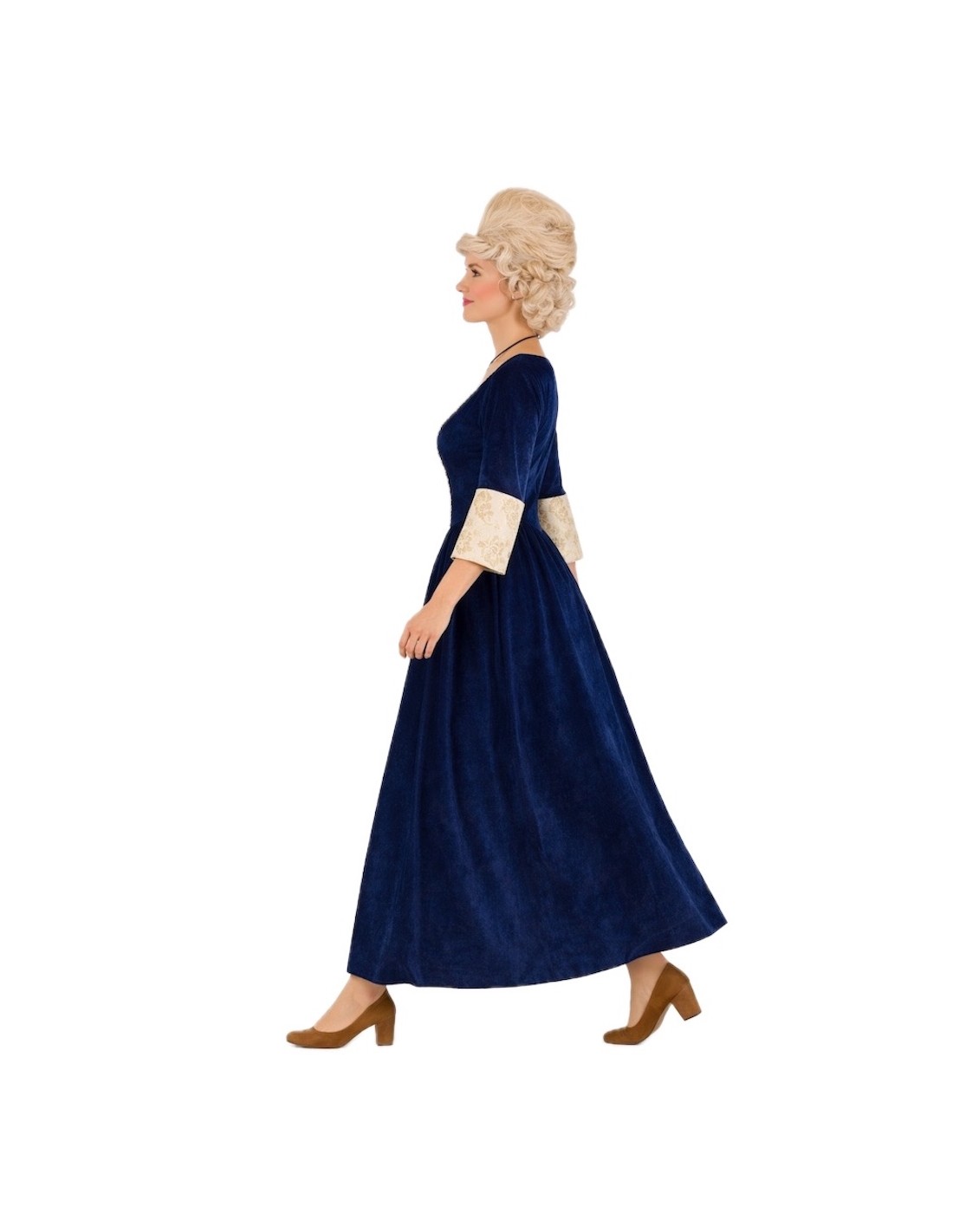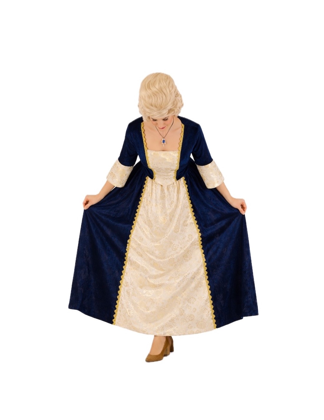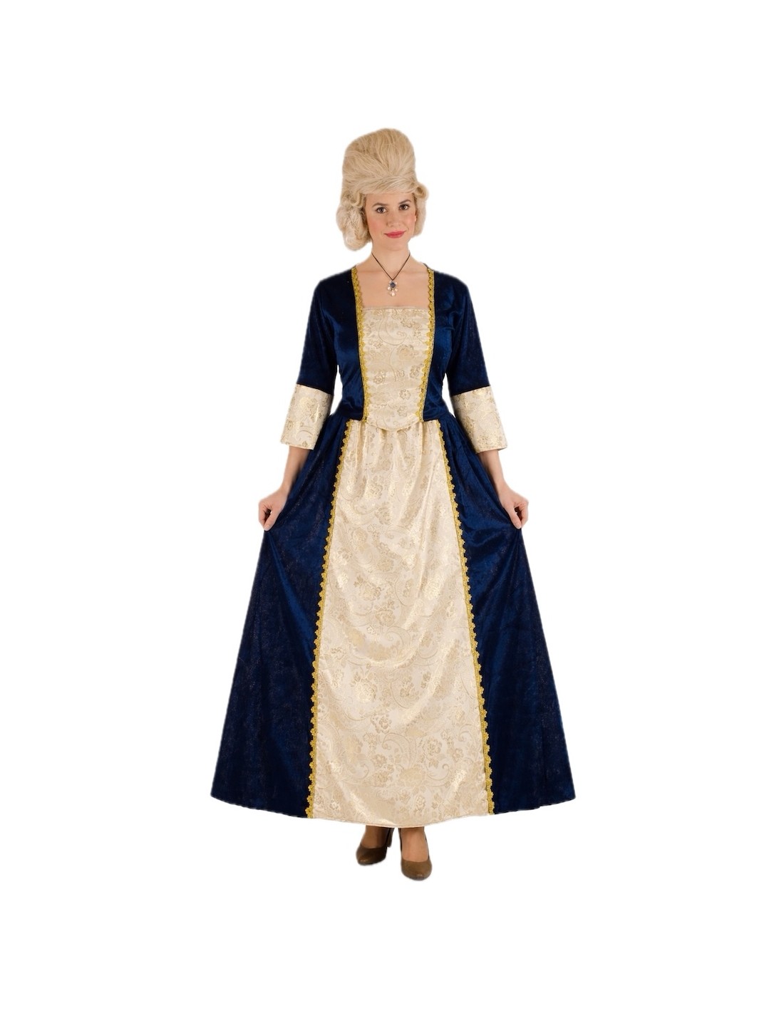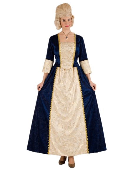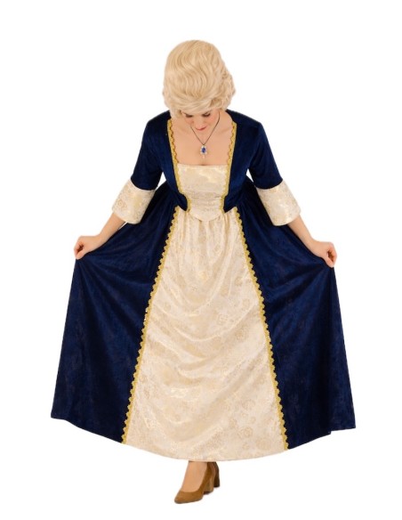Ce costume sophistiqué de marquise médiévale combine élégance et confort grâce à la qualité de ses tissus et finitions. L'ensemble se compose de deux pièces : un corsage à col en cœur avec fermeture velcro à l'arrière et élastique au niveau de la taille dans le dos, offrant un ajustement confortable et flatteur, et une jupe longue à taille élastique qui s'adapte facilement à une large gamme de tailles (environ du 36 au 44). Les deux pièces sont fabriquées en velours bleu nuit doux, combiné à un polyester imitant l'aspect raffiné du brocart. Les détails de passementerie dorée rehaussent le design, ajoutant une touche distinguée et seigneuriale. Un costume de grande qualité, idéal pour des reconstitutions historiques, des fêtes à thème ou des événements médiévaux où l'élégance est à l'honneur.