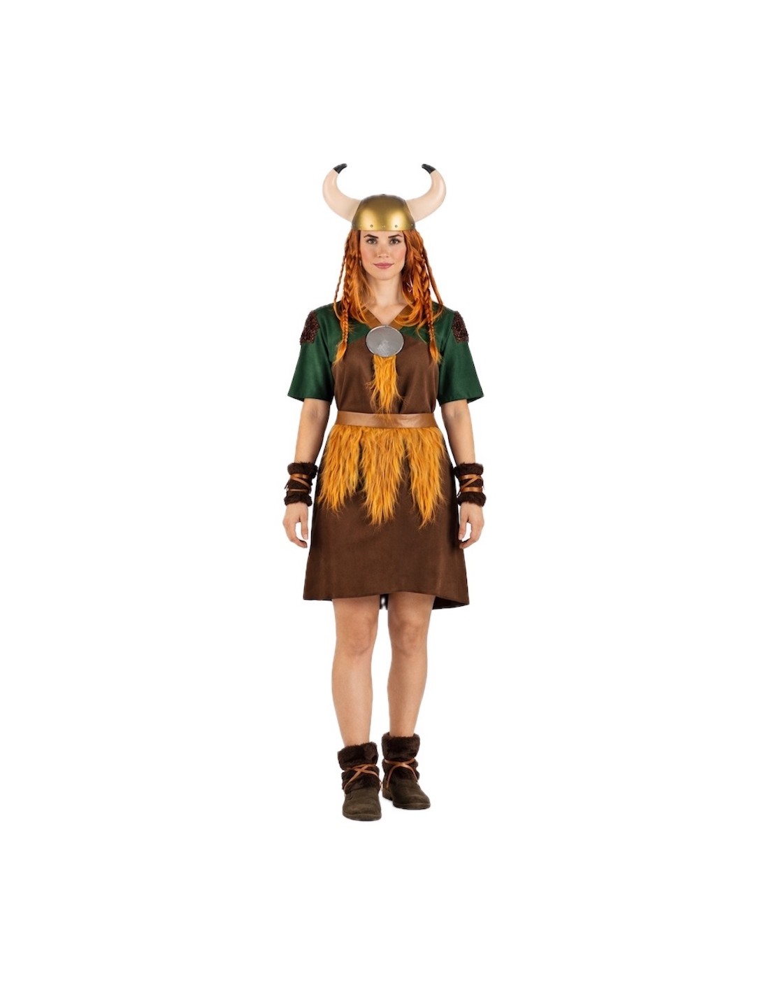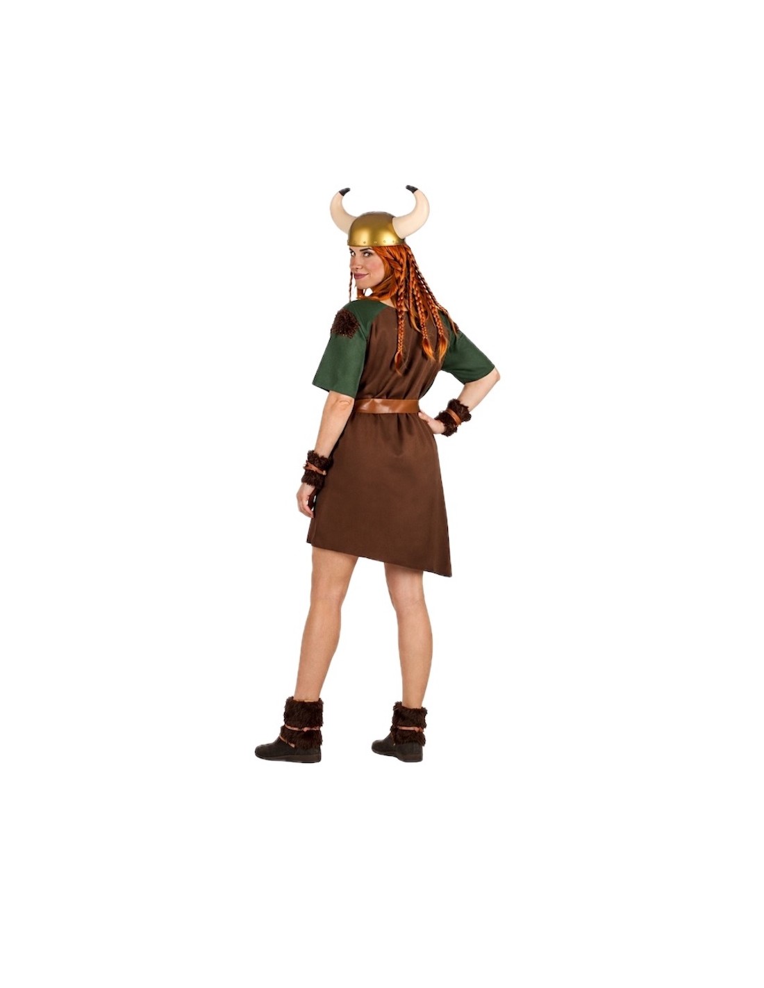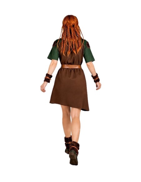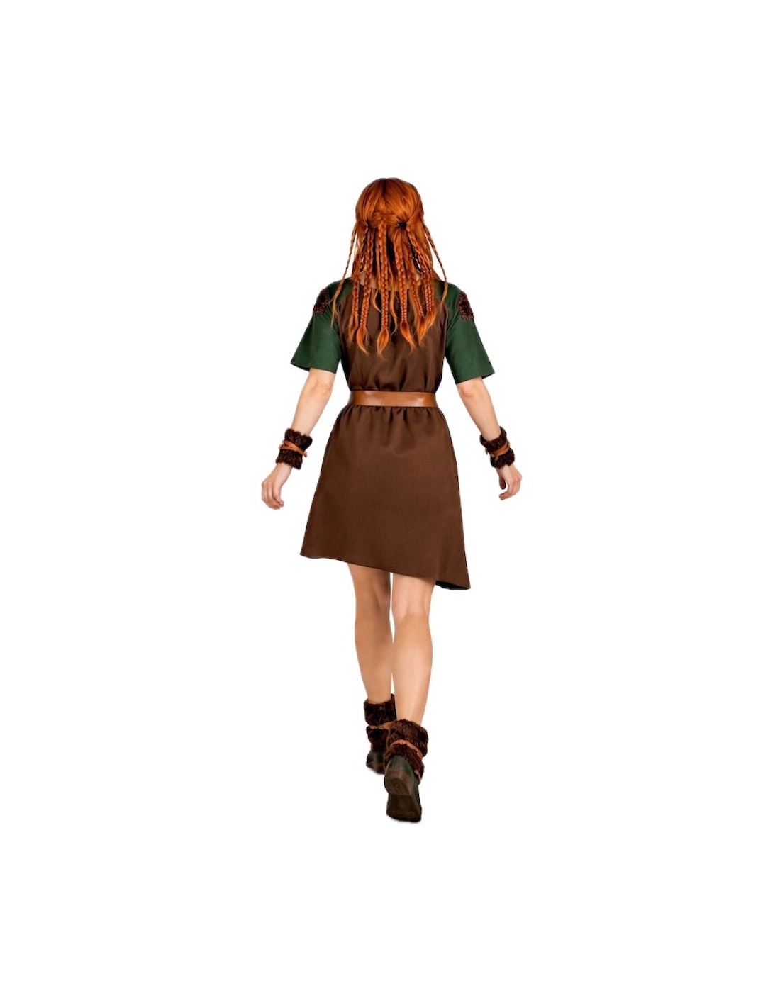 Ce déguisement de viking présente une robe qui combine une partie avant en polyester et une partie arrière en maille semi-élastique douce. Il comprend des détails sur les épaules avec de la fausse fourrure brun foncé, ainsi que des manchettes et des jambières, tous deux équipés de deux rubans marron clair pour des nœuds décoratifs. L'encolure en V est entourée de polyester marron clair simulant du cuir, et met en valeur un cercle argenté en polyester floqué avec de la fausse fourrure tombant de celui-ci. Il est complété par une ceinture en polyester marron clair, également simulant du cuir, sur laquelle pend de la fausse fourrure.