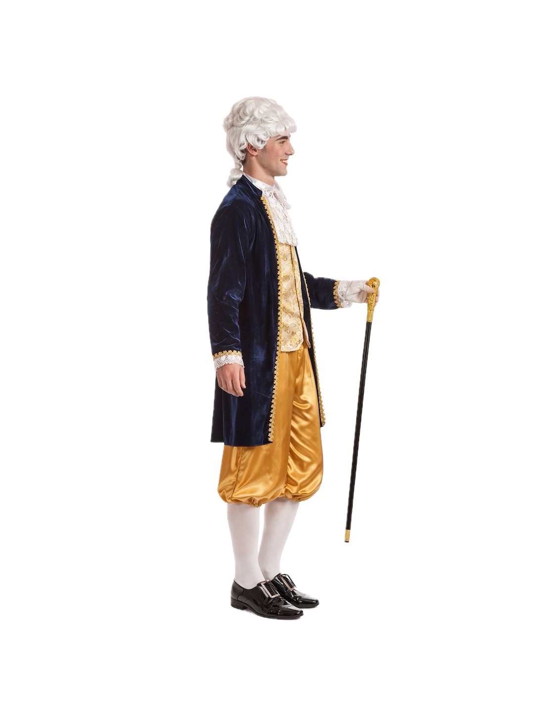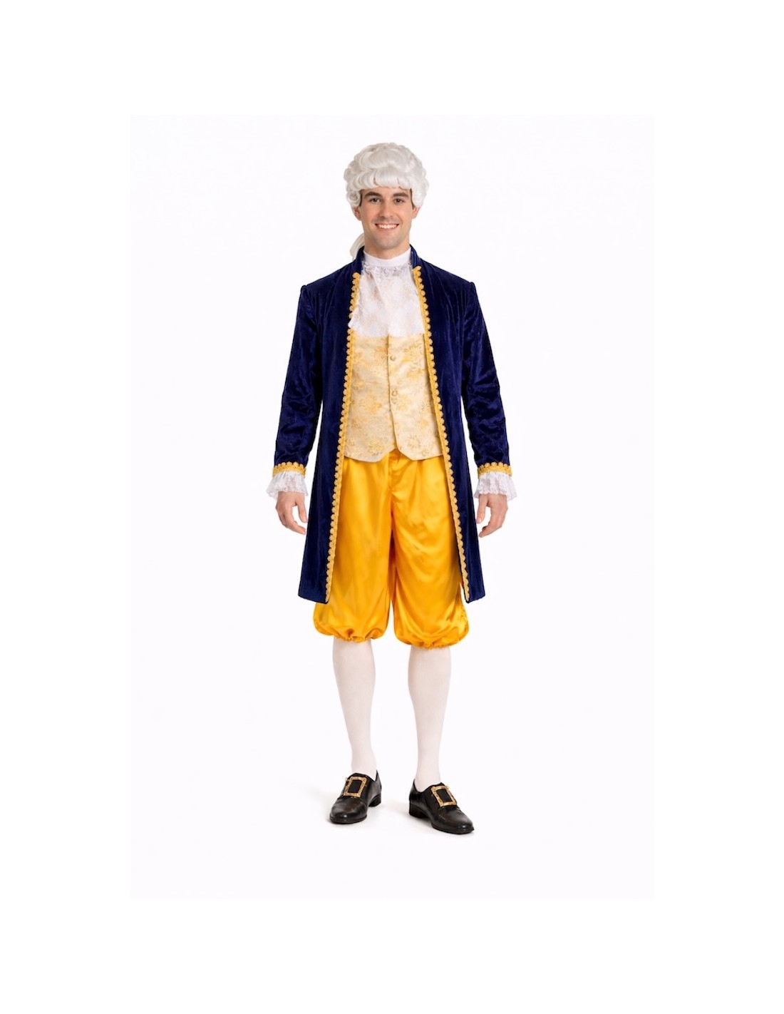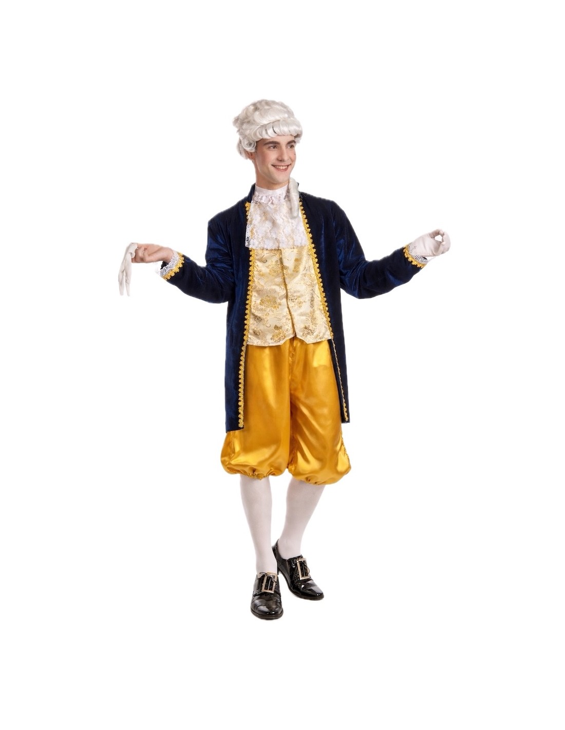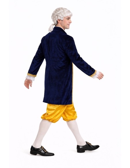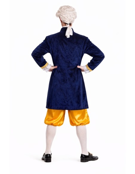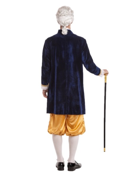 Déguisement de style Louis XV composé d'une redingote, d'un pantalon court et d'un mouchoir de cou. La redingote combine du velours dense avec du polyester imprimé de type brocart doré, ornée de galons dorés et de dentelle blanche aux poignets. Fermeture avant avec velcro caché pour faciliter son utilisation sans altérer l'esthétique. Le pantalon, en satin brillant, comprend une taille et des bas élastiques pour plus de confort, ainsi qu'une poche intérieure fonctionnelle. Sa longueur, en dessous du genou, maintient la fidélité historique. Le mouchoir de dentelle blanche complète l'ensemble avec cohérence et élégance.