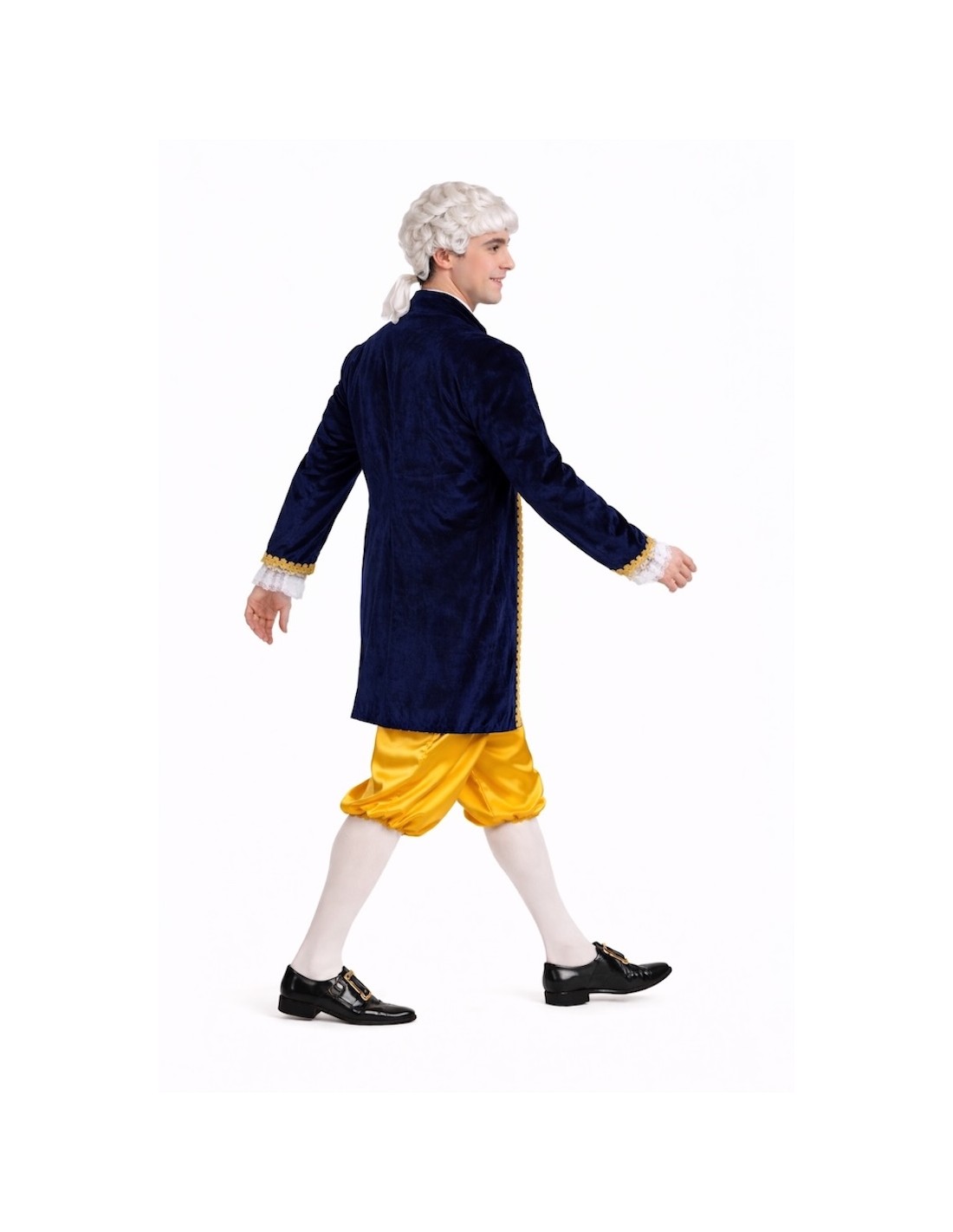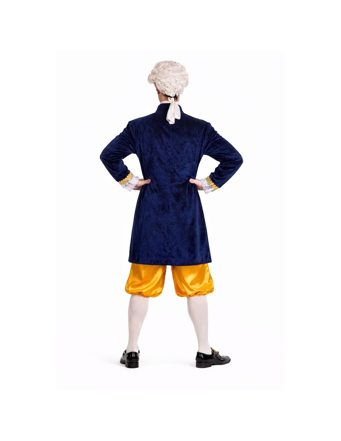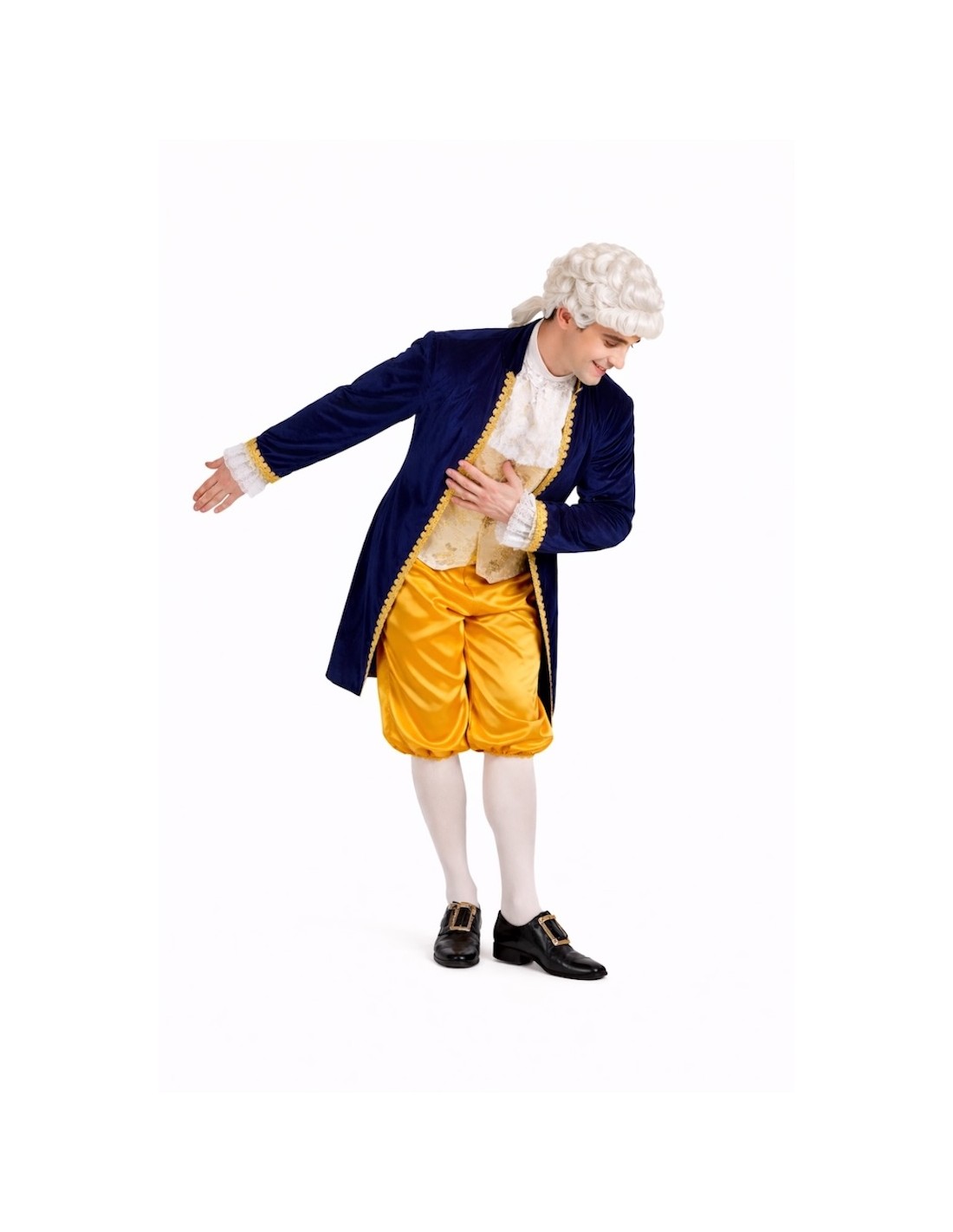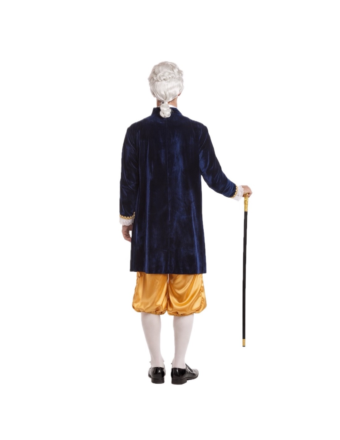 Déguisement de style Louis XV composé d'une redingote, d'un pantalon court et d'un mouchoir de cou. La redingote combine du velours dense avec du polyester imprimé de type brocart doré, ornée de galons dorés et de dentelle blanche aux poignets. Fermeture avant avec velcro caché pour faciliter son utilisation sans altérer l'esthétique. Le pantalon, en satin brillant, comprend une taille et des bas élastiques pour plus de confort, ainsi qu'une poche intérieure fonctionnelle. Sa longueur, en dessous du genou, maintient la fidélité historique. Le mouchoir de dentelle blanche complète l'ensemble avec cohérence et élégance.