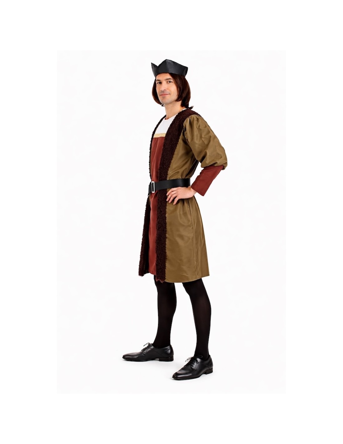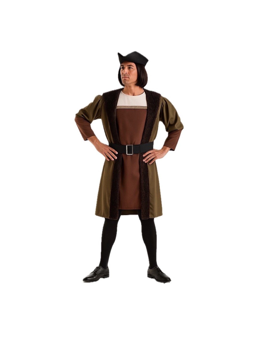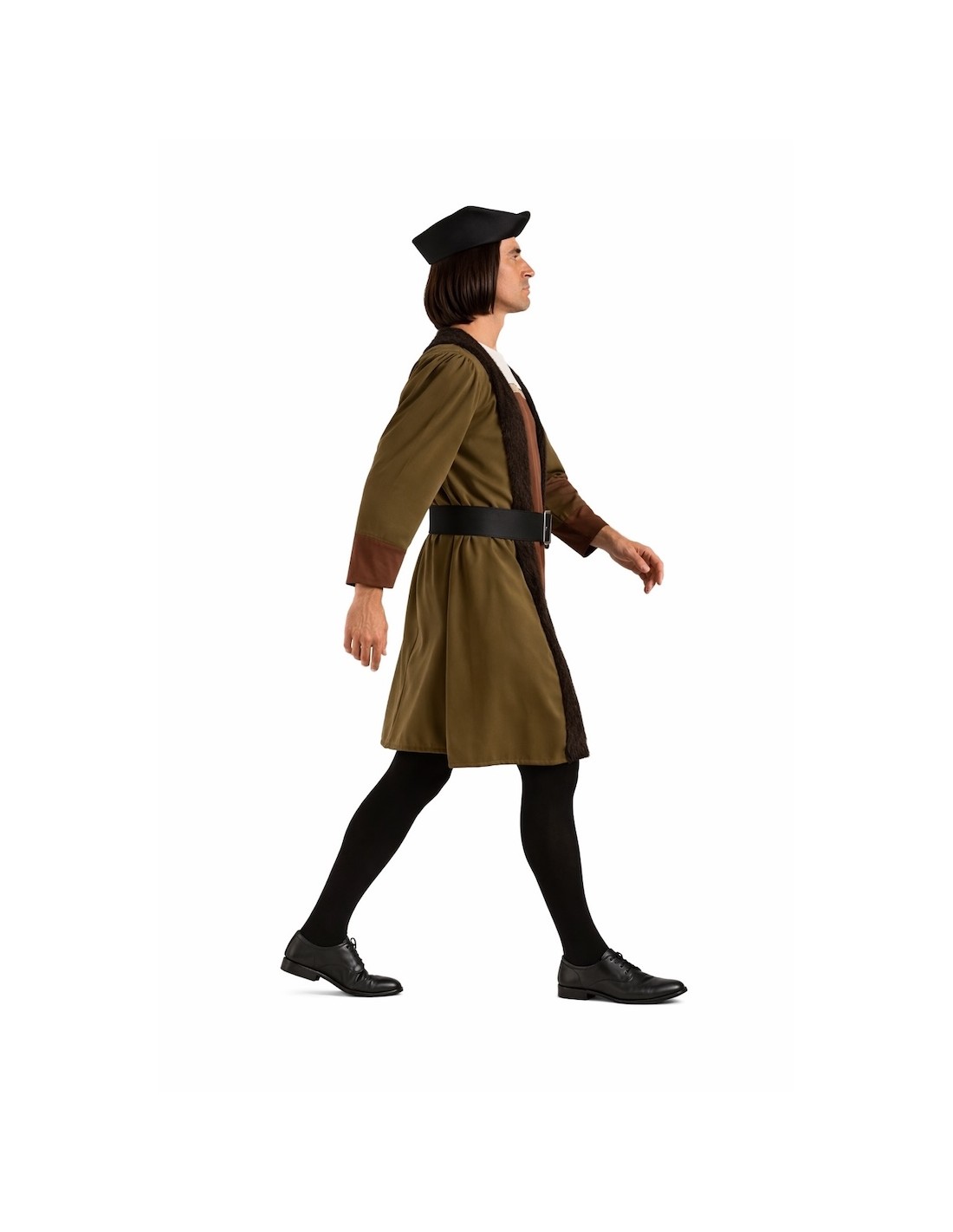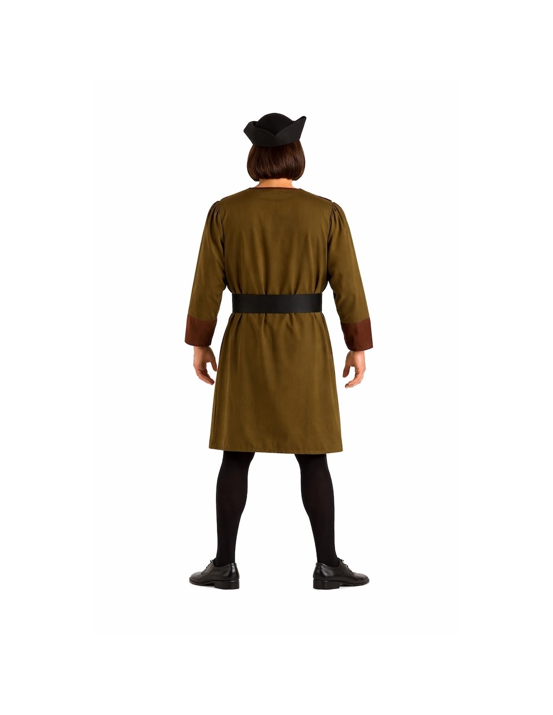 Un diseño distingué et plein de détails évoquant l'élégance et le caractère. La veste combine manteau et tunique en une seule pièce, confectionnée en doux satin effet taffetas de couleur bronze avec un ruban décoratif sur la poitrine. Le manteau, en dense et doux satin vert, présente à l'avant des pièces de fausse fourrure marron extra douce, apportant contraste et richesse visuelle. Les manches bouffantes mélangent les deux tissus, offrant une finition voyante et raffinée. Il se ferme avec une ceinture en satin noir satiné de grande structure, ornée d'une boucle argentée au fini métallique. L'ensemble est complété par le classique chapeau d'amiral, fabriqué en satin mousseux pour conserver sa forme et donner de l'élégance au design. Un costume de qualité, idéal pour se démarquer lors de toute célébration.
