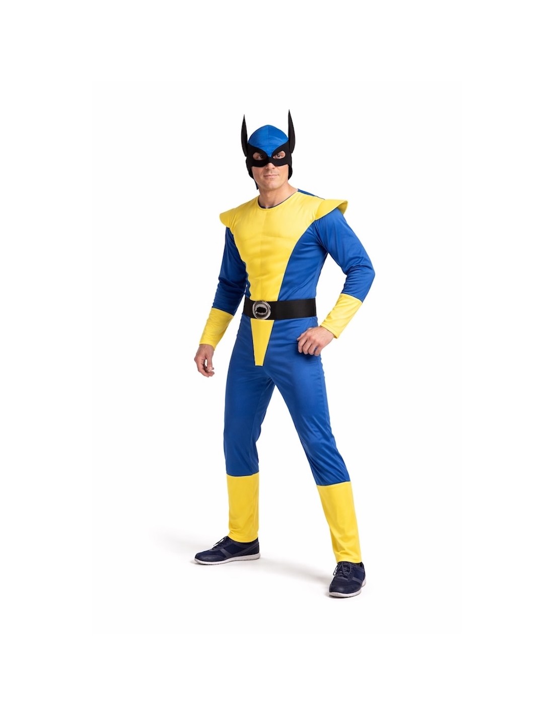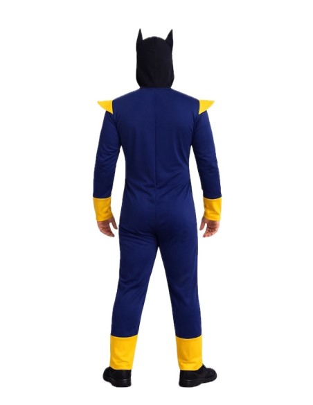 Il s'agit d'une combinaison intégrale fabriquée en doux tricot de machine. Elle comprend une section frontale qui simule des abdominaux, rembourrée de fibre de polyester pour plus de volume et de réalisme. La fermeture se fait à l'arrière à l'aide d'une fermeture éclair et comporte des épaulières externes en polyester moussé, ce qui apporte structure et définition. Les poignets des manches et des jambes, également en jaune, renforcent le design. Elle comprend une ceinture noire cousue directement sur la combinaison à l'avant, équipée d'une boucle moussée avec une finition argentée pour une touche distinctive. L'ensemble est complété par un masque fabriqué en polyester moussé doux, un matériau léger et résistant, conçu pour s'ajuster confortablement au visage.