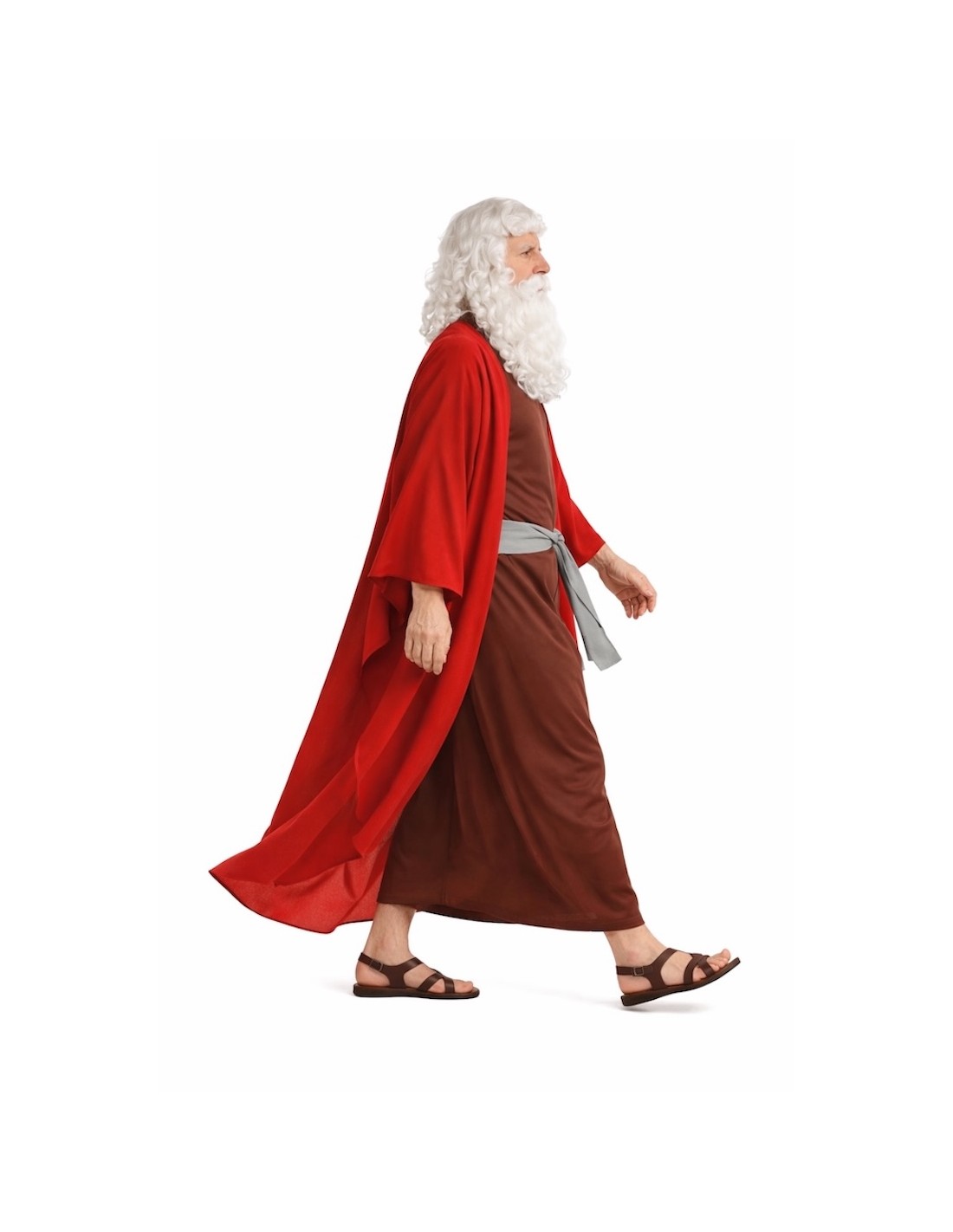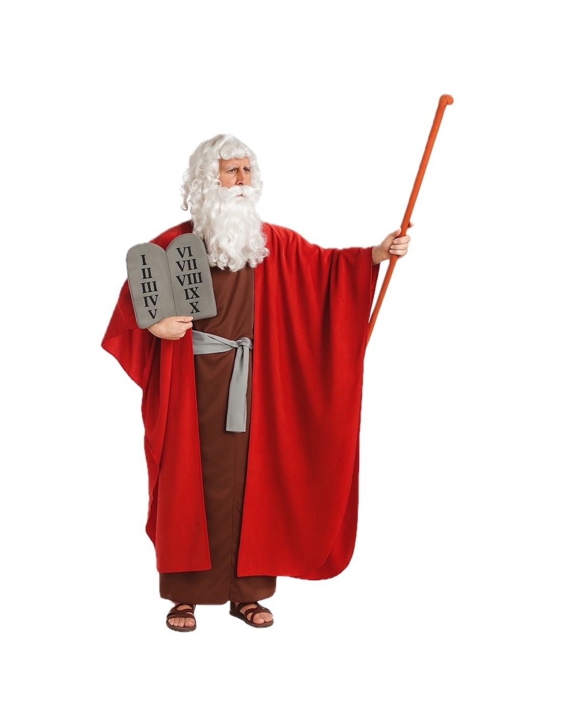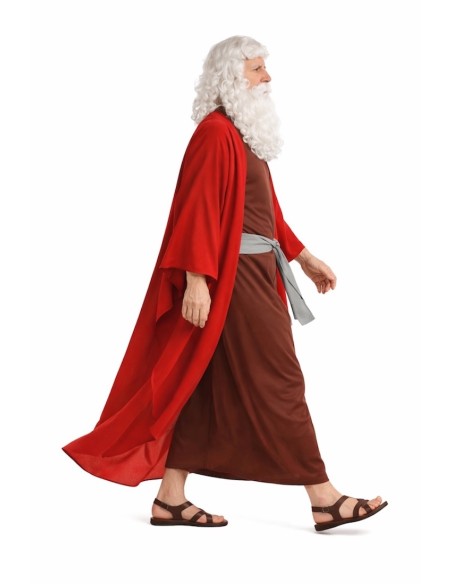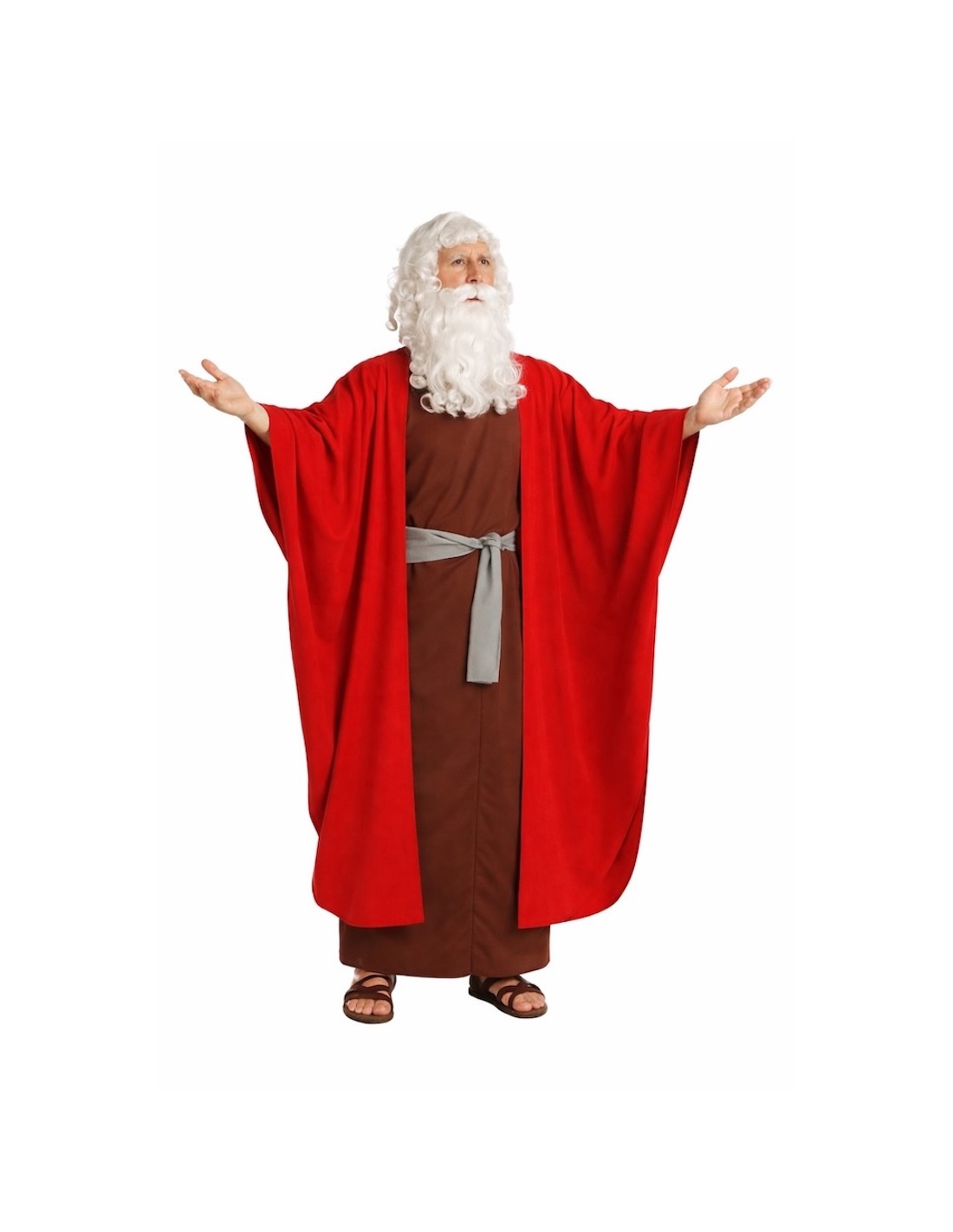 Ce costume de Moïse se compose d'une tunique sans manches, fabriquée en satin doux et dense d'une belle couleur bronze, avec une petite ouverture à l'arrière pour une plus grande mobilité. Il est accompagné d'une ceinture à carreaux Vichy en polyester, à nouer à la taille avec un nœud, offrant de la structure et une touche distinctive. L'ensemble est complété par une cape rouge confectionnée en polyester au toucher velours. Enfin, pour compléter la caractérisation, nous ajoutons les fameuses Tables de la Loi de l'Exode, fabriquées en tricot machine recouvert de filtre avec une poignée pour pouvoir glisser la main en dessous.