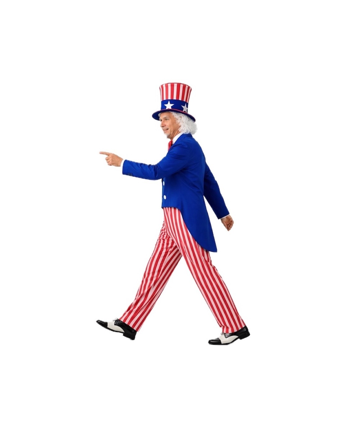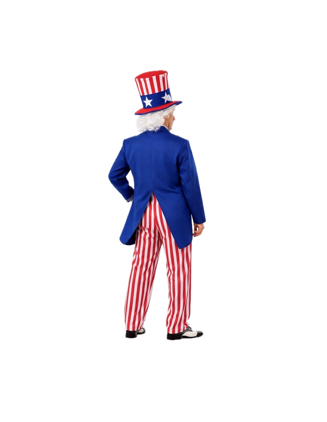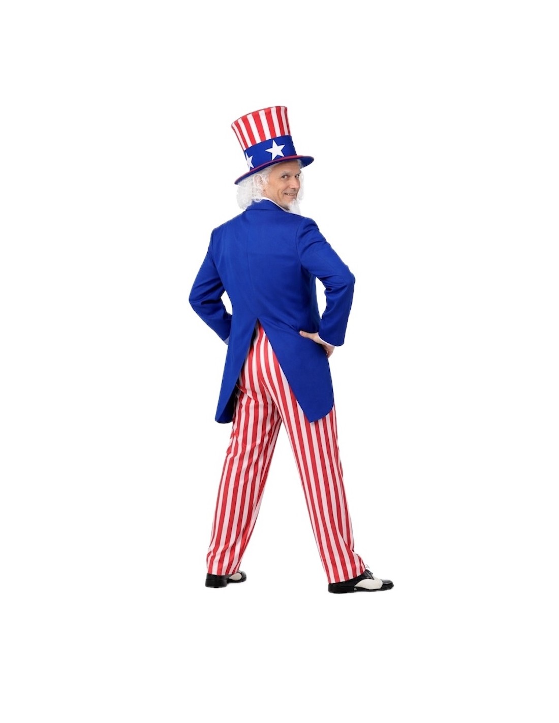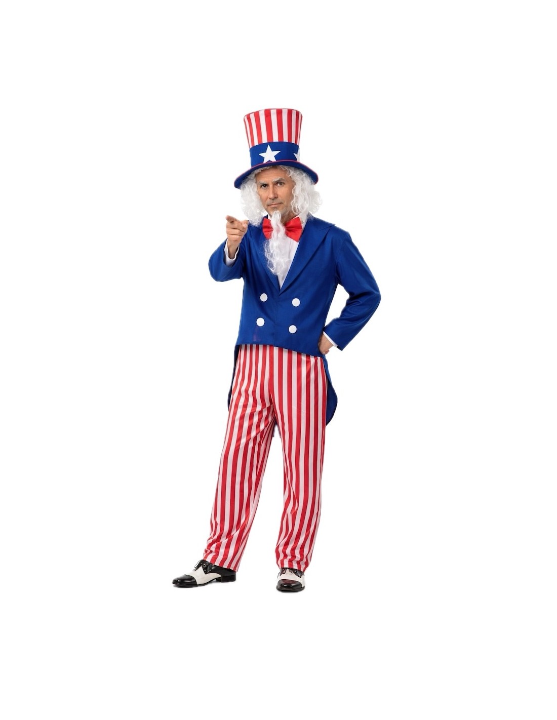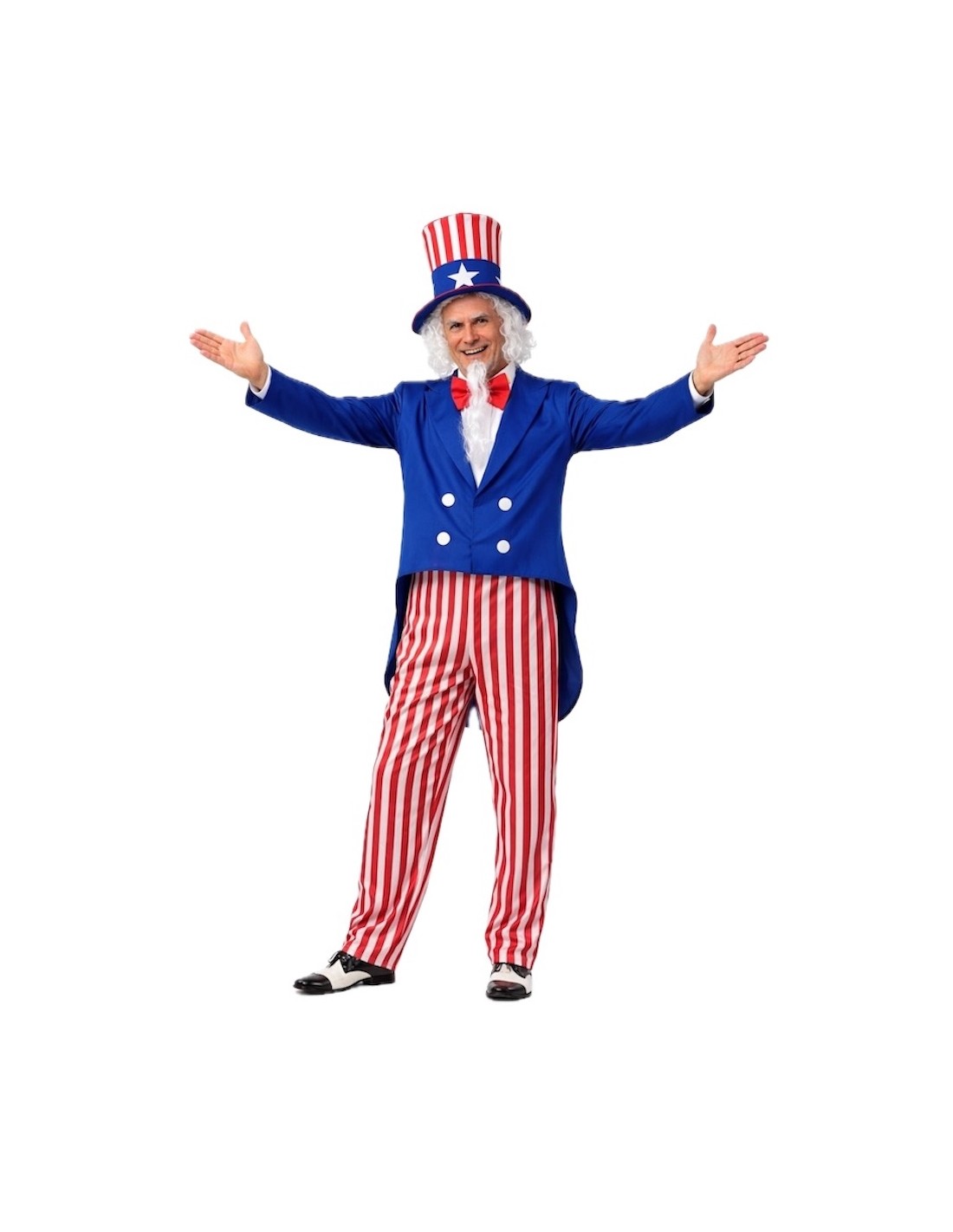 Ce costume se distingue par sa confection soignée et sa grande qualité dans chaque détail. La veste de type frac, en polyester dense et doux, se ferme confortablement avec du velcro et est ornée de pièces de feutre sur le devant. Le pantalon, en satin léger avec une taille élastique, apporte confort et liberté de mouvement, tandis que le nœud papillon en satin mousseux avec fermeture au cou ajoute une touche élégante et voyante. La pièce maîtresse du costume est son spectaculaire chapeau haut-de-forme en satin, fabriqué sur une base rembourrée pour maintenir sa forme impeccable, décoré d'étoiles en feutre qui mettent en valeur son air patriotique. Un ensemble résistant, confortable et accrocheur, idéal pour les défilés, les cavalcades et les fêtes à thème où l'on cherche à briller avec style.