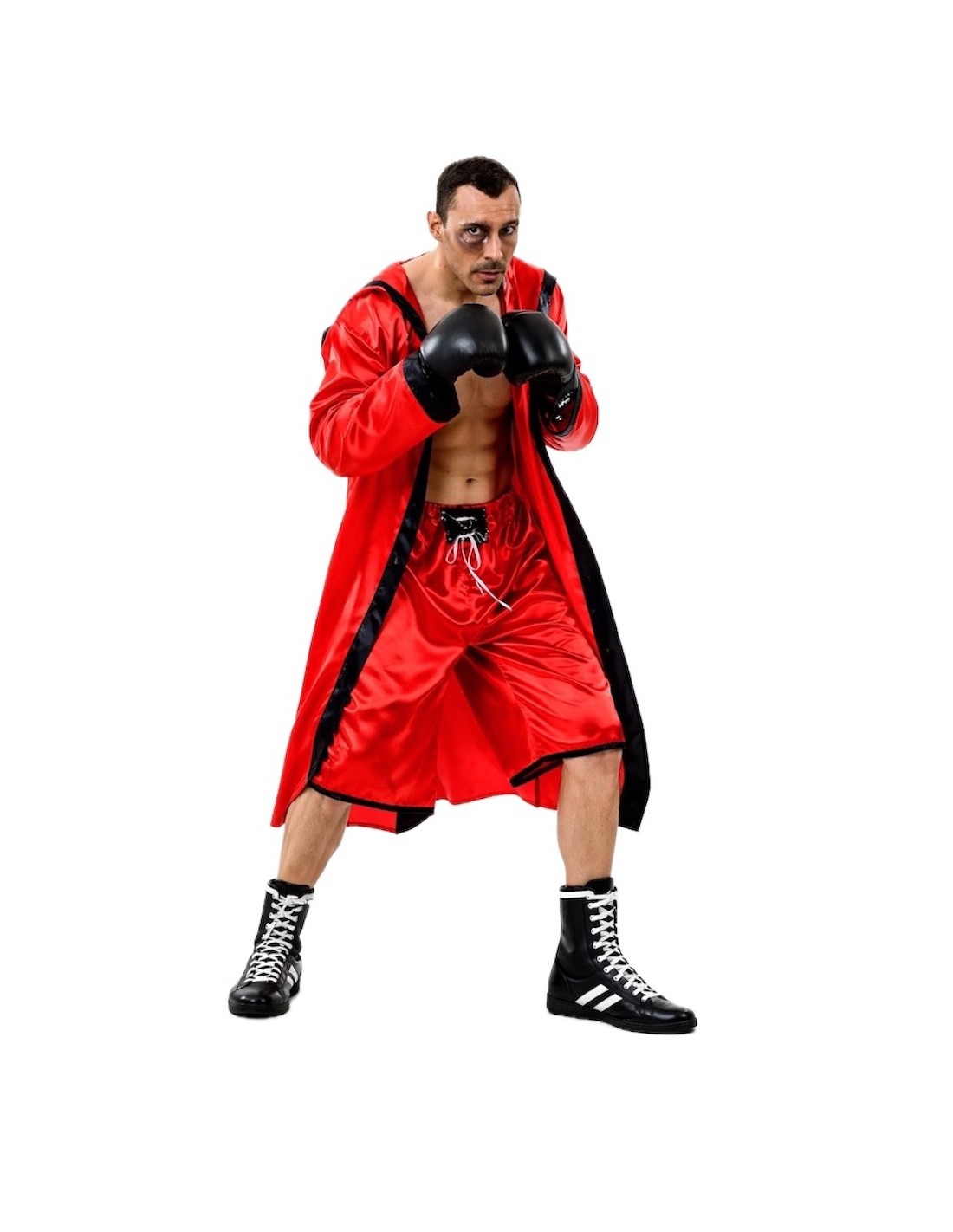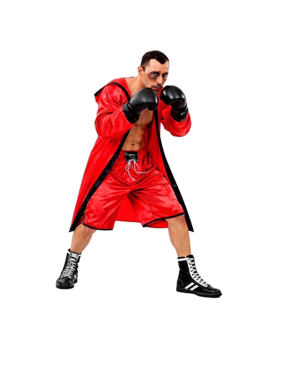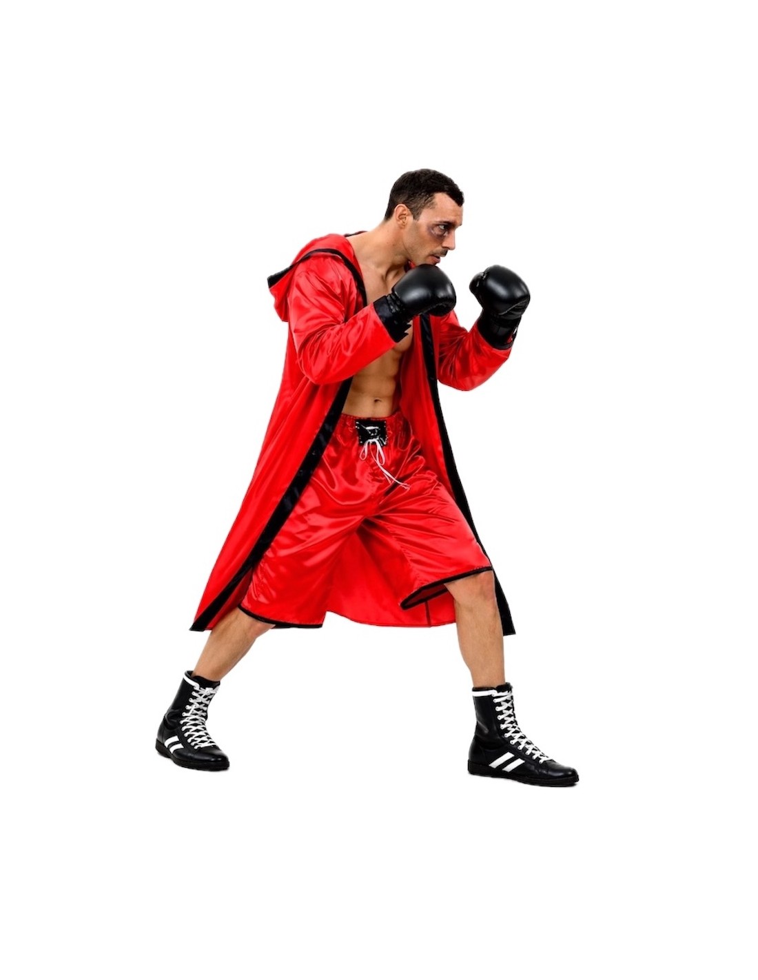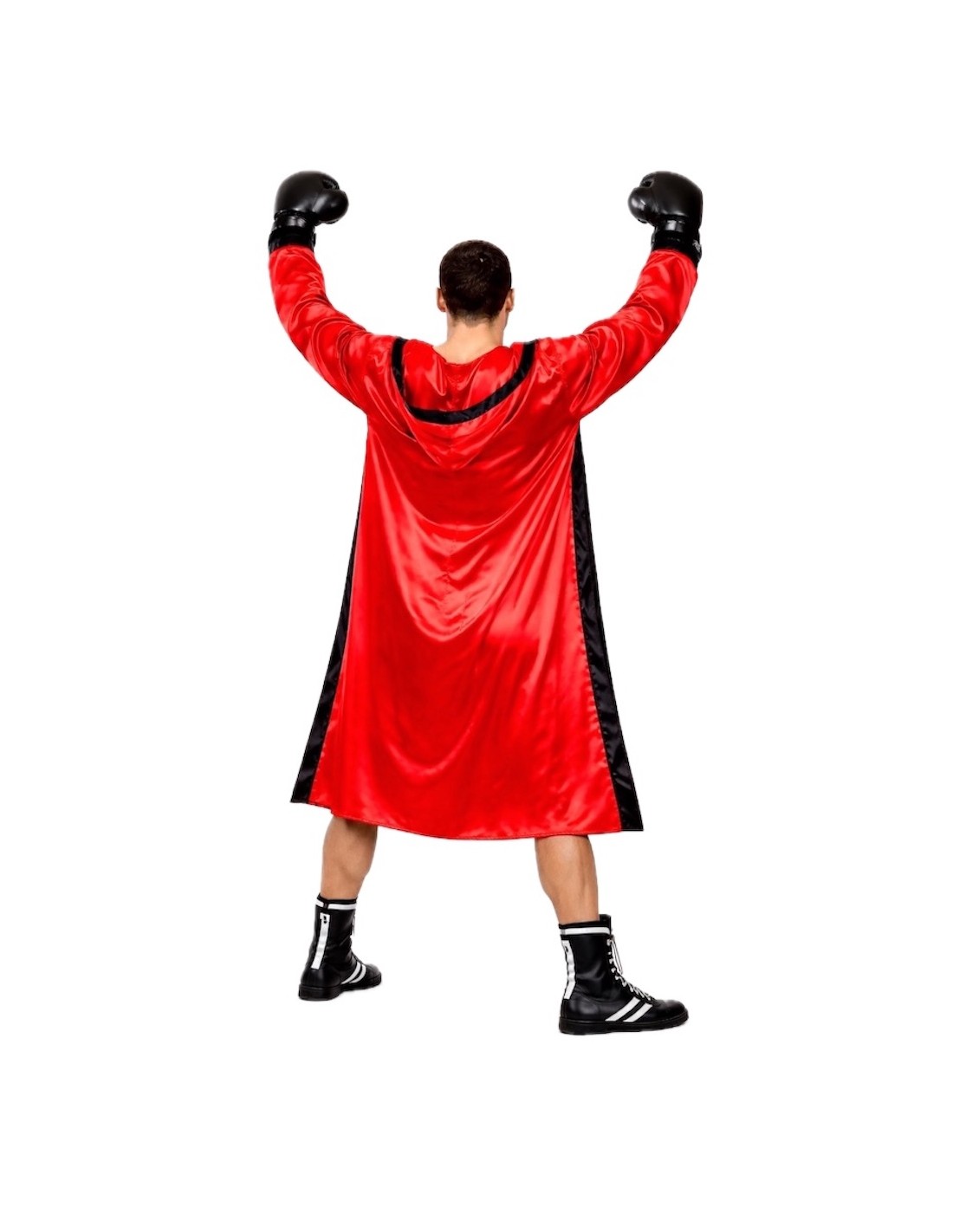 Ce déguisement se compose d'un peignoir de ring avec capuche intégrée et d'un short de kick-boxing. Le short comporte un petit motif à l'avant, en matière plastifiée, simulant l'ajustement du short, et est doté d'une ceinture élastique et d'une petite poche intérieure. Toutes les pièces sont fabriquées dans un satin rouge vif dense mais doux.