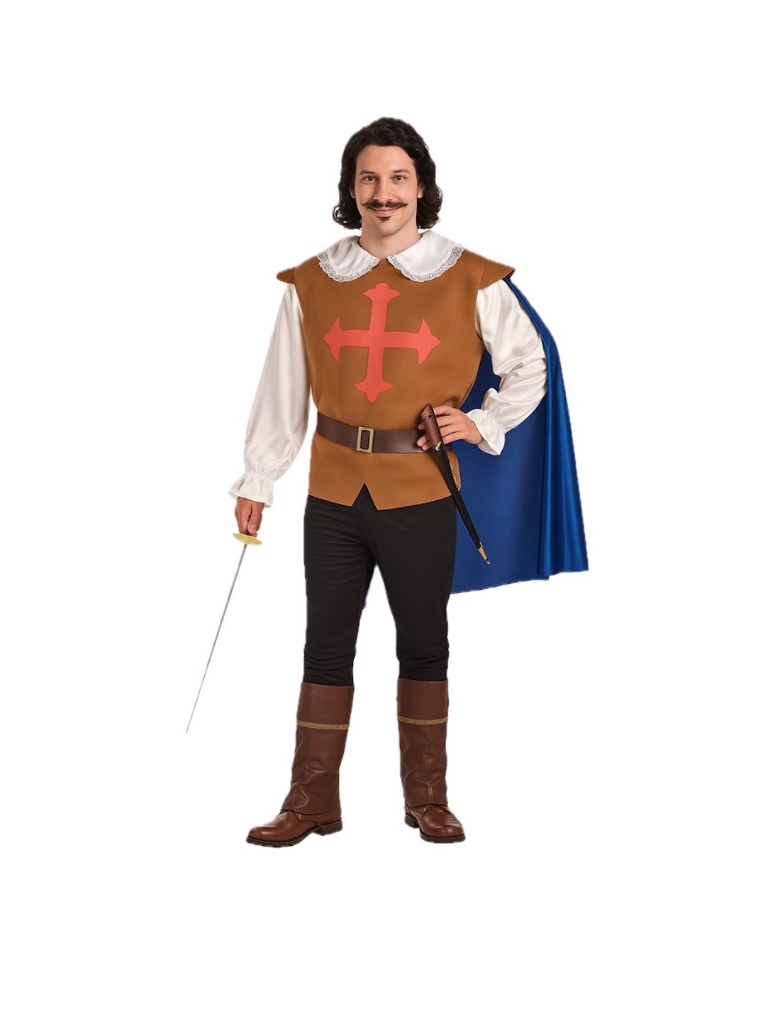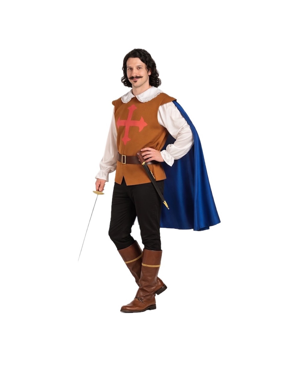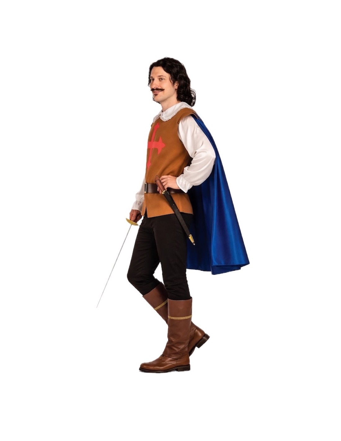 Ce costume de mousquetaire comprend un gilet intégral qui combine l'apparence d'une chemise blanche en dessous, fabriquée en satin avec un col typique de l'époque, orné de dentelles et de manches élastiques en bas pour plus de volume, créant l'effet de deux vêtements en une seule pièce. Le gilet, en tissu point de machine, présente un dessin imprimé à l'avant et des épaulettes extérieures. Il comprend une cape en satin, attachée au gilet avec du velcro. Le pantalon noir, en tissu point de machine, a une taille élastique pour un meilleur ajustement. Une ceinture marron foncé en polyester tissé sur feutre est ajoutée, avec l'apparence de cuir et une boucle rectangulaire dorée fonctionnelle, ainsi que le haut des bottes, du même tissu avec des galons dorés pour une touche distinctive.