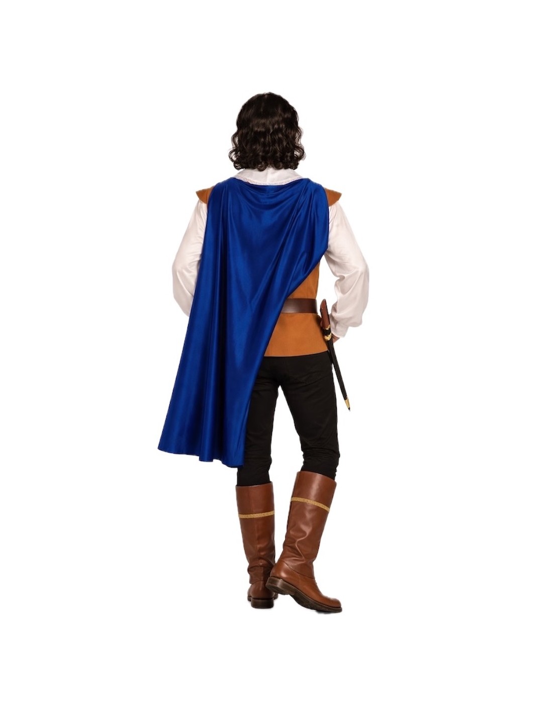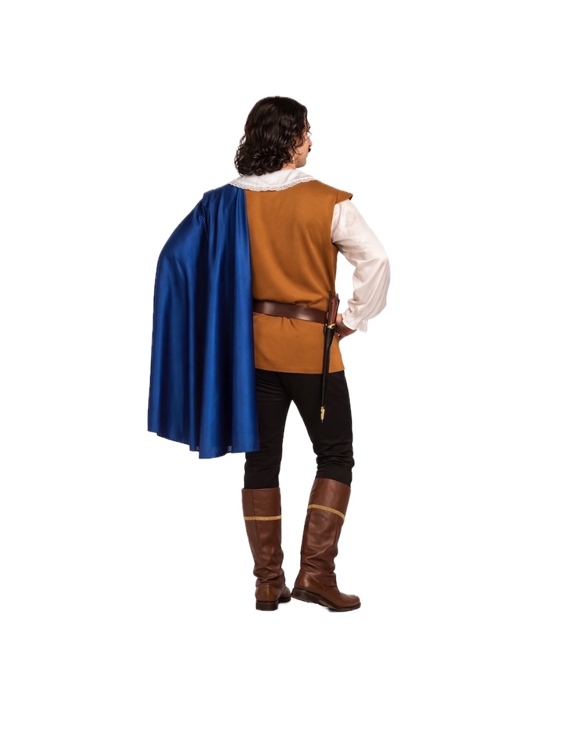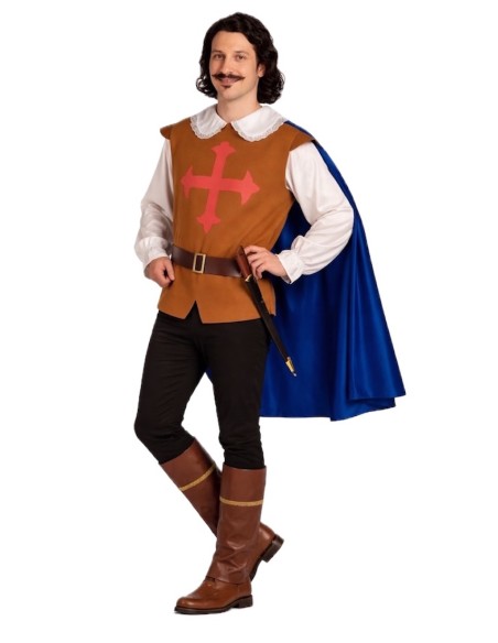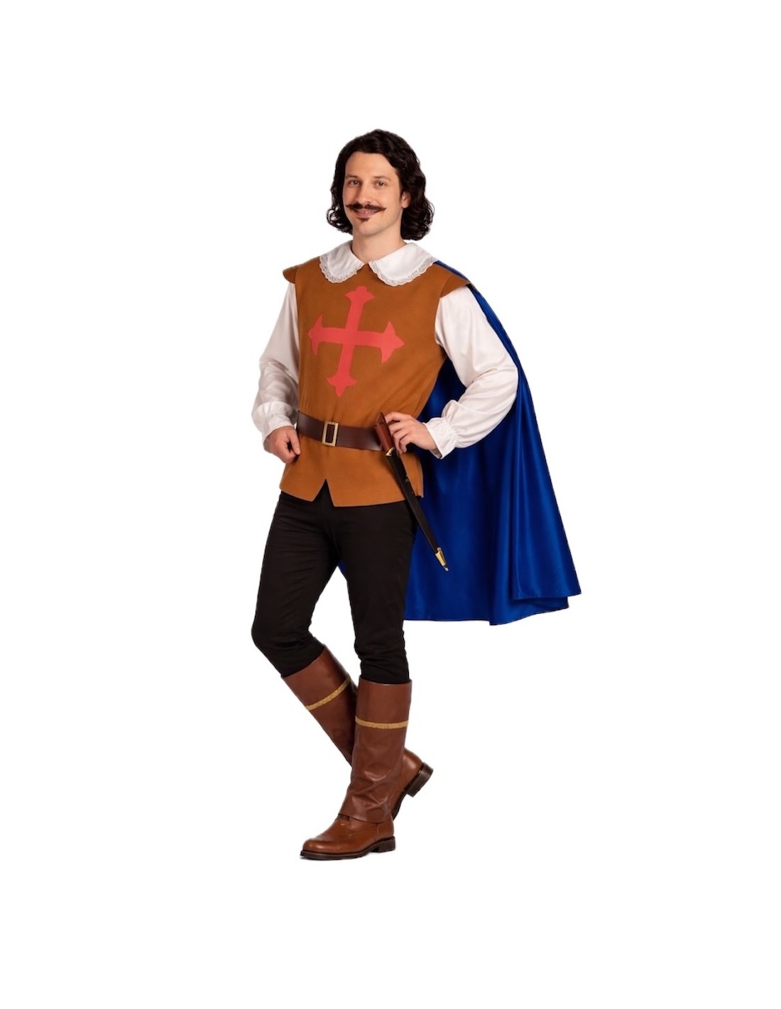 Ce costume de mousquetaire comprend un gilet intégral qui combine l'apparence d'une chemise blanche en dessous, fabriquée en satin avec un col typique de l'époque, orné de dentelles et de manches élastiques en bas pour plus de volume, créant l'effet de deux vêtements en une seule pièce. Le gilet, en tissu point de machine, présente un dessin imprimé à l'avant et des épaulettes extérieures. Il comprend une cape en satin, attachée au gilet avec du velcro. Le pantalon noir, en tissu point de machine, a une taille élastique pour un meilleur ajustement. Une ceinture marron foncé en polyester tissé sur feutre est ajoutée, avec l'apparence de cuir et une boucle rectangulaire dorée fonctionnelle, ainsi que le haut des bottes, du même tissu avec des galons dorés pour une touche distinctive.