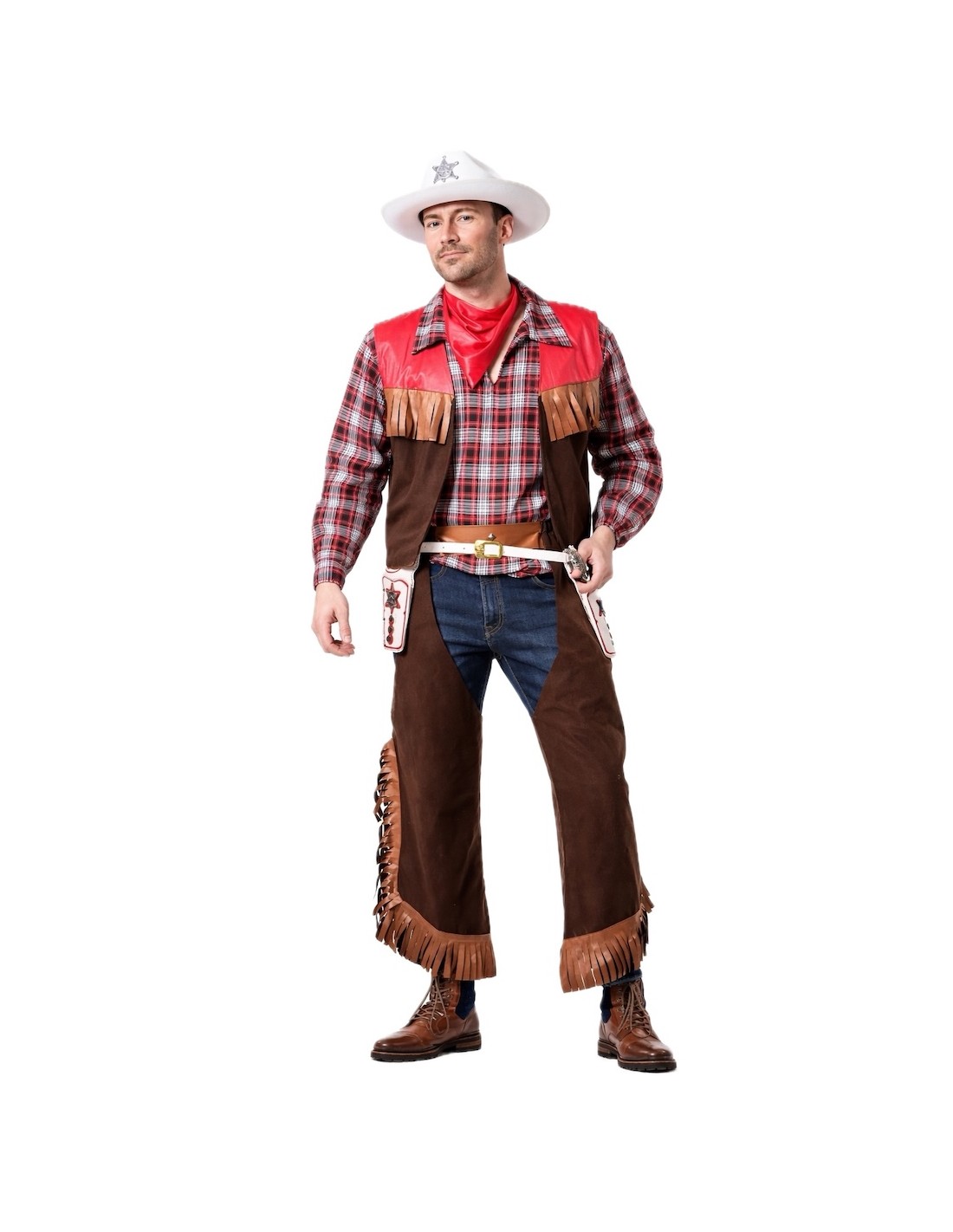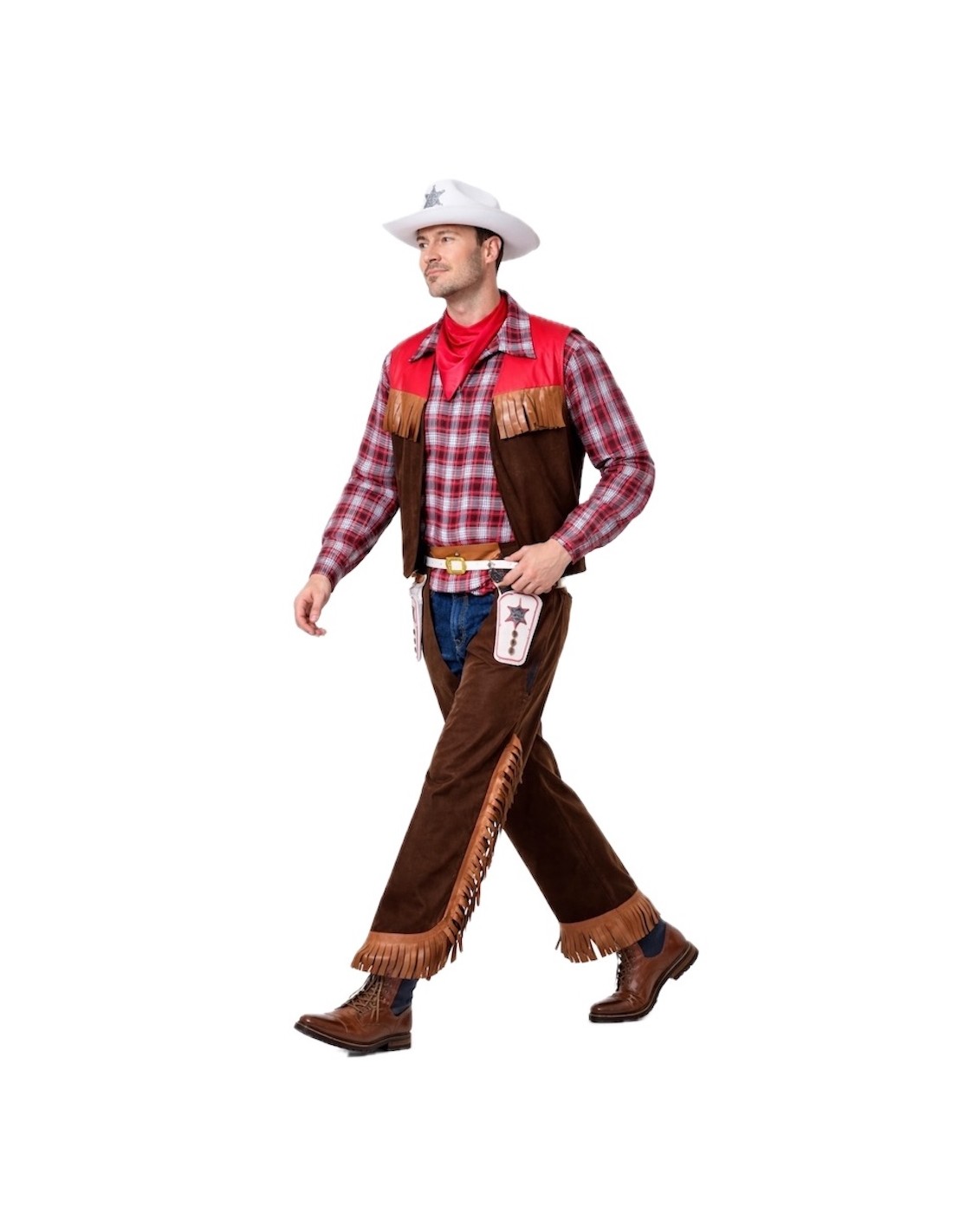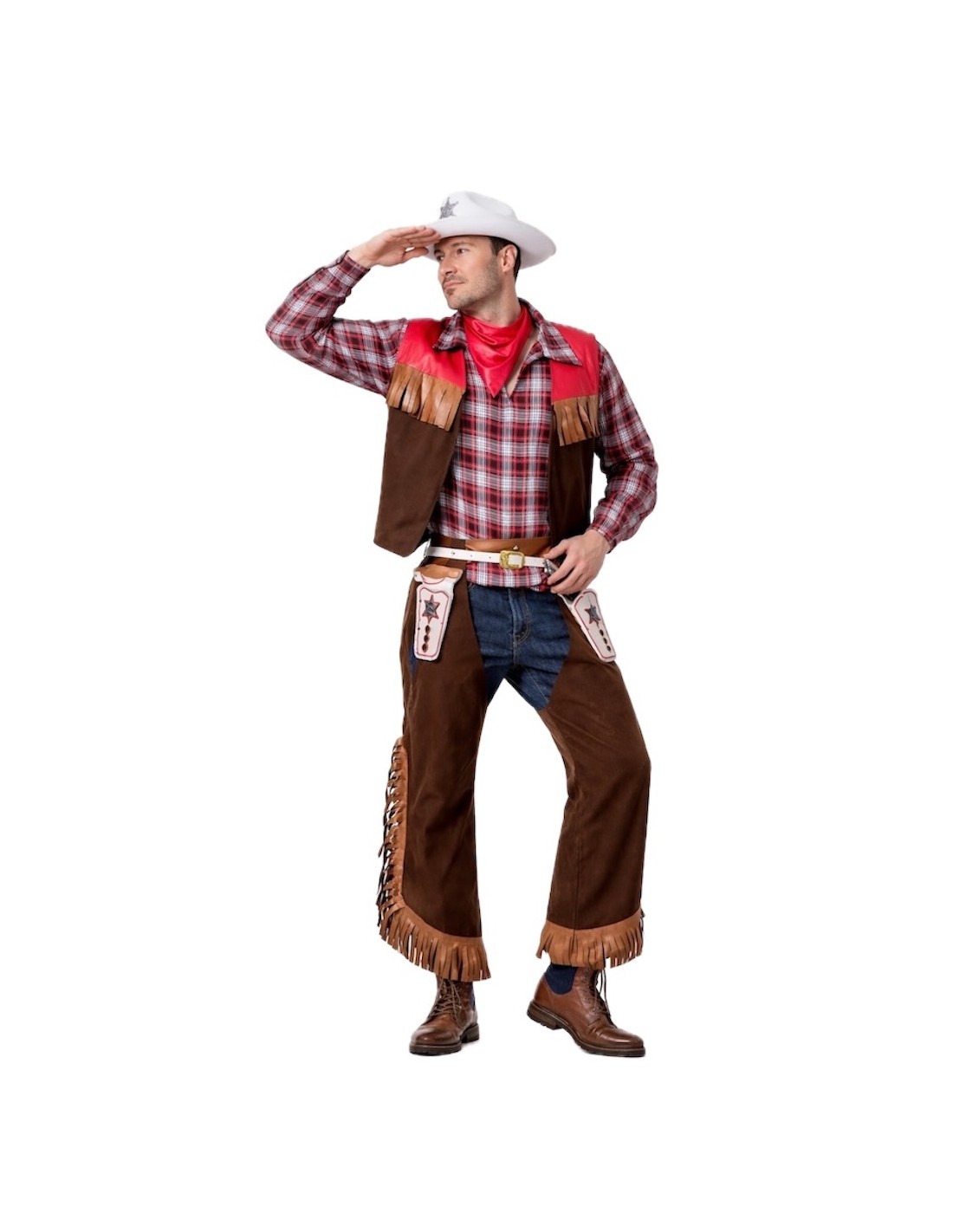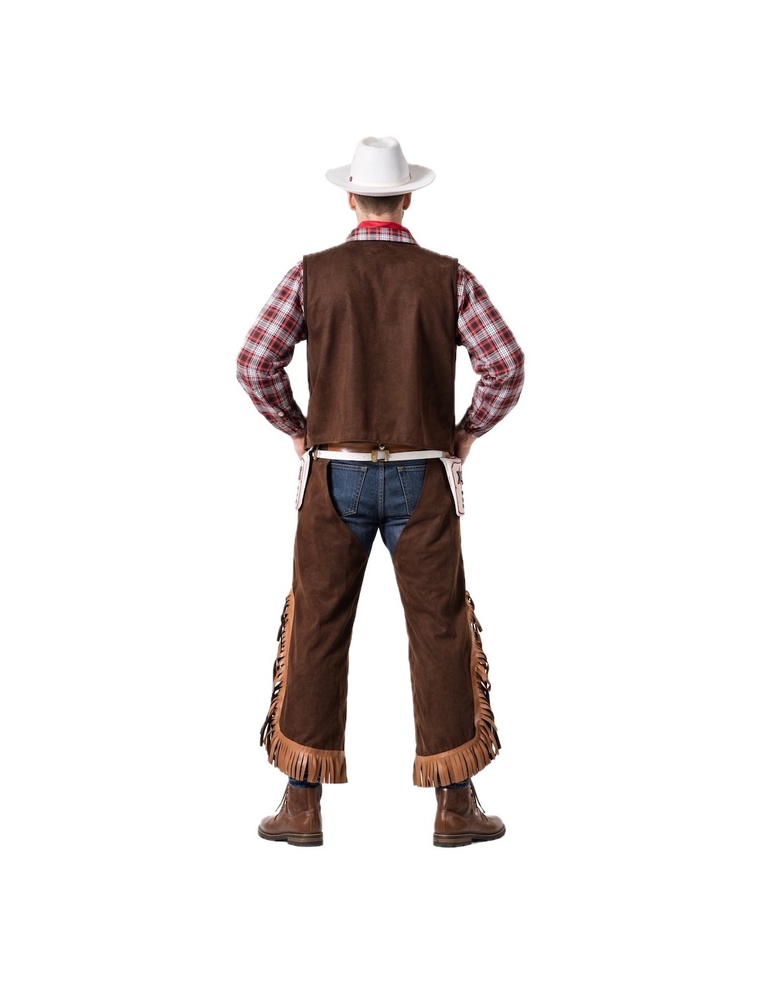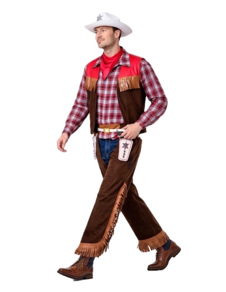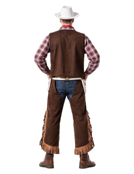 Déguisement classique western avec chemise en polyester au toucher similaire à une nappe et gilet intégré qui simule deux pièces. Le gilet combine du polyester peau de pêche et un doux tricot imitant le cuir rouge, avec des franges renforcées pour plus de poids et de forme. Comprend une ceinture avec élastique et velcro, à partir de laquelle partent deux cartouchières à franges, également en polyester peau de pêche et décorées avec des pièces en plastique qui ressemblent à du métal. Complète l'ensemble un bandana en doux tricot à nouer autour du cou. Confection soignée et tissus confortables avec une finition de qualité.