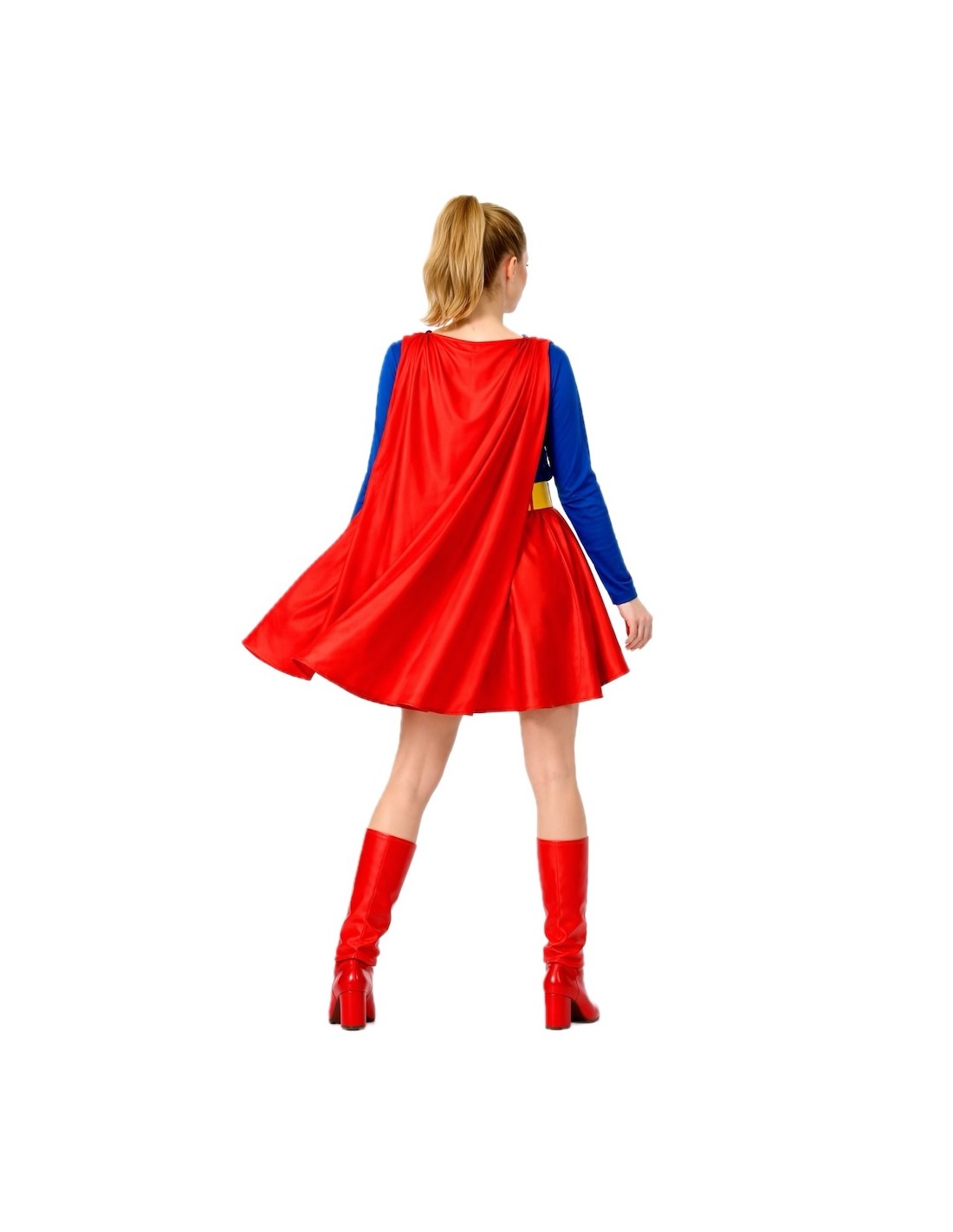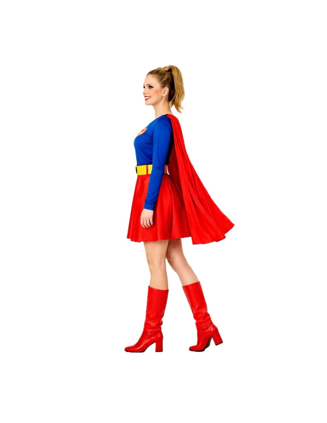 Ce costume classique et élégant se compose d'une robe confectionnée en doux tricot semi-extensible avec fermeture à l'arrière du cou. La partie supérieure est faite de ce matériau, tandis que la jupe est confectionnée en satin doux et dense. Il a une ceinture élastique à la taille et la jupe est plissée pour plus de volume et de mouvement. À partir des épaules, une cape en tricot semi-extensible, maintenue par du velcro. Le costume comprend également une ceinture en polyester rembourré avec fermeture à l'arrière à l'aide de velcro et des chauffe-jambes en satin rembourré pour maintenir leur forme et leur structure, imitant la partie haute des bottes.