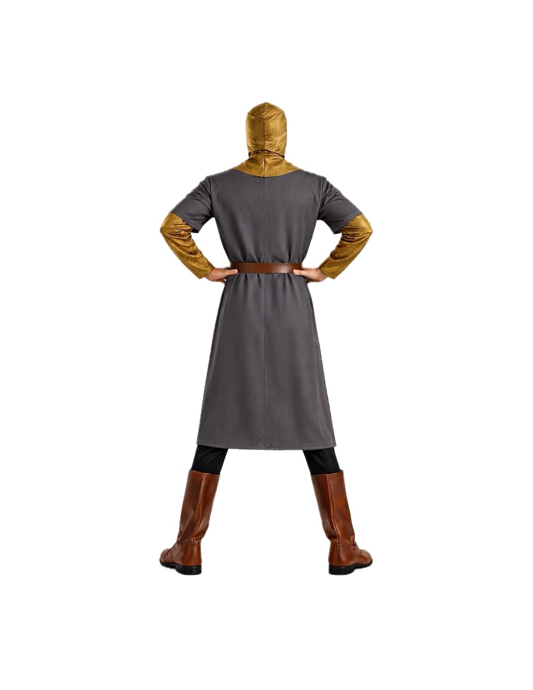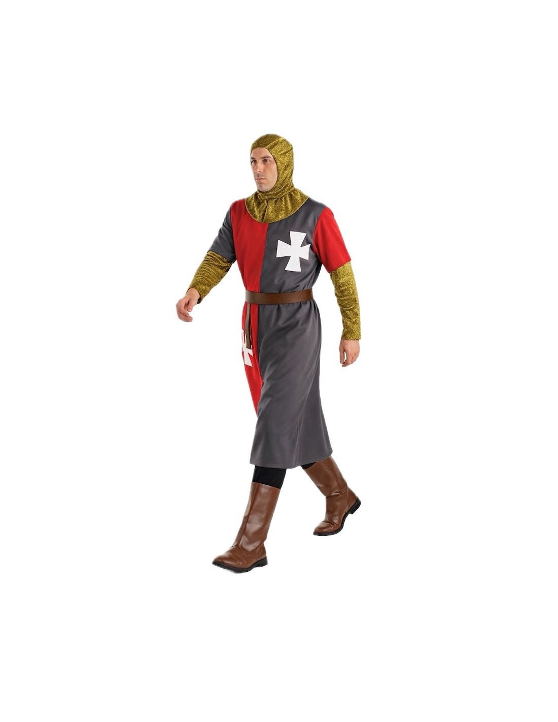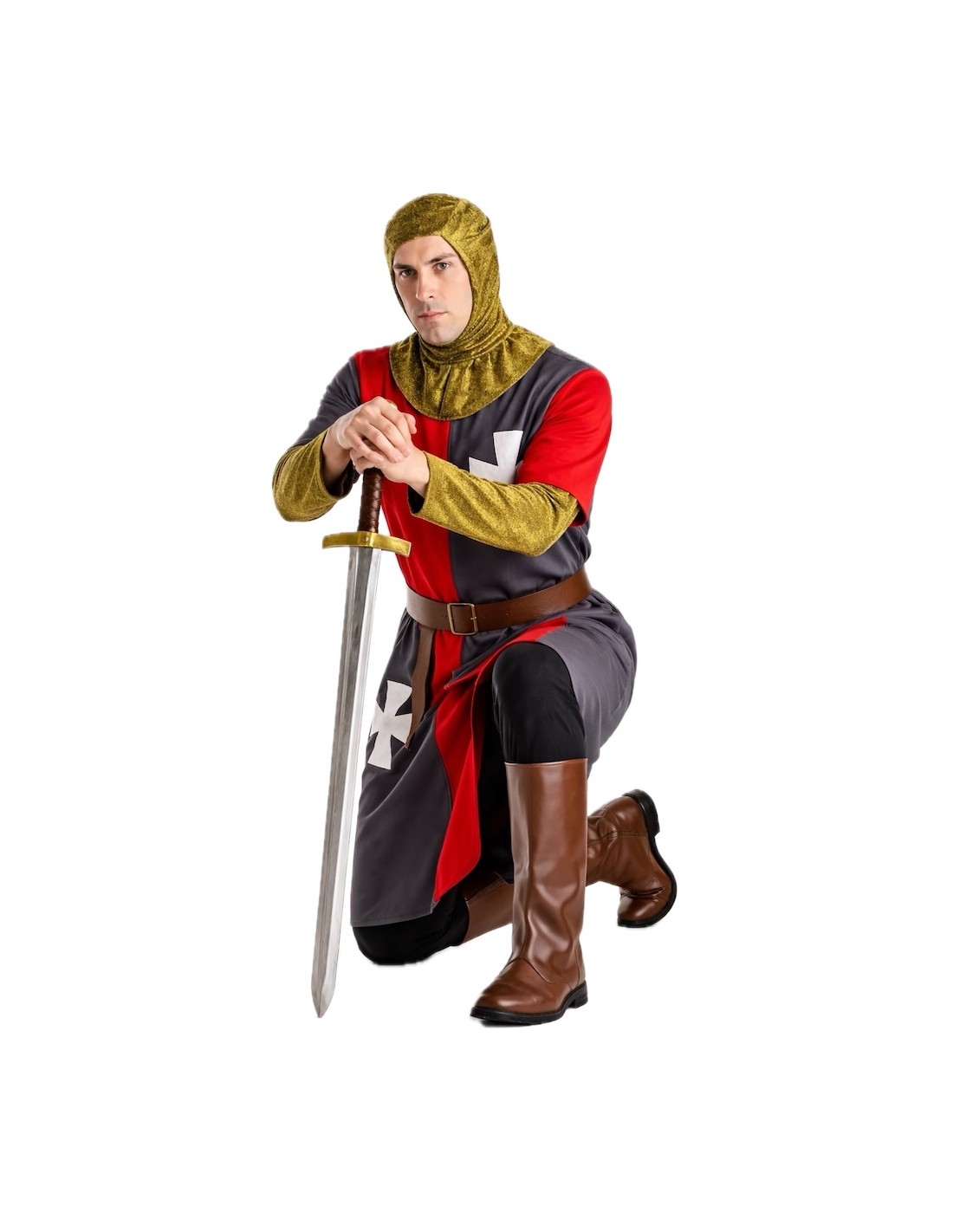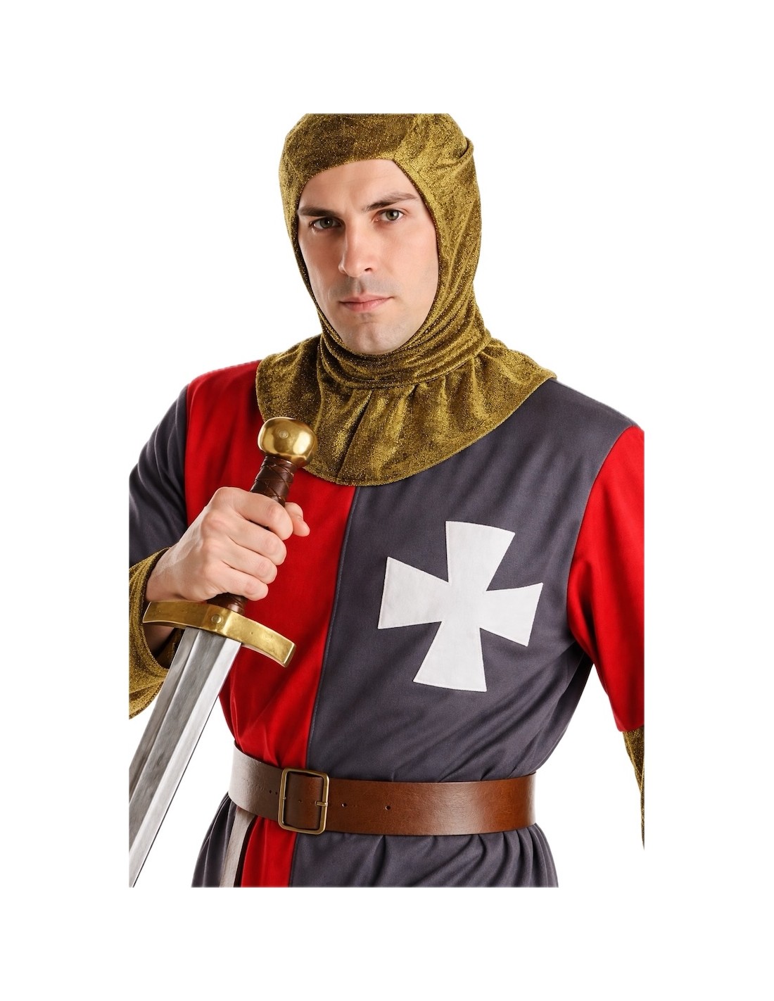 Description du costume médiéval : Il s'agit d'une veste en polyester au toucher doux et velouté, de couleur rouge vif combinée à du gris foncé. Elle comporte deux croix blanches confectionnées dans un tissu dense, cousues de manière précise. De plus, elle comprend une ceinture en polyester imitant le cuir de couleur marron foncé, équipée d'une boucle en plastique. Le costume est complété par un caleçon doré en résille élastique, conçu pour s'harmoniser avec les manches de la veste.