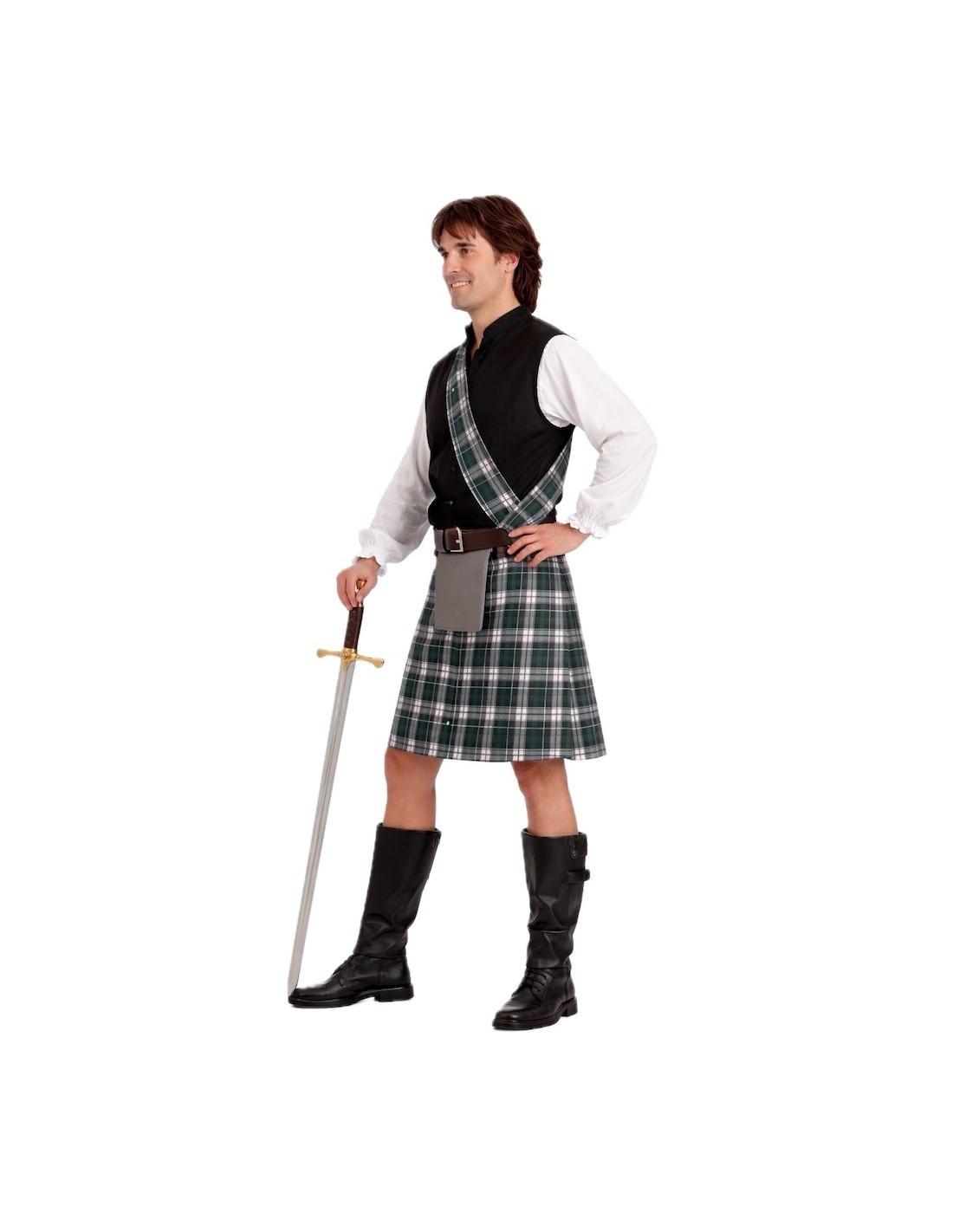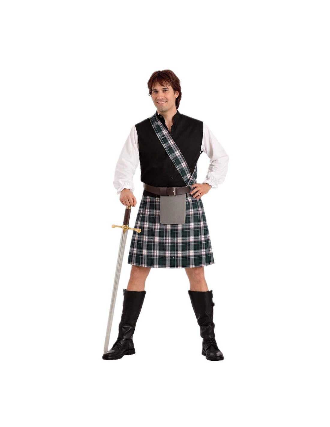 Un costume traditionnel et très complet qui évoque tout le charme du vêtement typique écossais. Il comprend une chemise en polyester doux avec du caoutchouc et de la dentelle aux poignets, accompagnée d'un mouchoir assorti pour le cou, ajustable avec du velcro. La caractéristique jupe écossaise en doux drap est dotée de caoutchouc à la taille, d'une pièce frontale et d'une petite poche intérieure. Le vêtement est complété par une écharpe croisée du même tissu, fixée à l'épaule avec du velcro pour plus de confort. L'ensemble comprend également le typique béret écossais ou tam, fabriqué en drap et froncé dans le style le plus authentique, ainsi que le classique sporan ou sporran, structuré sur une base en TNT et au toucher velouté. Un déguisement de grande qualité, confortable et très réaliste, idéal pour les fêtes, défilés ou représentations.