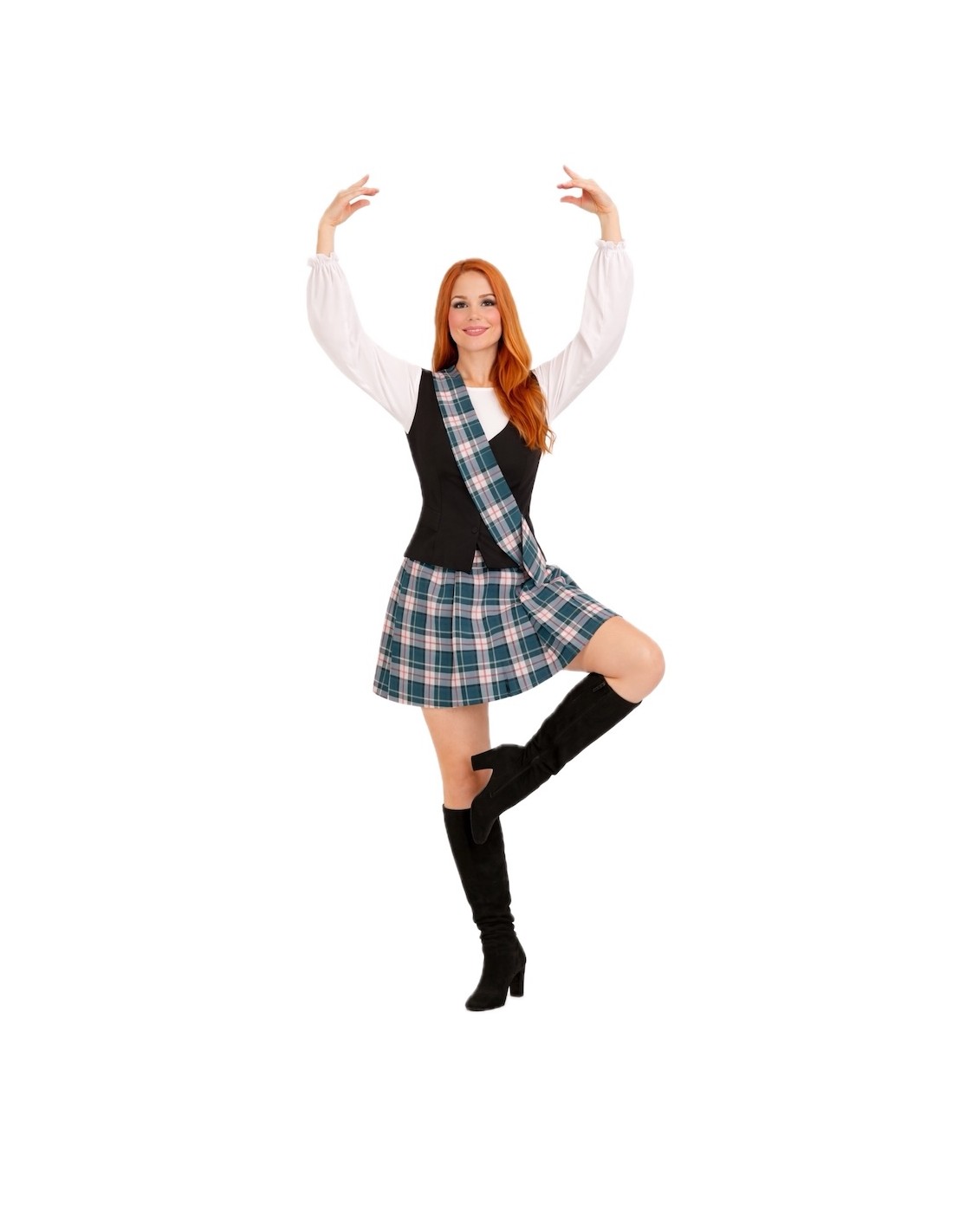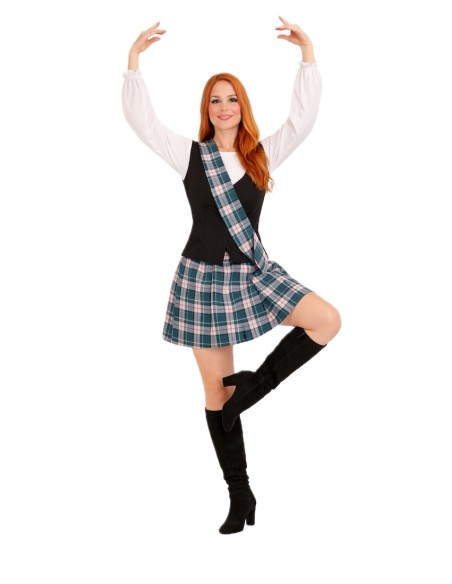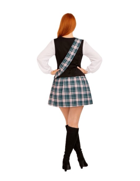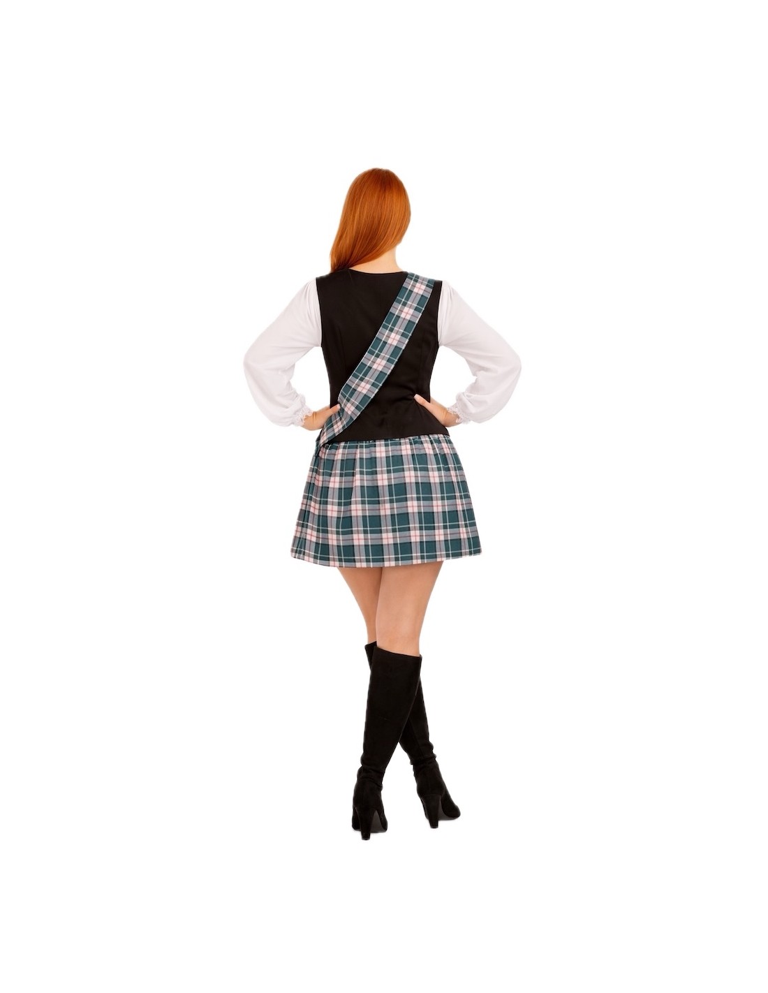 Un ensemble charmant et complet qui allie tradition et confort. Il comprend une chemise avec un gilet intégré en doux tricot semi-élastique, avec des élastiques aux poignets et dans le dos à la taille pour un ajustement parfait, une fermeture à velcro et de délicats détails en dentelle et rubans rouges en zigzag. La jupe, en tissu type laine avec un motif écossais classique et une fente à l'avant, a un tablier intégré et une poche interne. Il est complété par une ceinture à fermeture velcro, une jolie casquette froncée et un petit sac au toucher pêche velouté. Idéal pour des fêtes à thème, des carnavals ou des défilés.