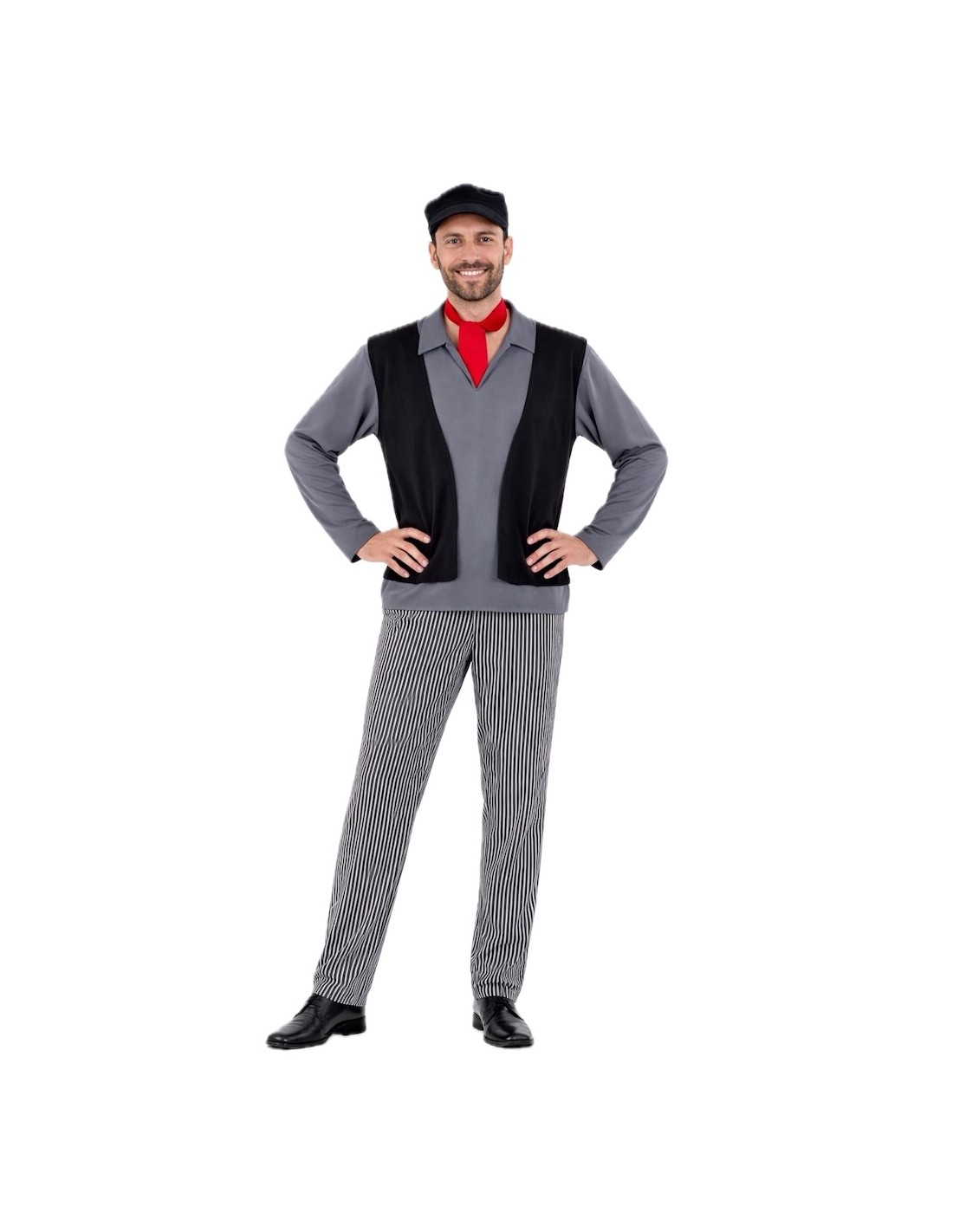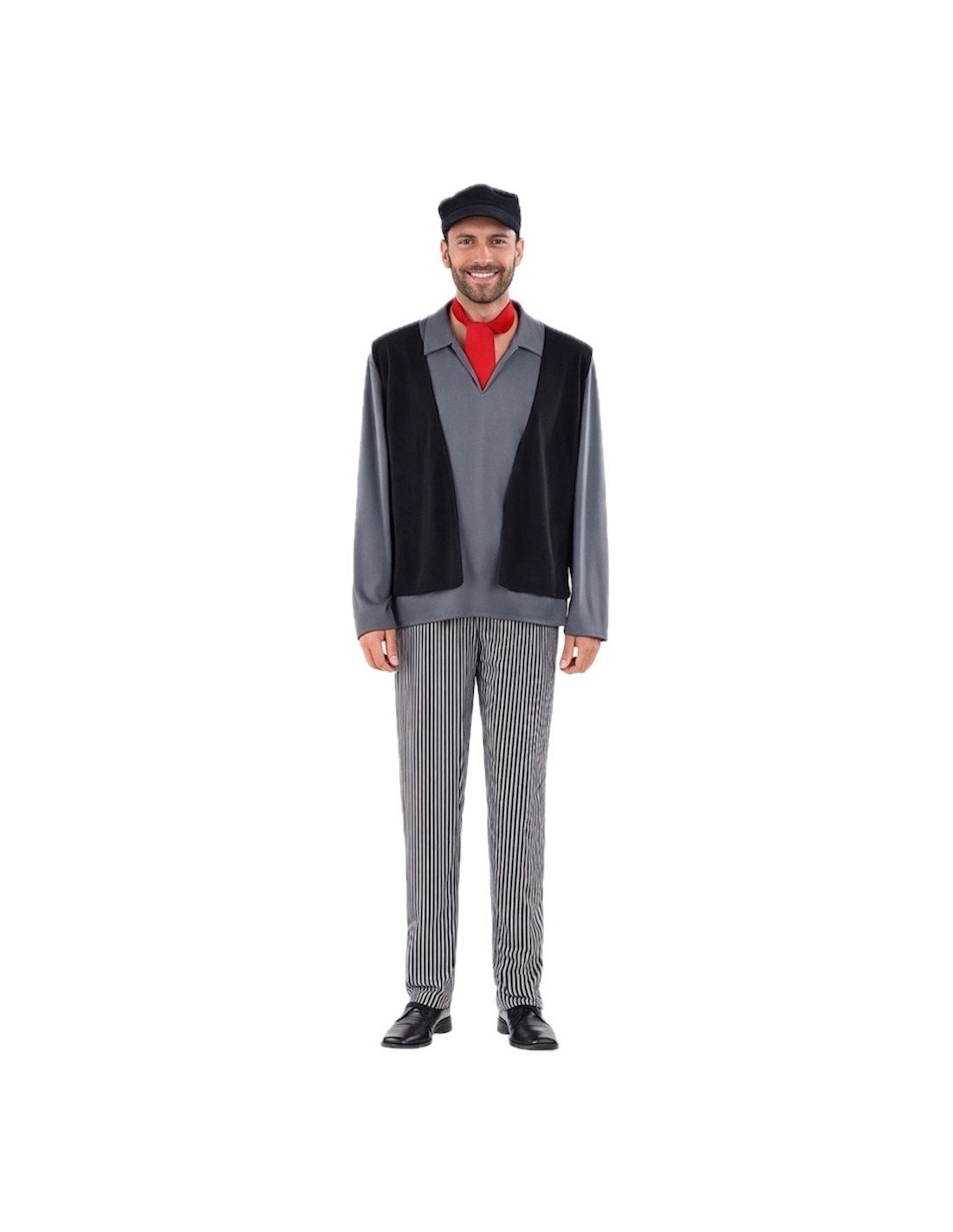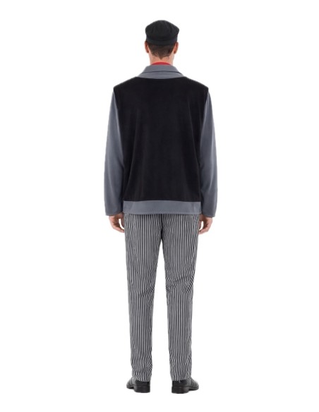 Costume complet de ramoneur avec un t-shirt en maille douce semi-élastique et un gilet intégré en tissu molletonné, donnant l'effet de deux vêtements en un. Pantalon assorti avec élastique à la taille pour plus de confort et petite poche intérieure. Comprend un foulard au cou et une casquette, tous deux en toucher molletonné ; la casquette est froncée avec une visière moelleuse pour maintenir sa forme. Un ensemble confortable et plein de détails pour un look authentique.