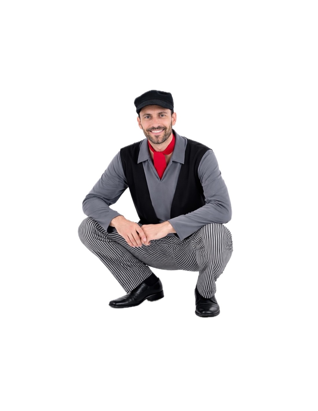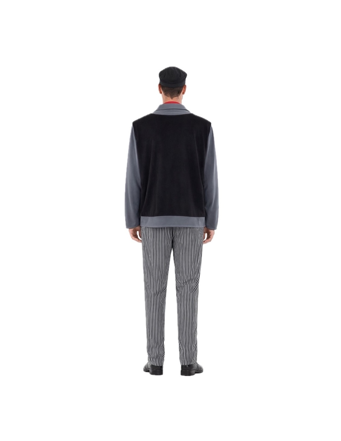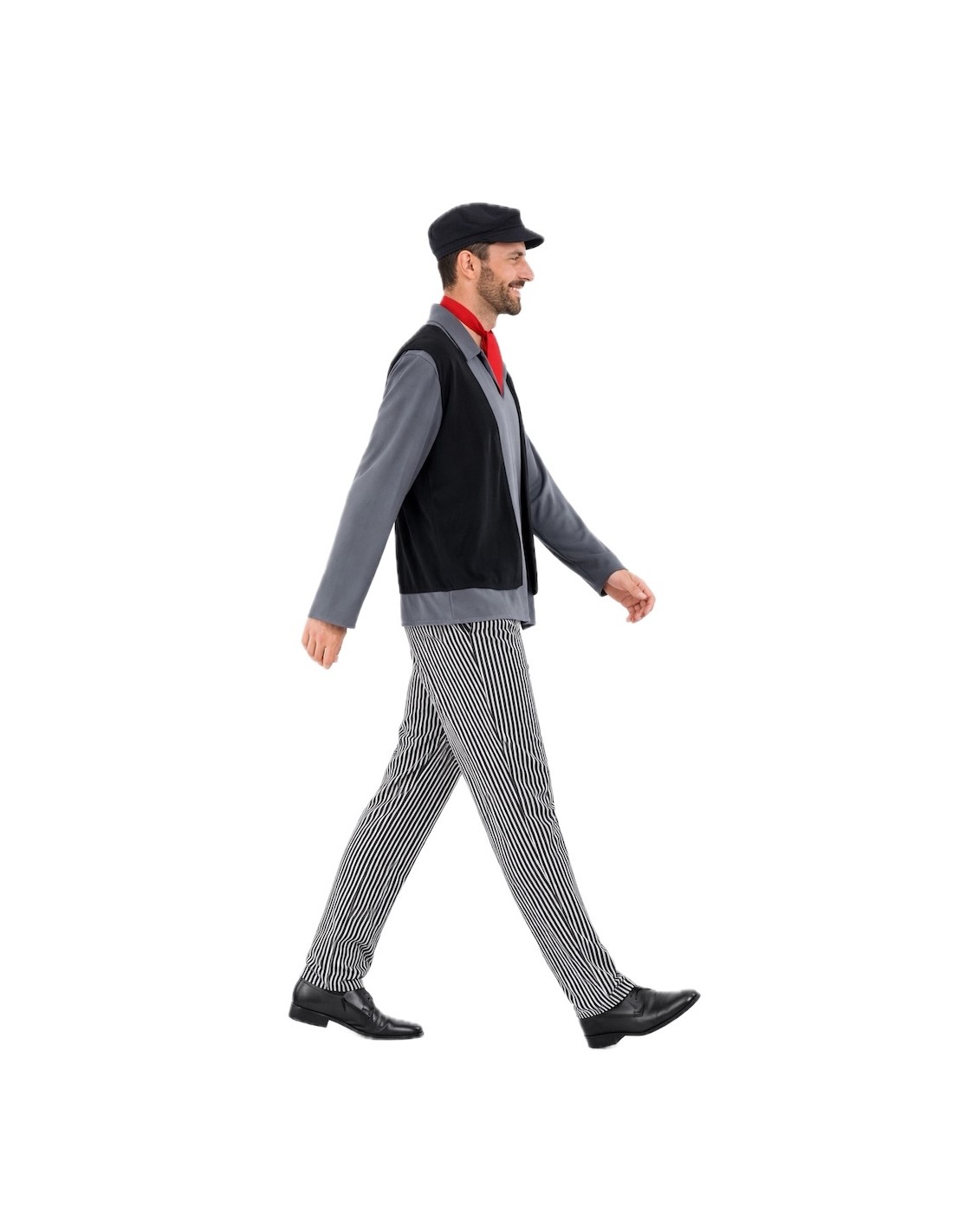 Costume complet de ramoneur avec un t-shirt en maille douce semi-élastique et un gilet intégré en tissu molletonné, donnant l'effet de deux vêtements en un. Pantalon assorti avec élastique à la taille pour plus de confort et petite poche intérieure. Comprend un foulard au cou et une casquette, tous deux en toucher molletonné ; la casquette est froncée avec une visière moelleuse pour maintenir sa forme. Un ensemble confortable et plein de détails pour un look authentique.