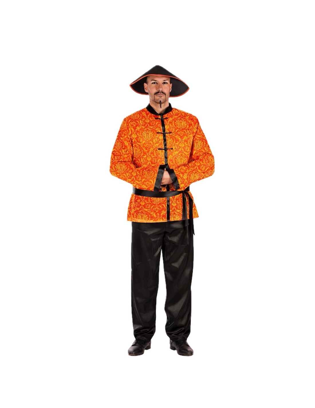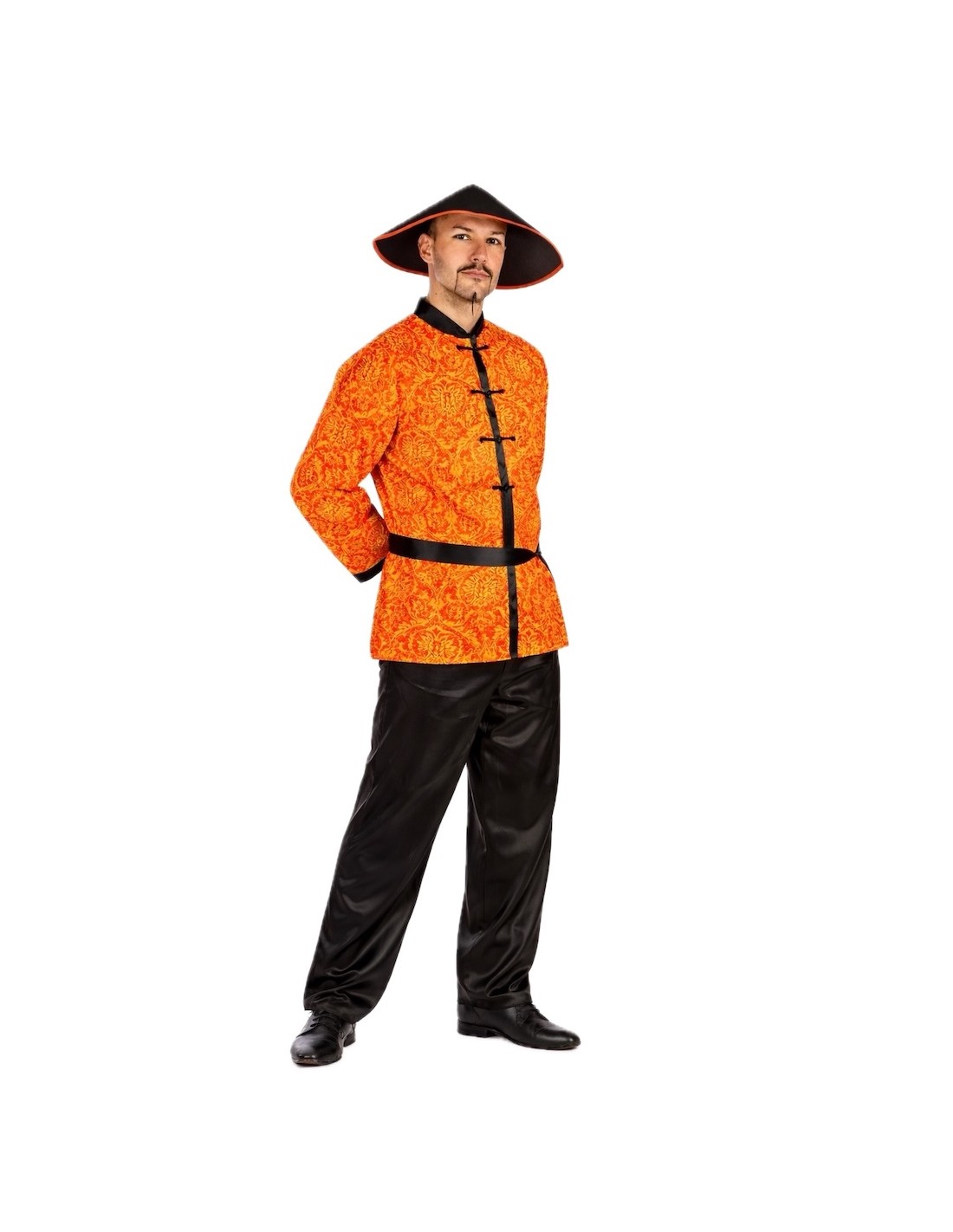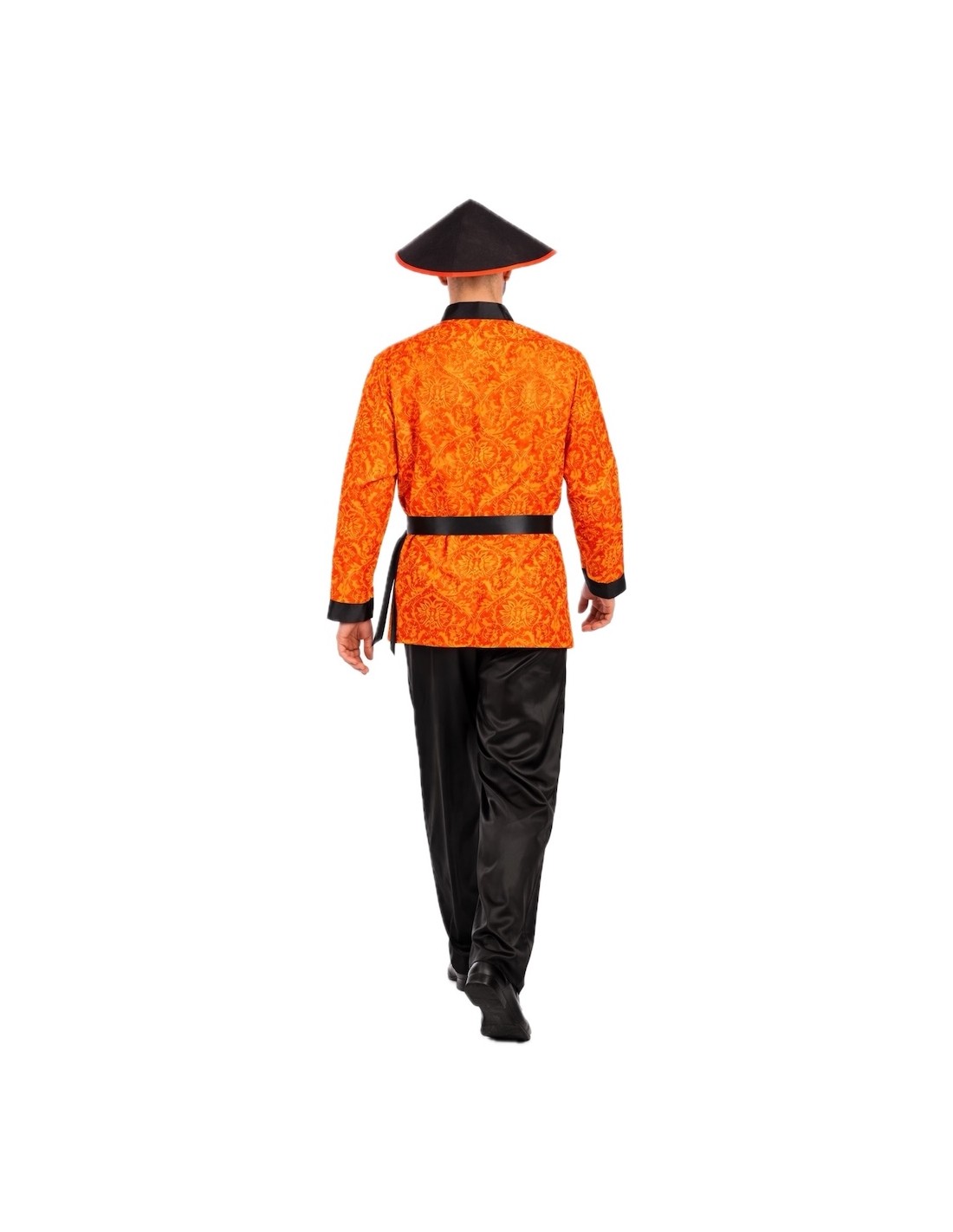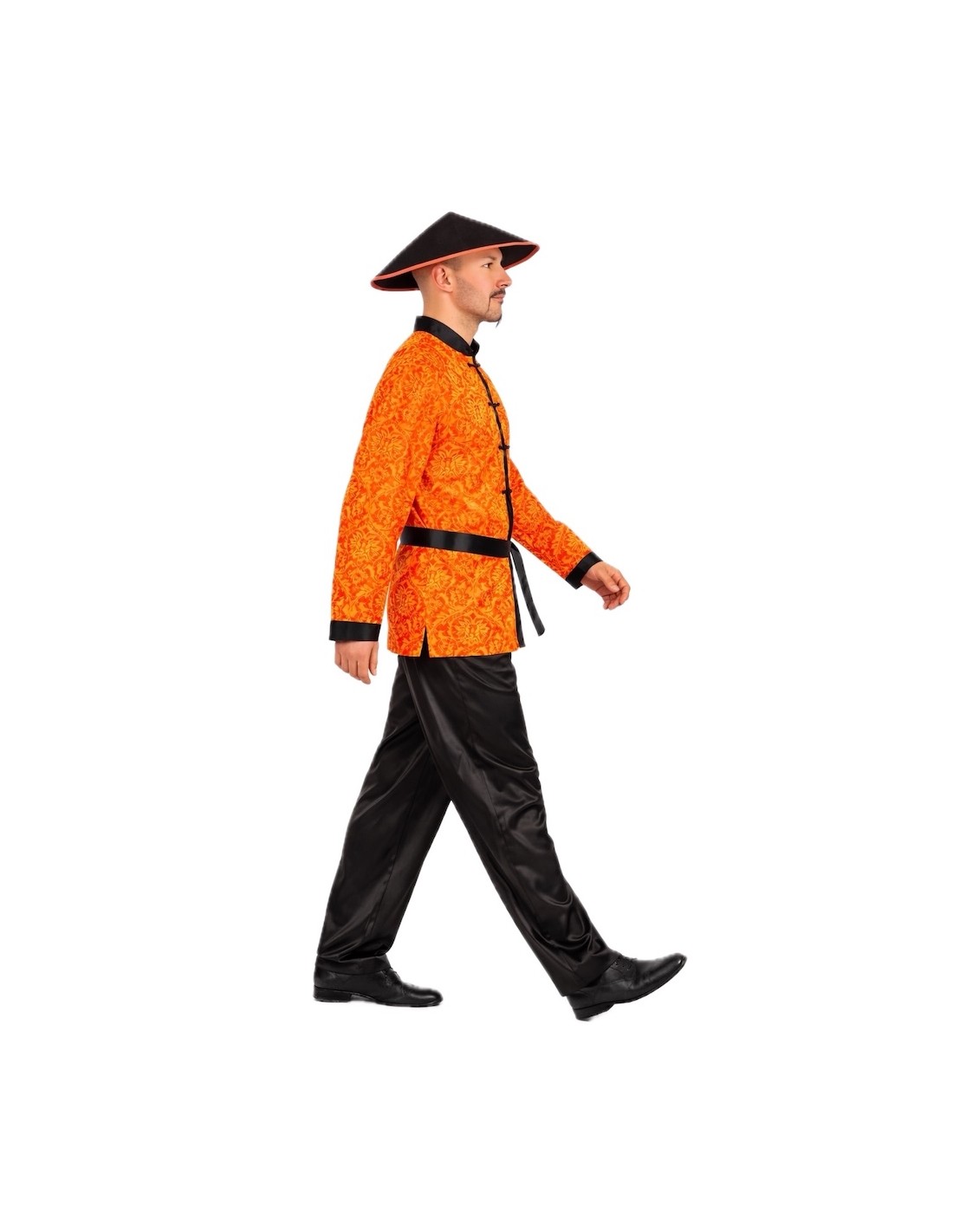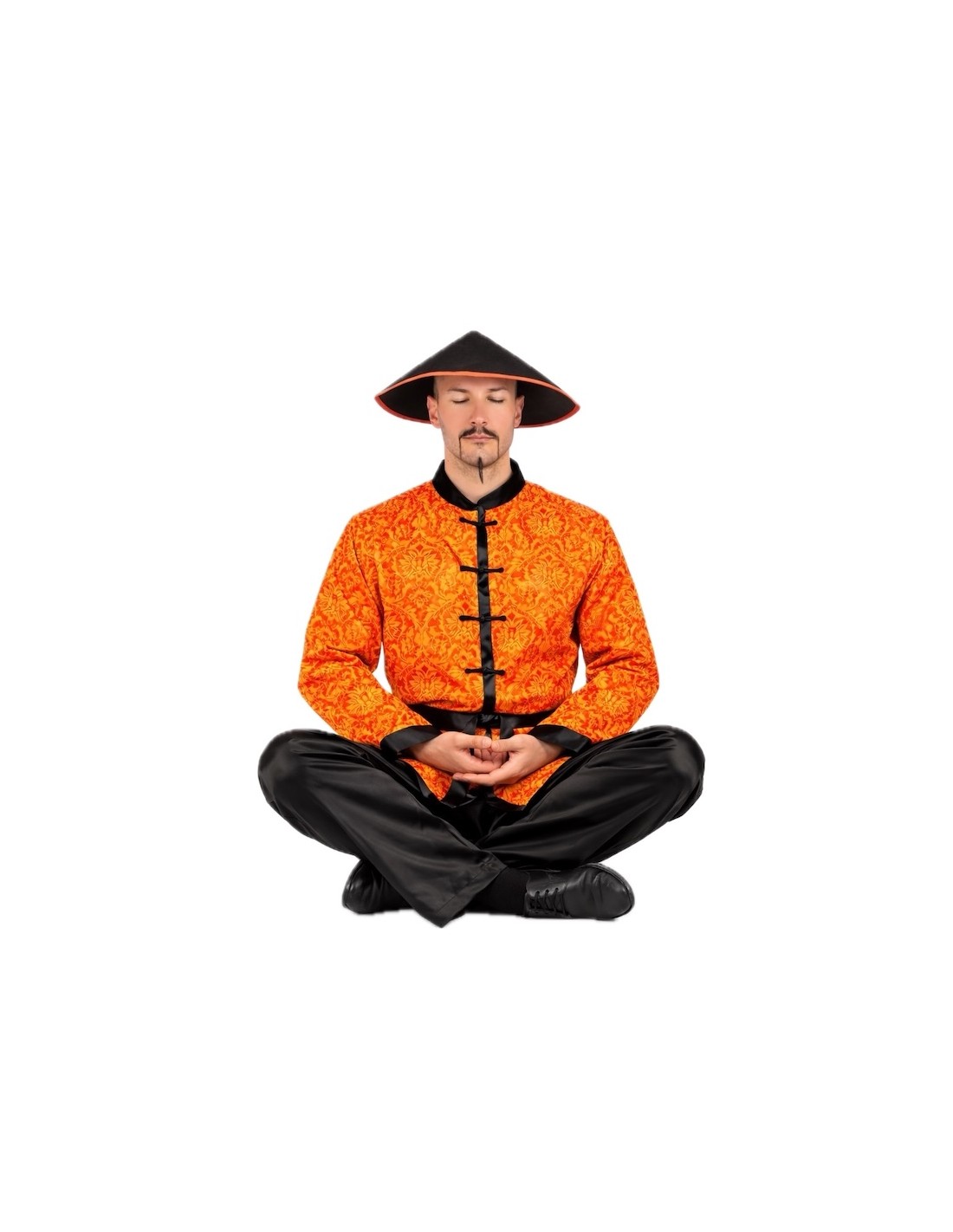 Ensemble inspiré du classique costume chinois, composé d'une chemise en satin doux avec un design de type tangzhuang, imitant la fermeture typique et le col mao. Elle se ferme confortablement avec du velcro à l'arrière du col. Le pantalon, confectionné dans le même matériau, possède une taille élastique et une petite poche intérieure. L'ensemble est complété par le chapeau chinois traditionnel, rembourré et équipé d'un bandeau intérieur pour assurer un ajustement ferme, confortable et éviter qu'il ne tombe. Enfin, il comprend une ceinture en satin, de la même couleur que le pantalon. Authentique et plein de charme oriental !