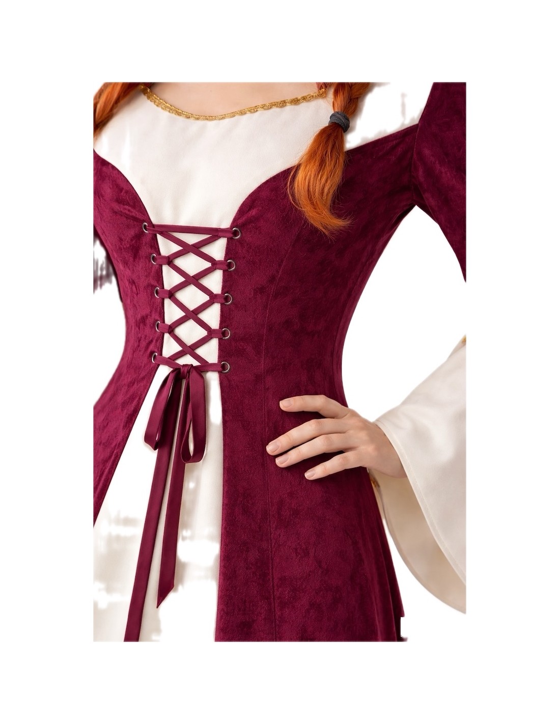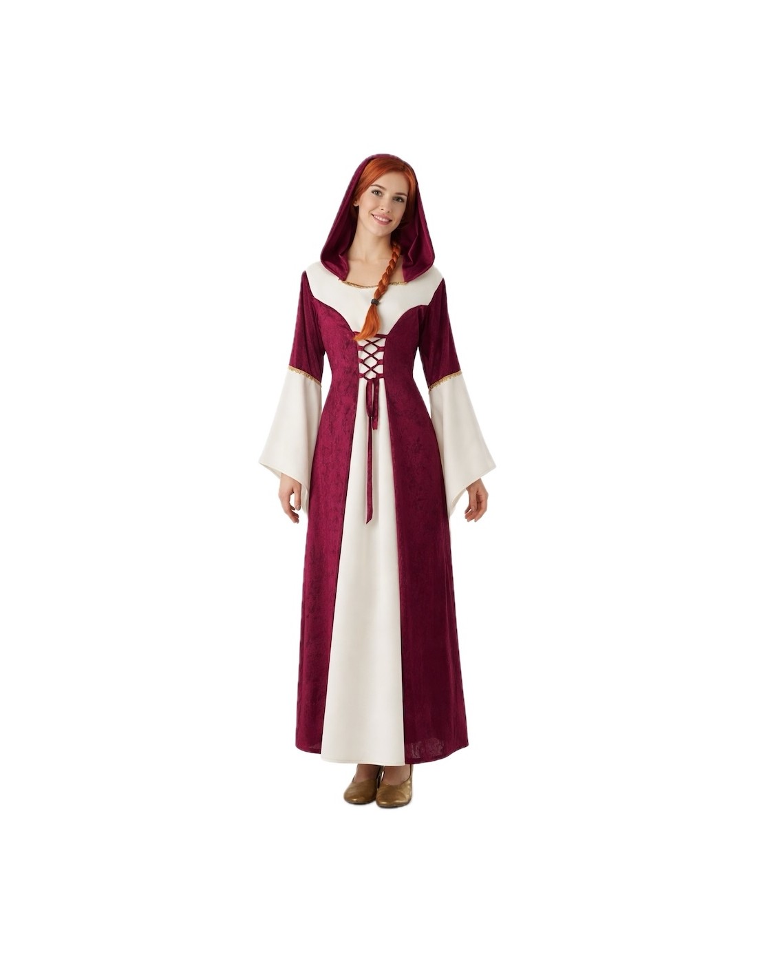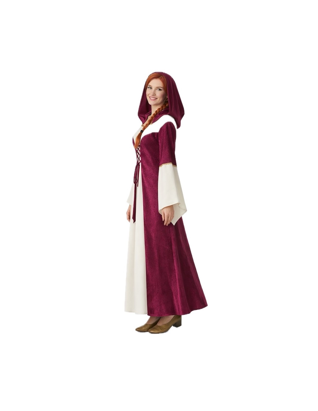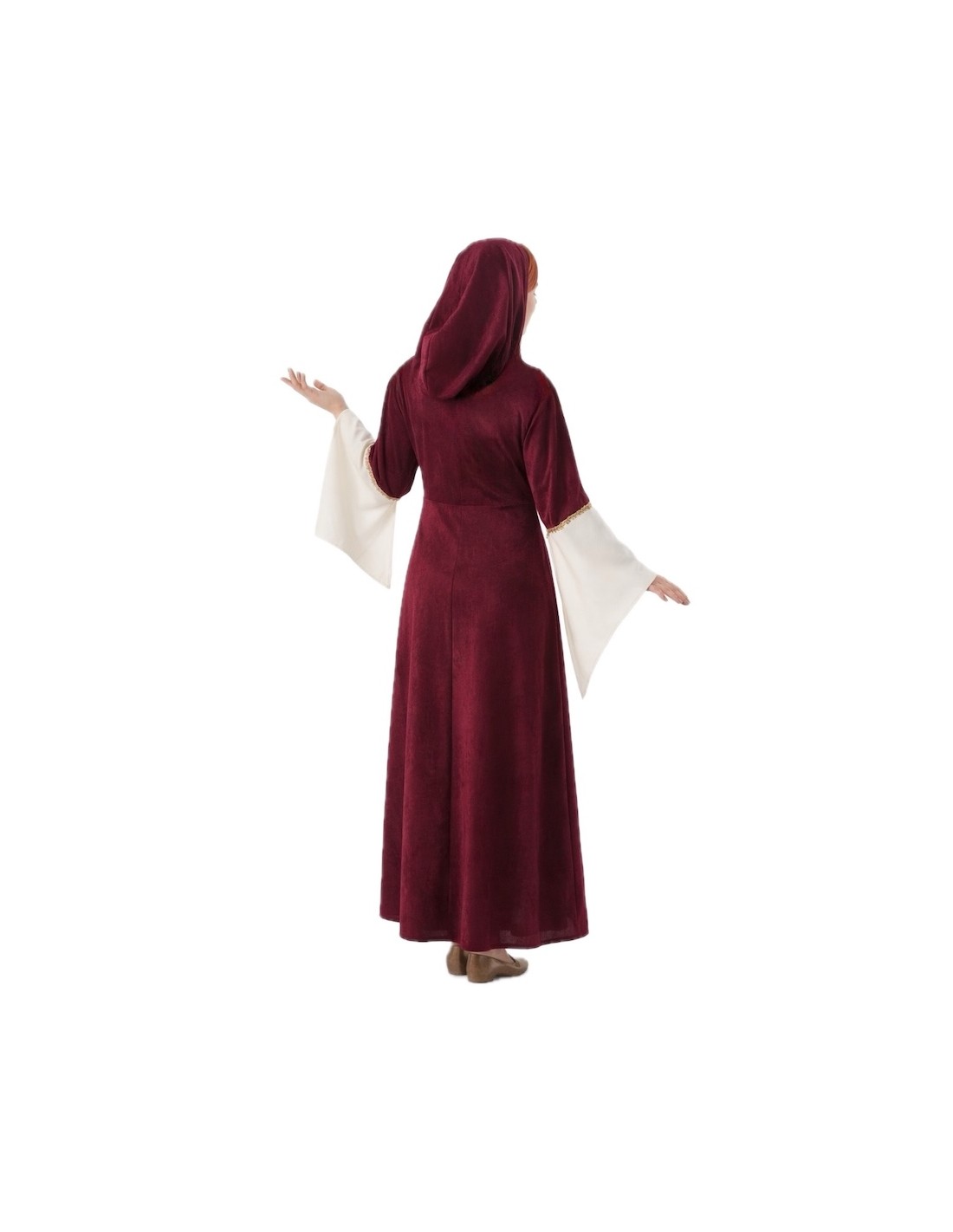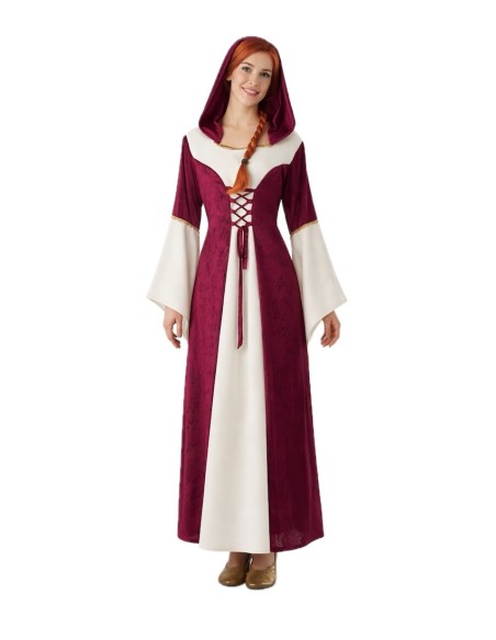 Il s'agit d'une belle robe longue confectionnée en polyester épais, sur laquelle a été superposée une douce cape en velours de couleur vin. Cette technique crée l'illusion de deux vêtements, mais il s'agit en réalité d'un seul, offrant ainsi une plus grande liberté de mouvement et de confort. La robe est ajustée au corps grâce à un laçage au niveau du torse, un élément caractéristique de l'époque. Un capuchon confectionné dans le même tissu et de la même couleur que la cape accompagne le vêtement, et la décoration présente à la fois sur les manches et le col consiste en une élégante passementerie dorée.